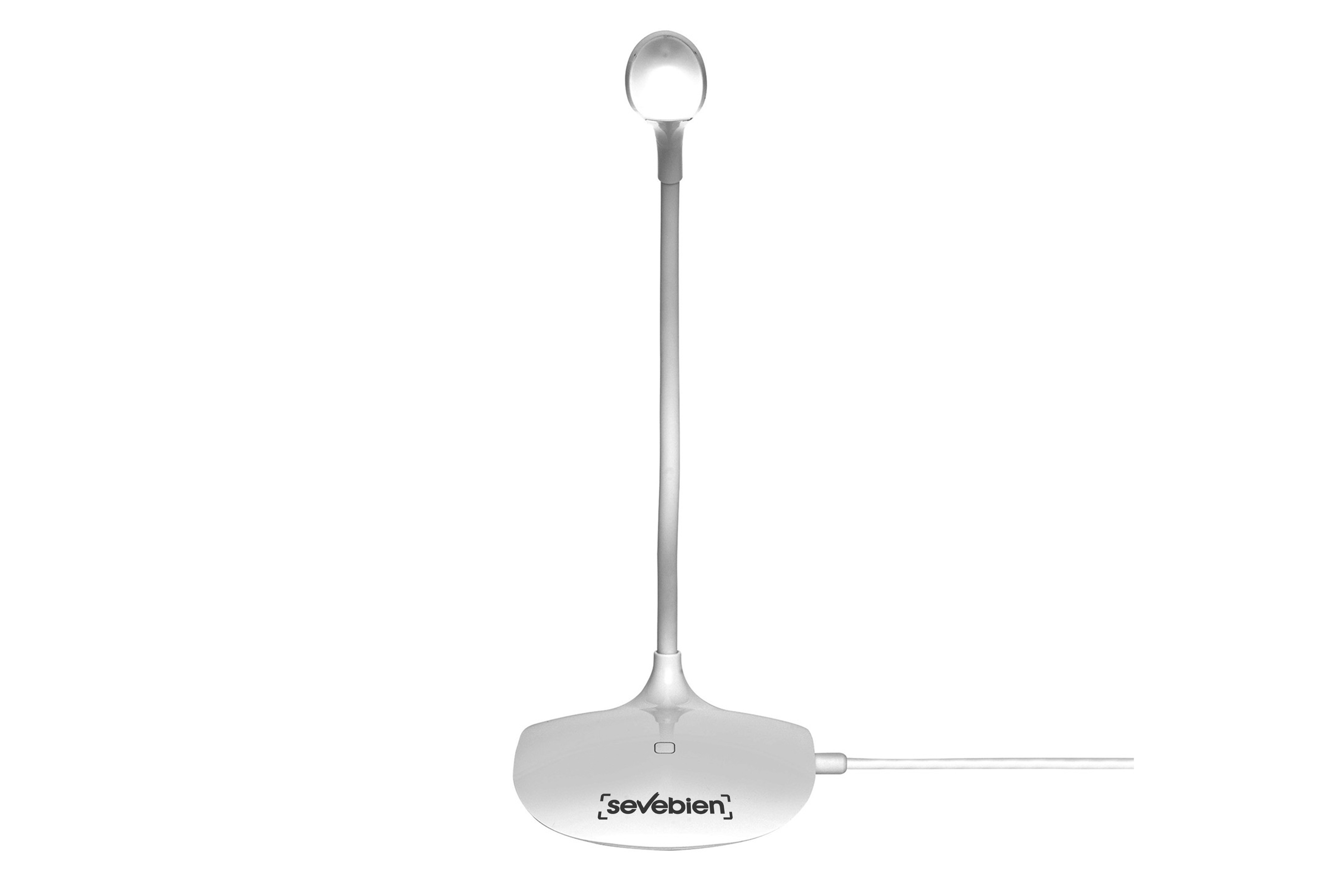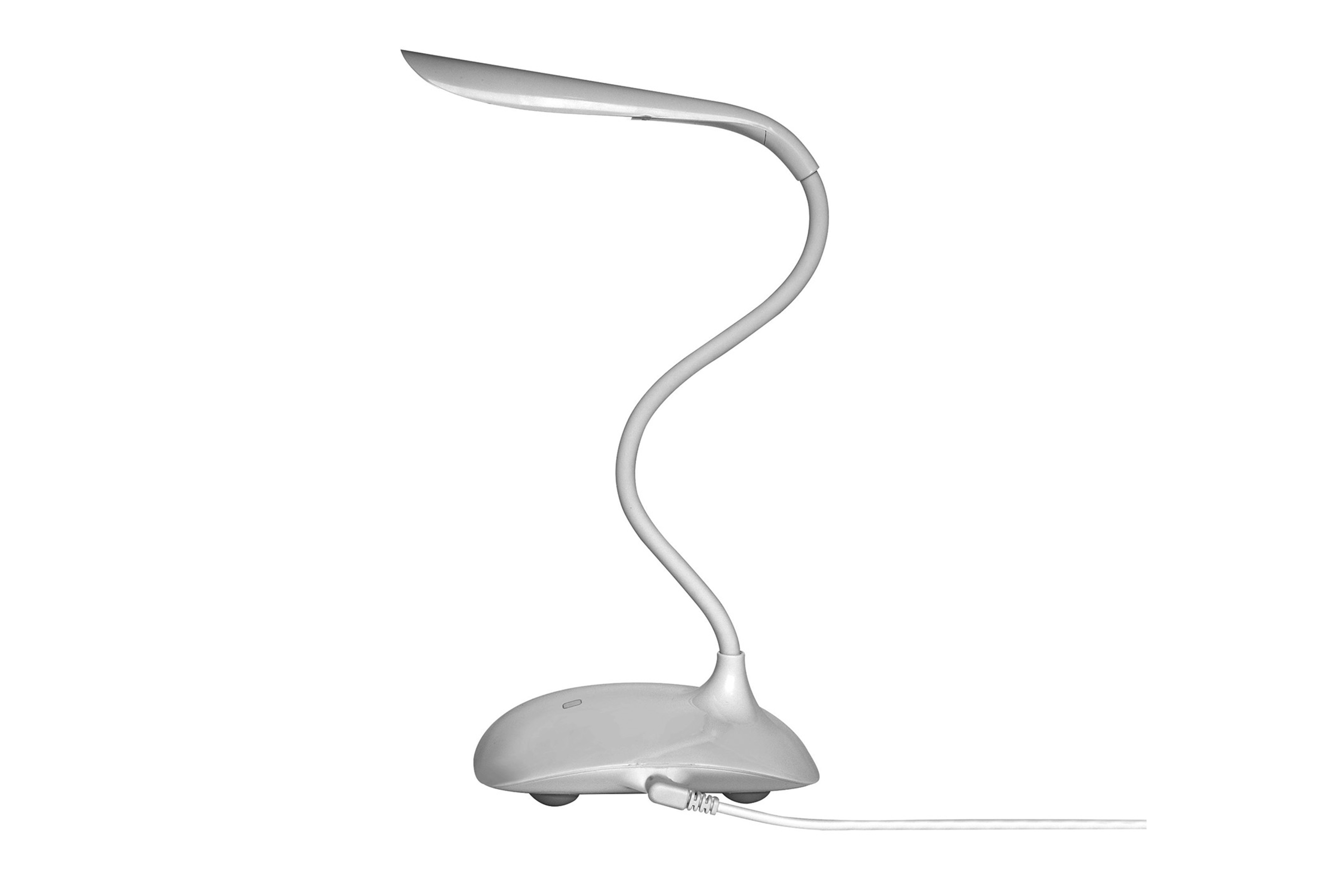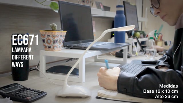 Plástico. Base 12 x 10 cm. Alto 26 cm. Luz LED direccionable y flexible. 3 niveles de iluminación. Encendido táctil. Cable USB. Presentación en caja de regalo.