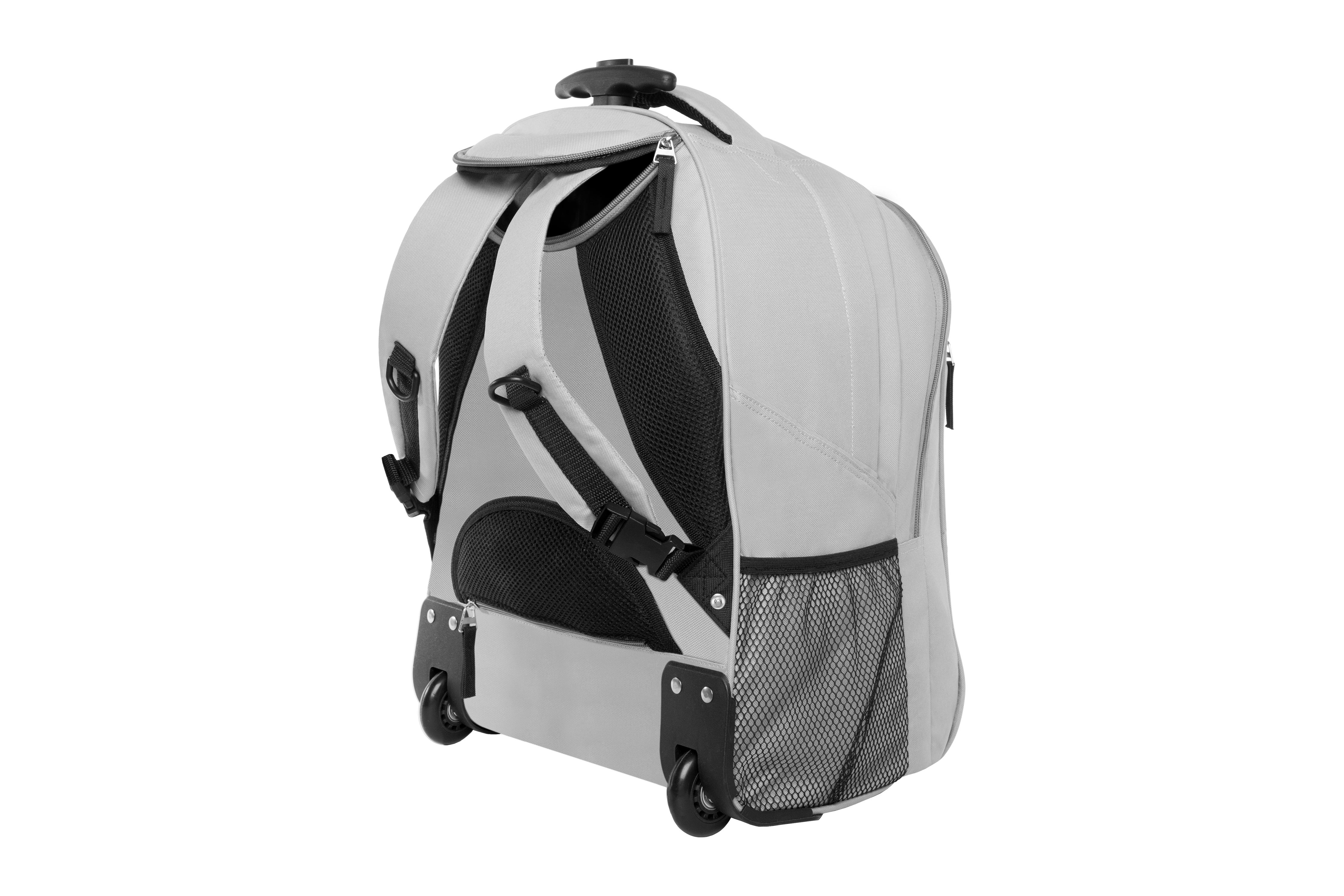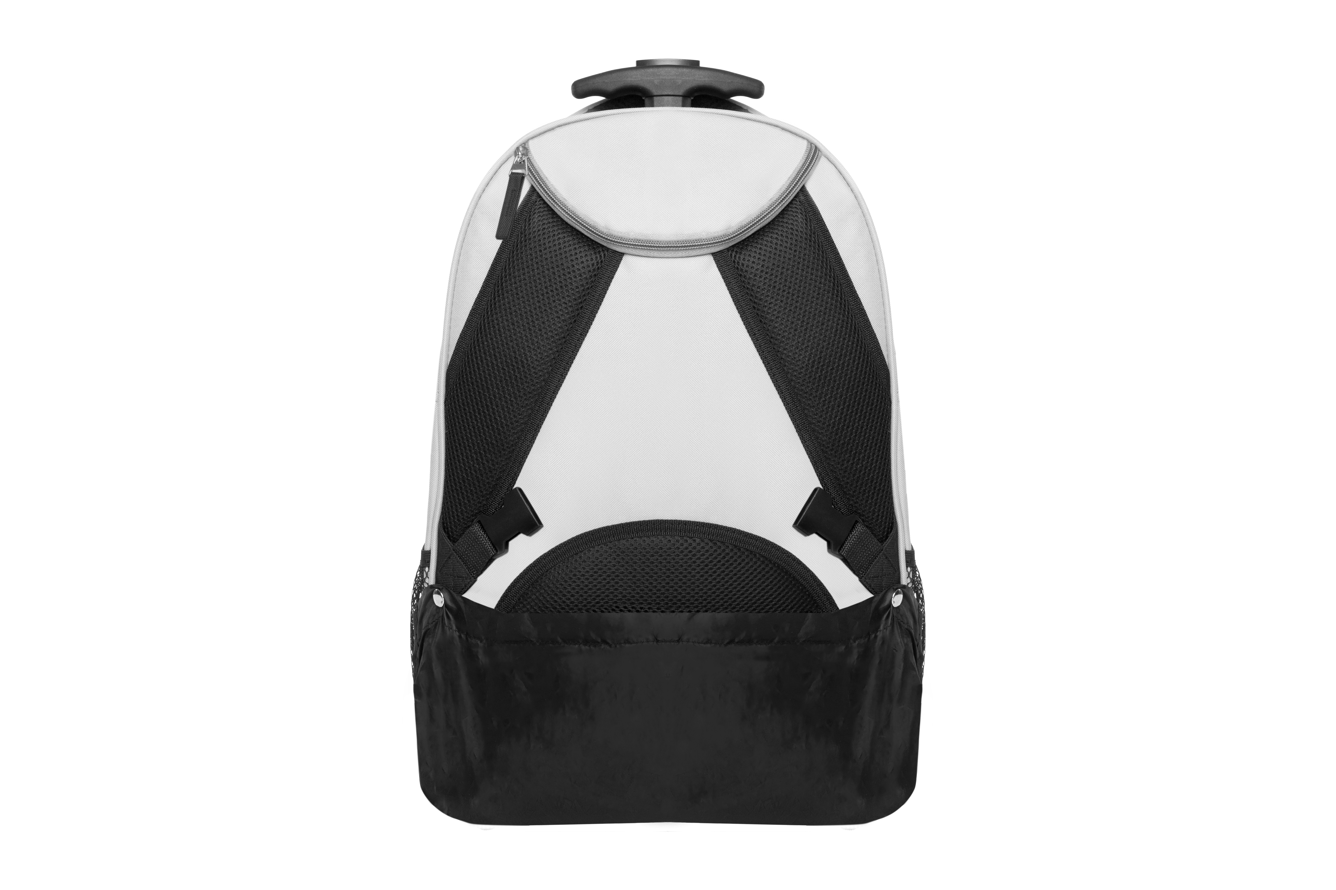 55 x 34,5 x 20 cm. Capacidad 37 litros. Polyester. Morral/Carrion. Mango extensible hasta 52 cm. Un bolsillo frontal con cierre y dos bolsillos laterales de red. Dos compartimentos: el principal con un bolsillo porta laptop; el segundo con dos porta bolígrafo, porta tarjeta y bolsillo pequeño. En la parte de atrás un bolsillo que permite guardar las correas y un bolsillo pequeño acolchado en la parte inferior que contiene un cobertor para cubrir las ruedas. Los compartimentos principales llevan doble cierre con herrajes metálicos y tiras negras. La espalda es acolchada y con red que permite la aireación de la espalda.