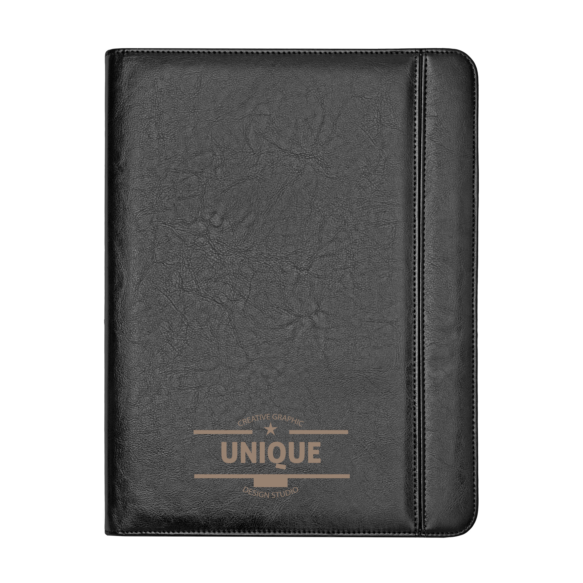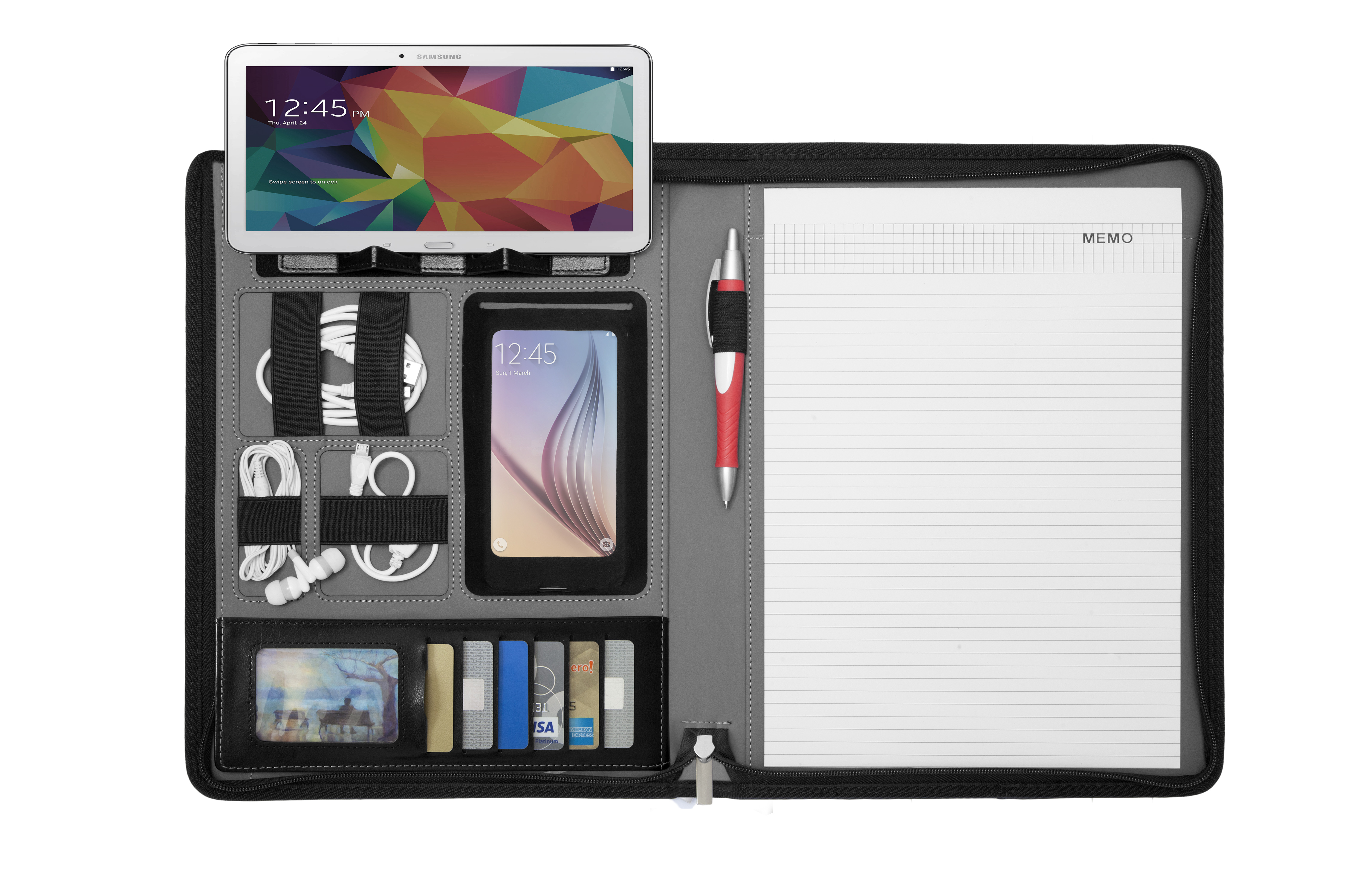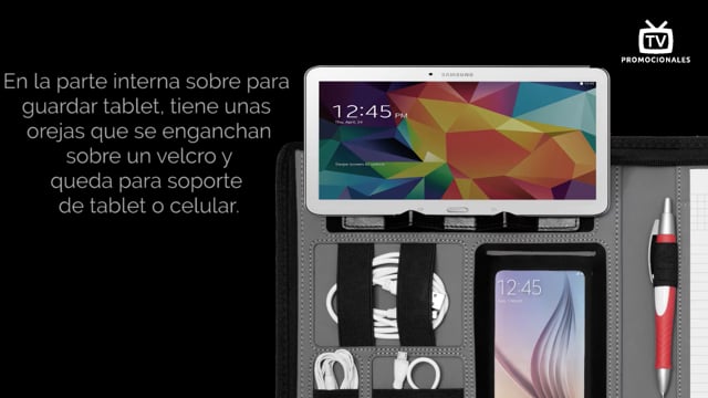Símil cuero. 33,5 x 26,5 x 3 cm. (cerrada). Bolsillo en la parte exterior. En la parte interna cuenta con sobre para guardar tablet, soporte con velcro para tablet o celular. Porta celular, compartimento para tarjetas o documentos y tres compartimentos para guardar cables y audífono. Porta bolígrafo. Block de hojas lisas. Cierre con tirador metálico.