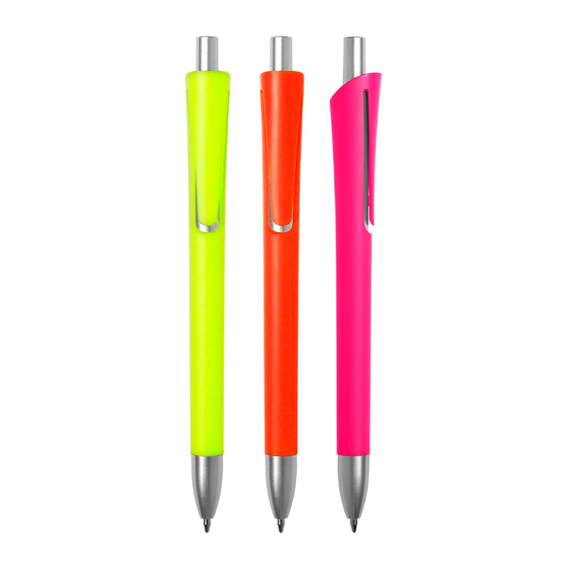 Plástico. Colores fluo. Cuerpo de color mate y detalles de color plata debajo del clip, pulsador y puntera.