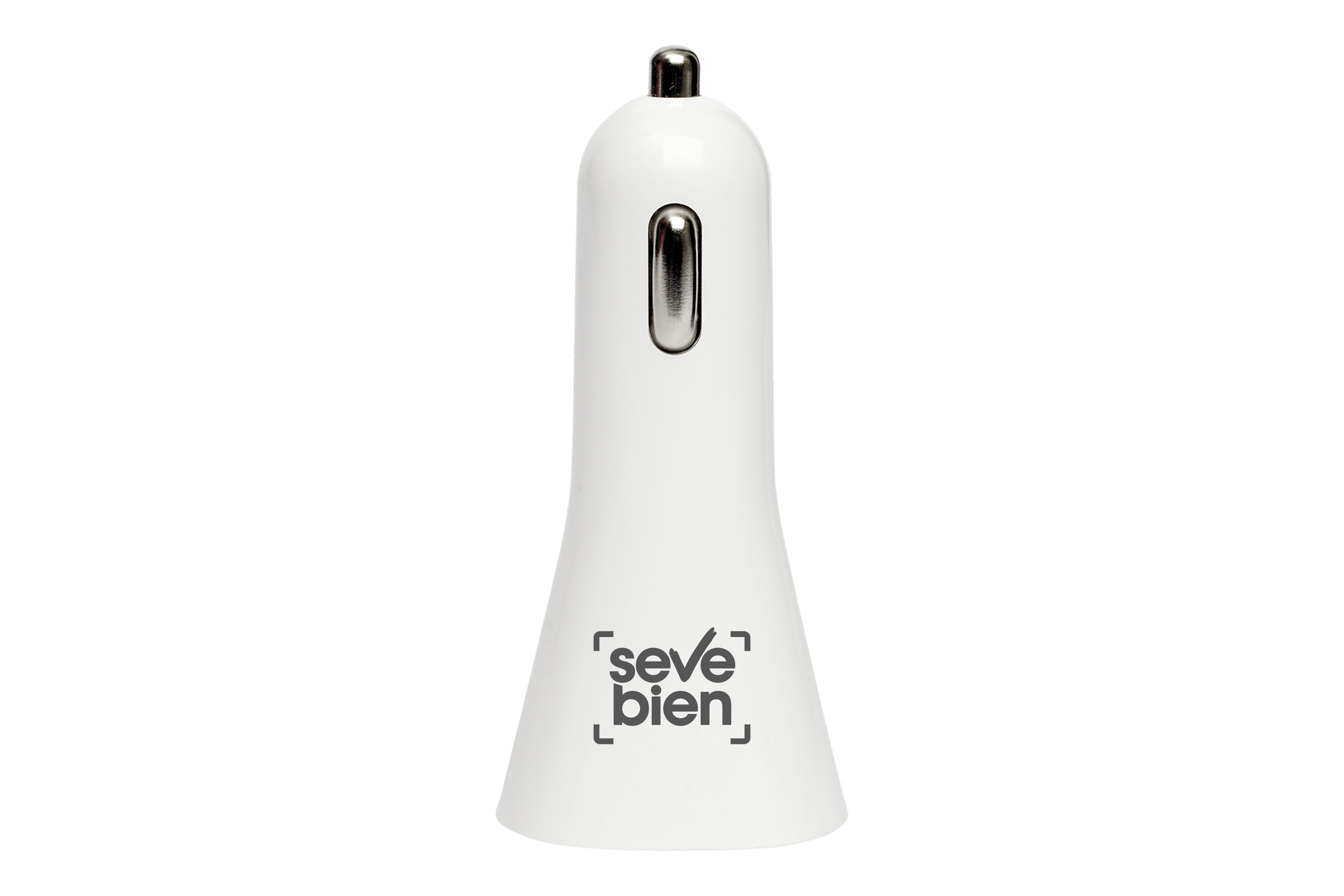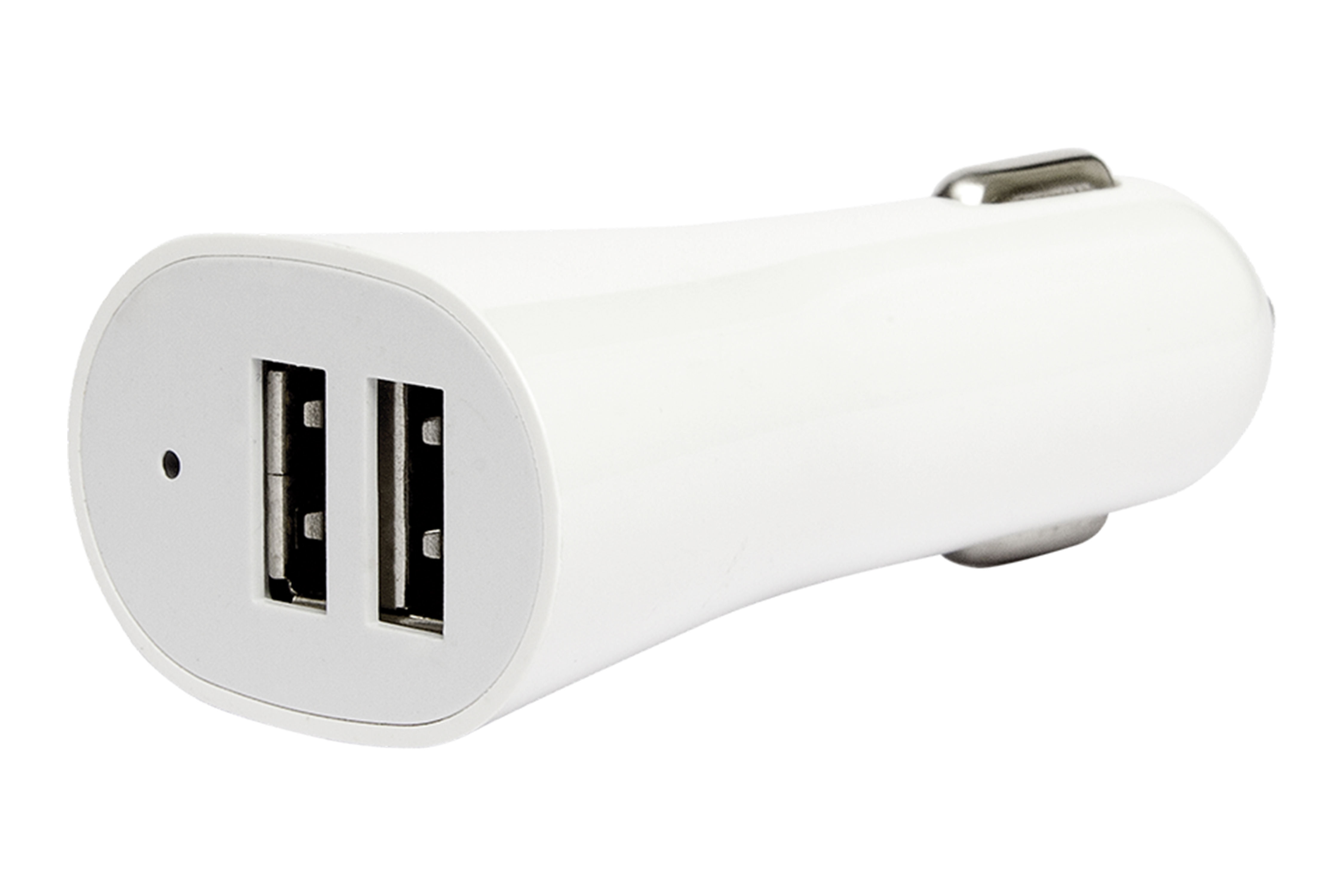 Plástico. Blanco con detalles en plata. Medida 8 x 3 cm. Cargador USB para auto de 12v con dos entradas de USB. Luz de encendido. Presentación en caja de regalo.