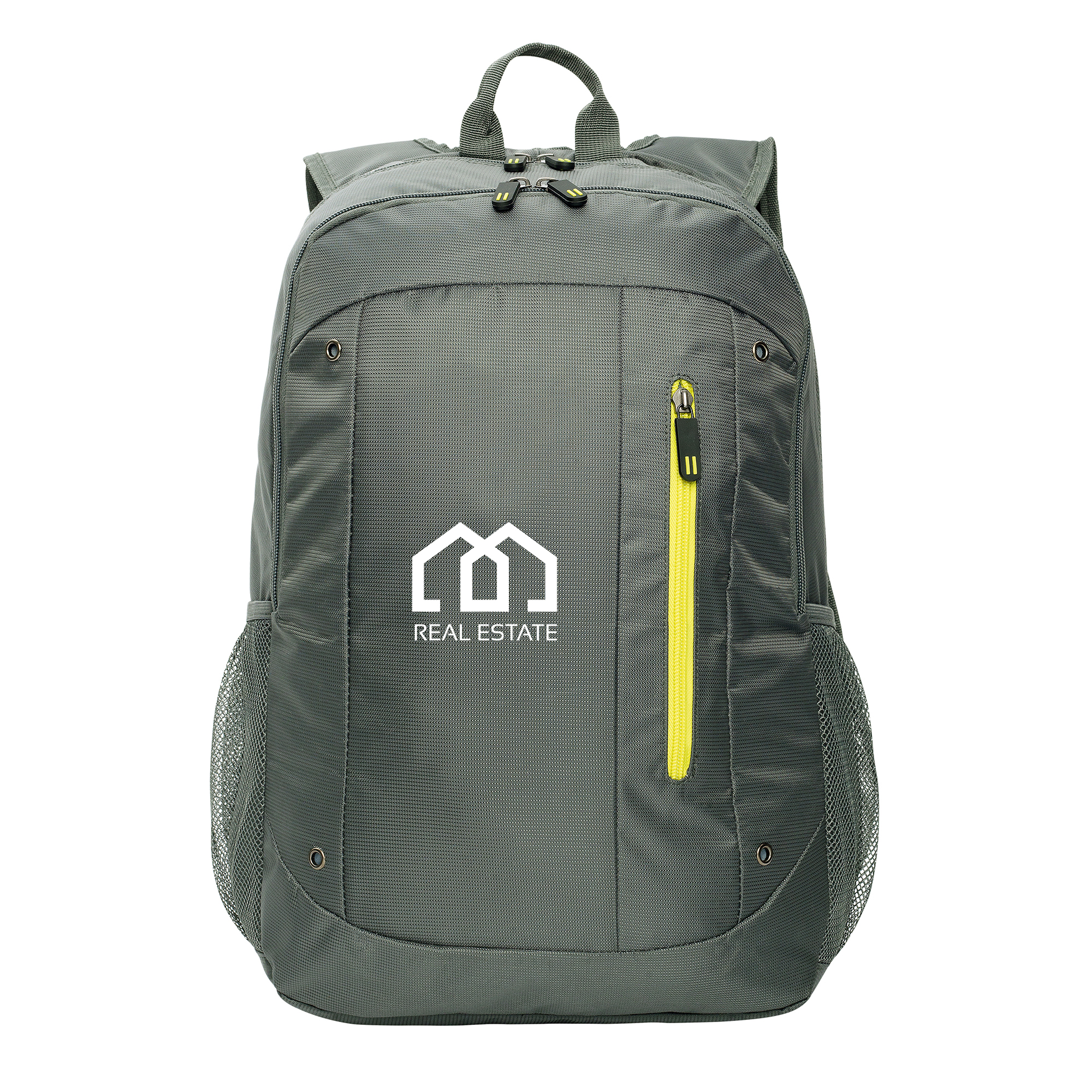32 x 47 x 17 cm. Capacidad 25 litros aprox. Jacquard Poliéster 420D. Mochila portanotebook. Dos compartimentos con cierre. Compartimento principal con división acolchada porta notebook de hasta 16” con bolsillo y el segundo con tres espacios contenedores. Bolsillo frontal con cierre en color y dos bolsillos de red laterales. Cierres metálicos con tiradores de goma con detalles de color. Correas regulables y espalda acolchadas.