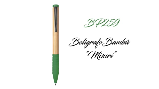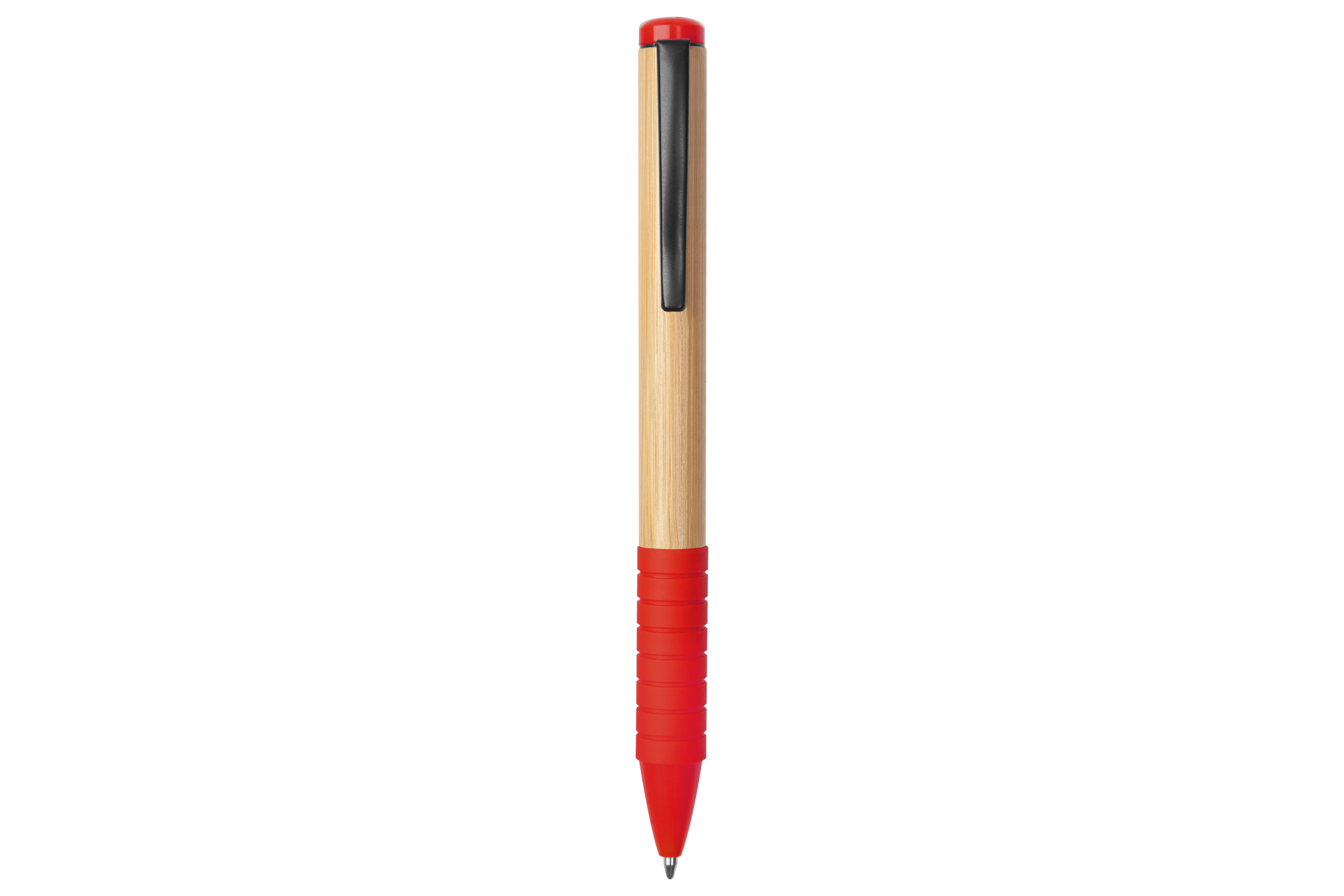 Bambú. Cuerpo de madera. Grip de goma, puntera y botón en la parte de arriba en color. Apertura giratoria. Clip negro metálico.