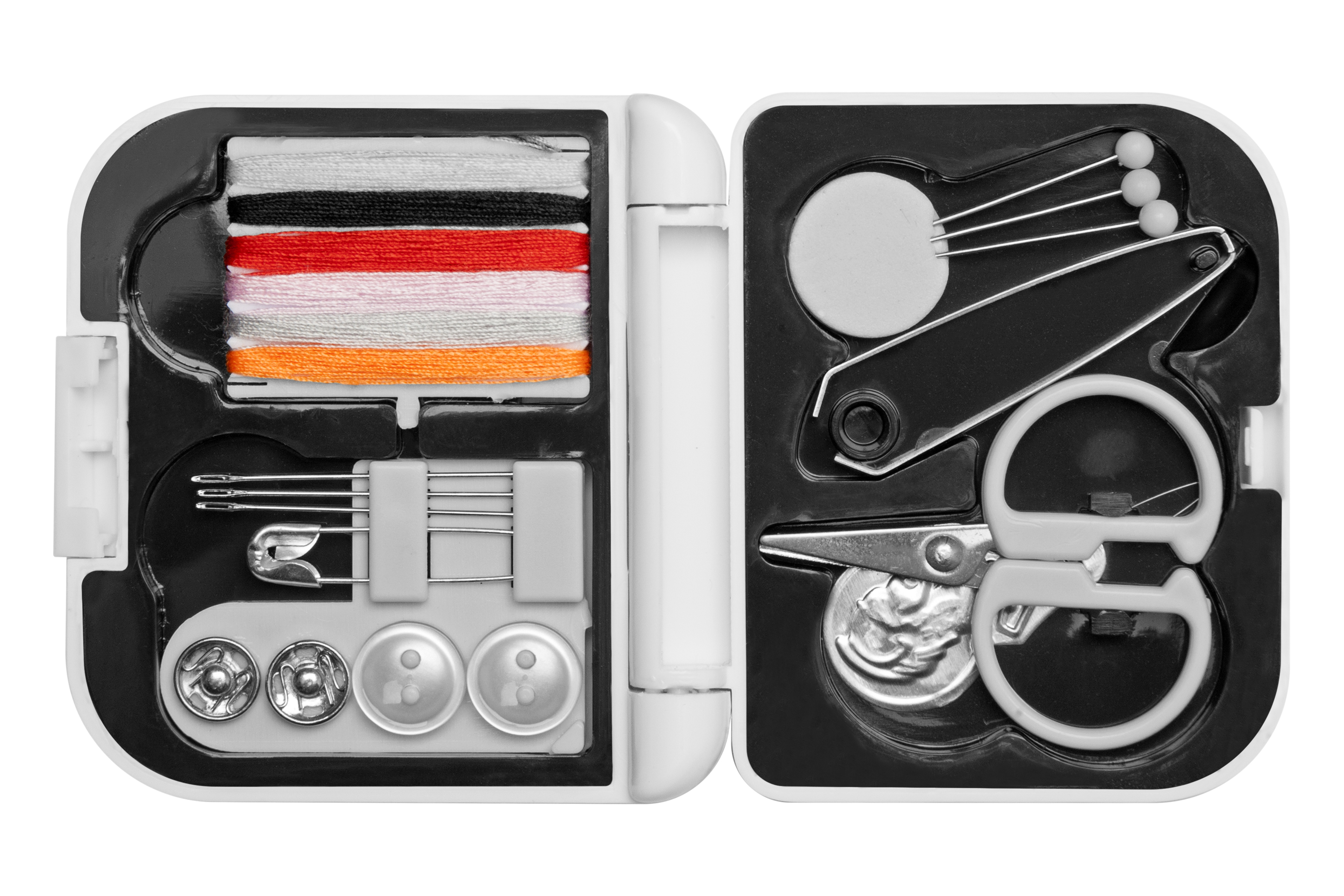 Plástico. 7 x 6,5 x 1,5 cm. Contiene tijeras, enhebrador, pinza, alfileres, botones, alfiler de gancho, agujas e hilos de colores.