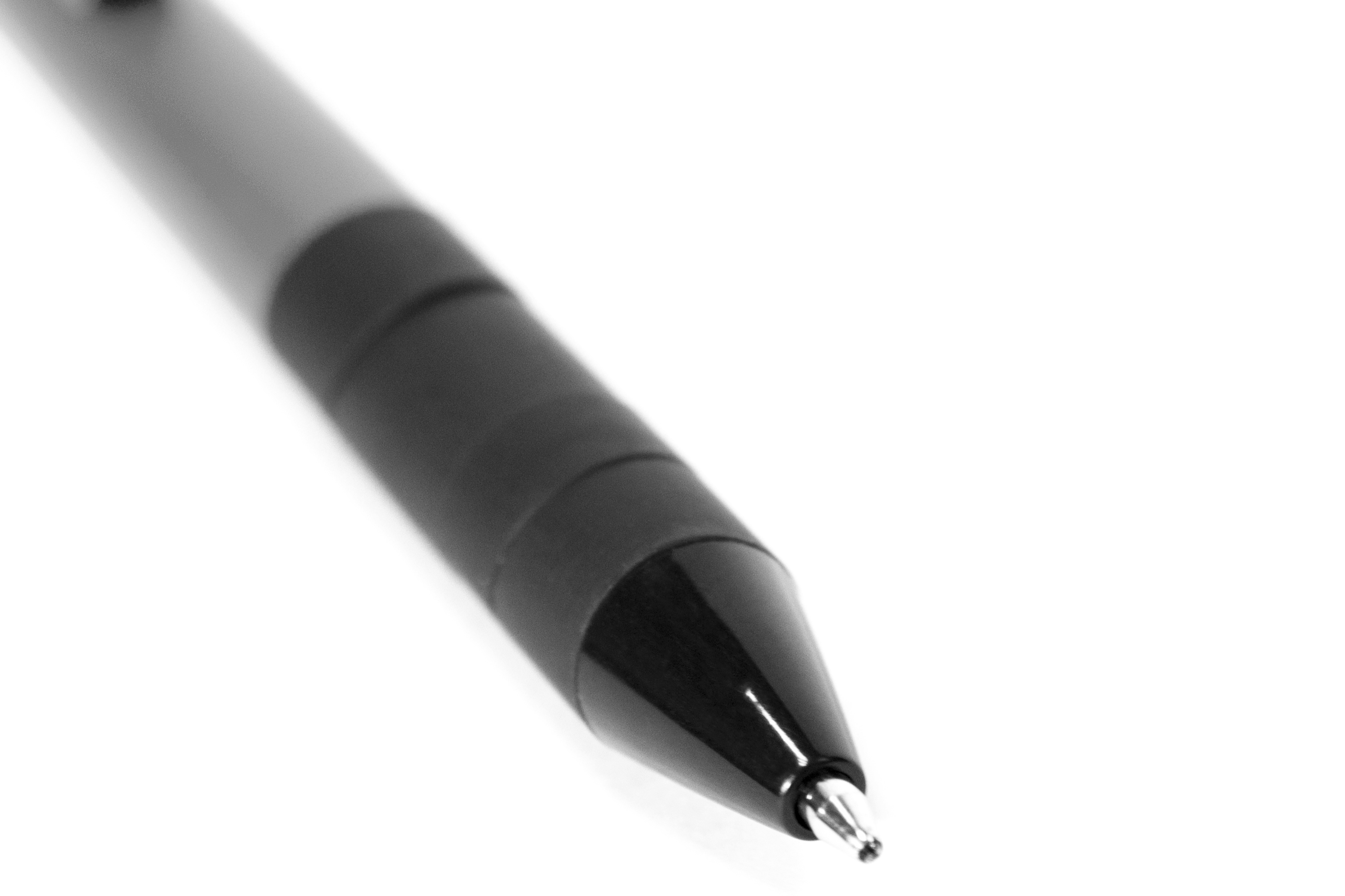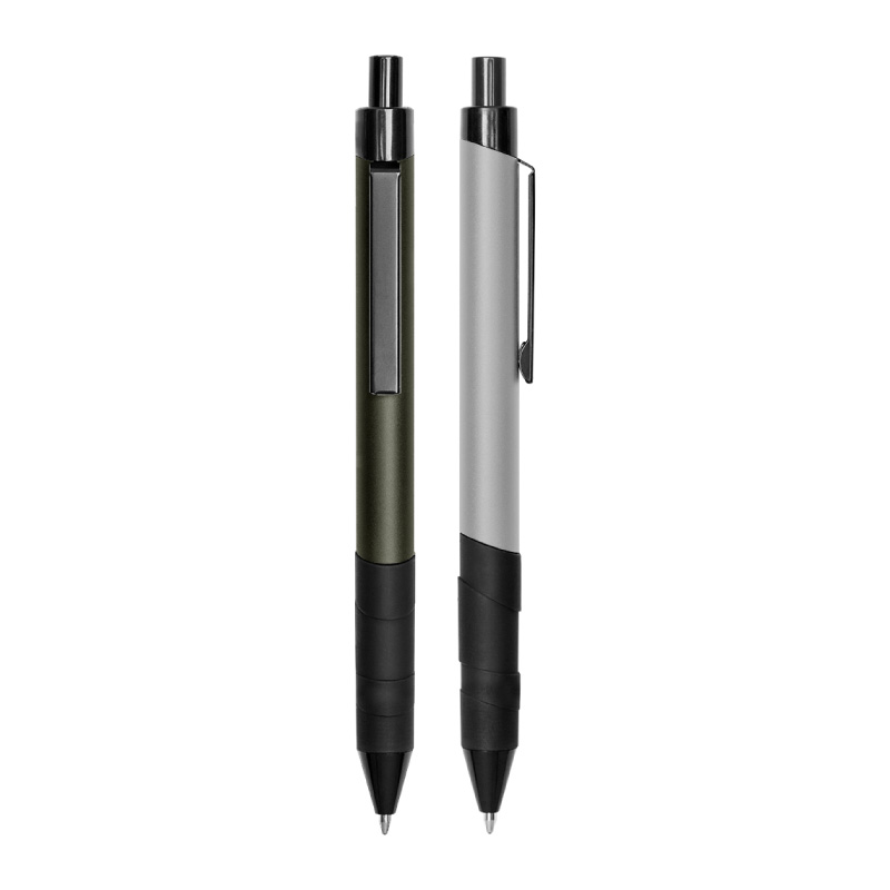Metálico. Pulsador y puntera de plástico negro. Clip metálico en color negro. Grip de goma negro. Cuerpo de color. Tinta negra.