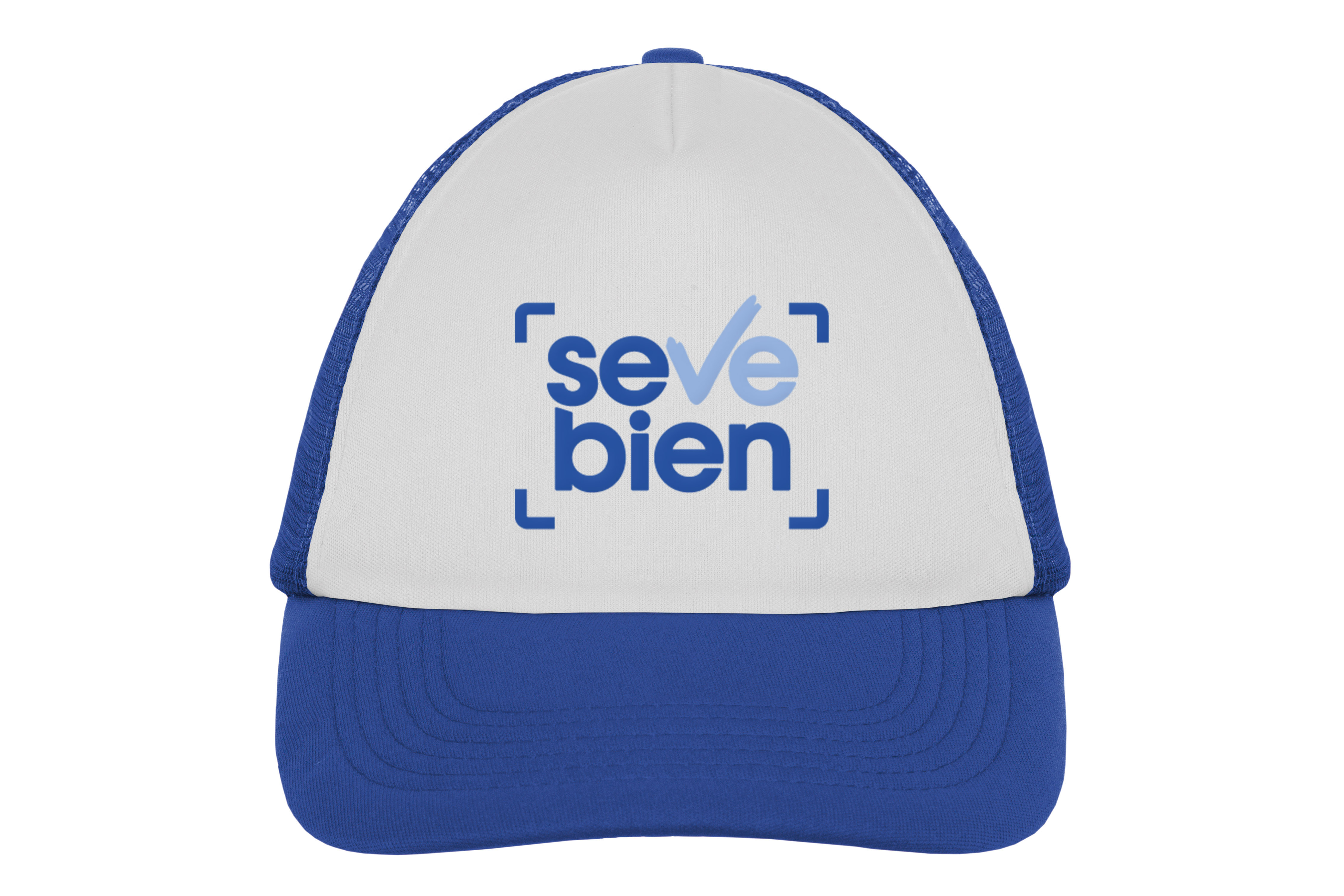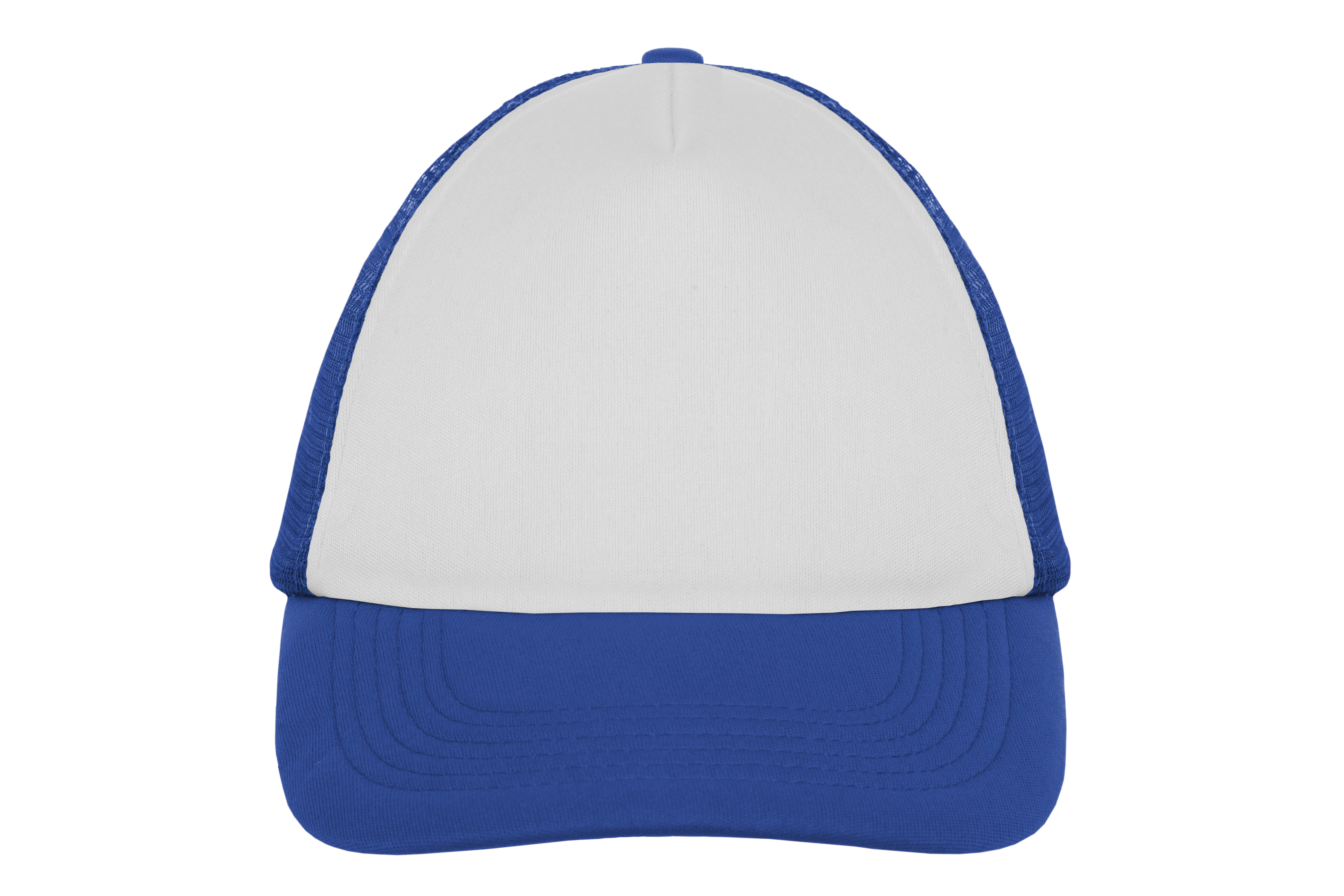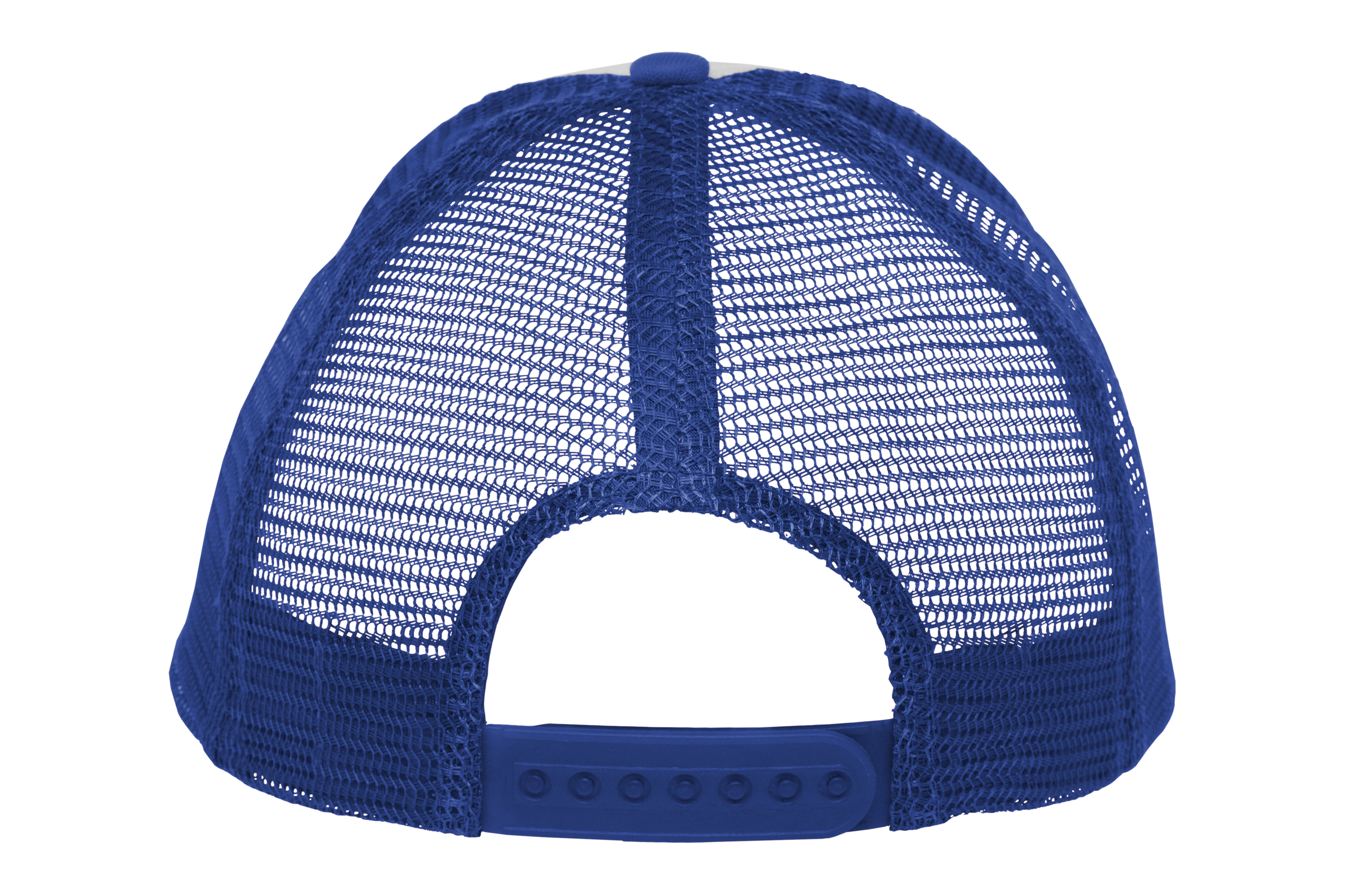 Ancho de base 18 cm. x alto 16 cm. Poliéster. Gorra trucker 5 gajos. Frente de color blanco. Parte trasera con tela red de color. Ajuste con broche plástico. Seis costuras 17,5 x 7,5 cm.