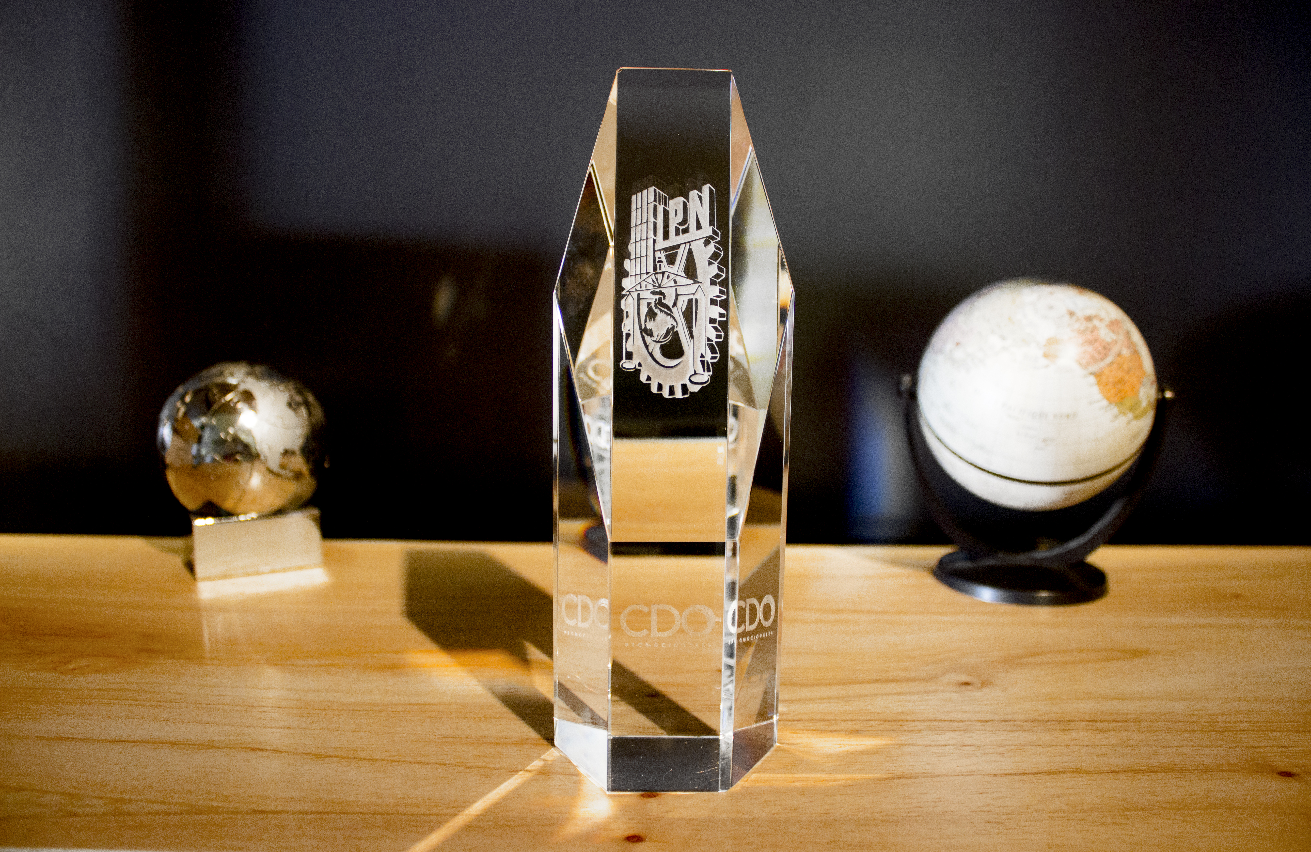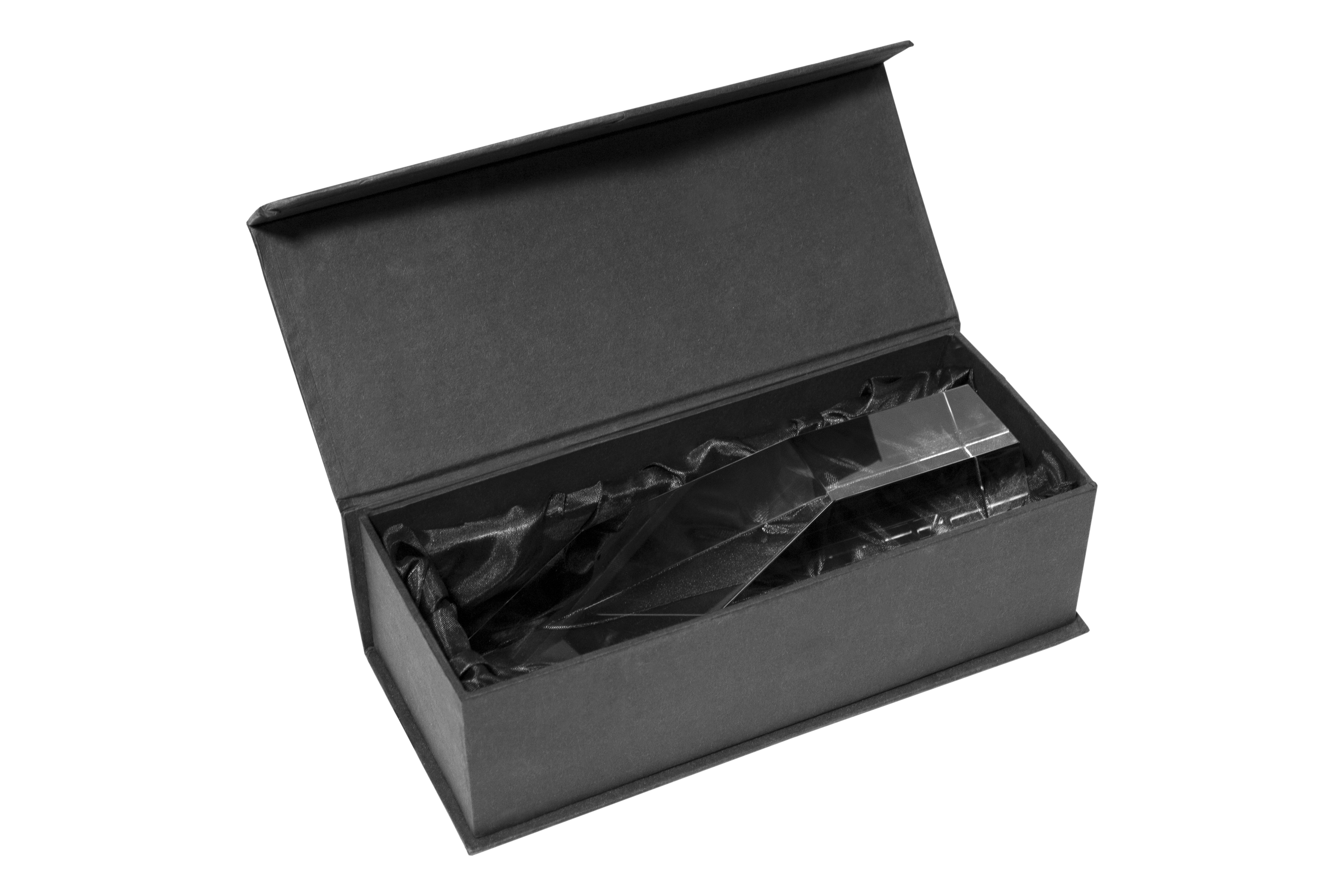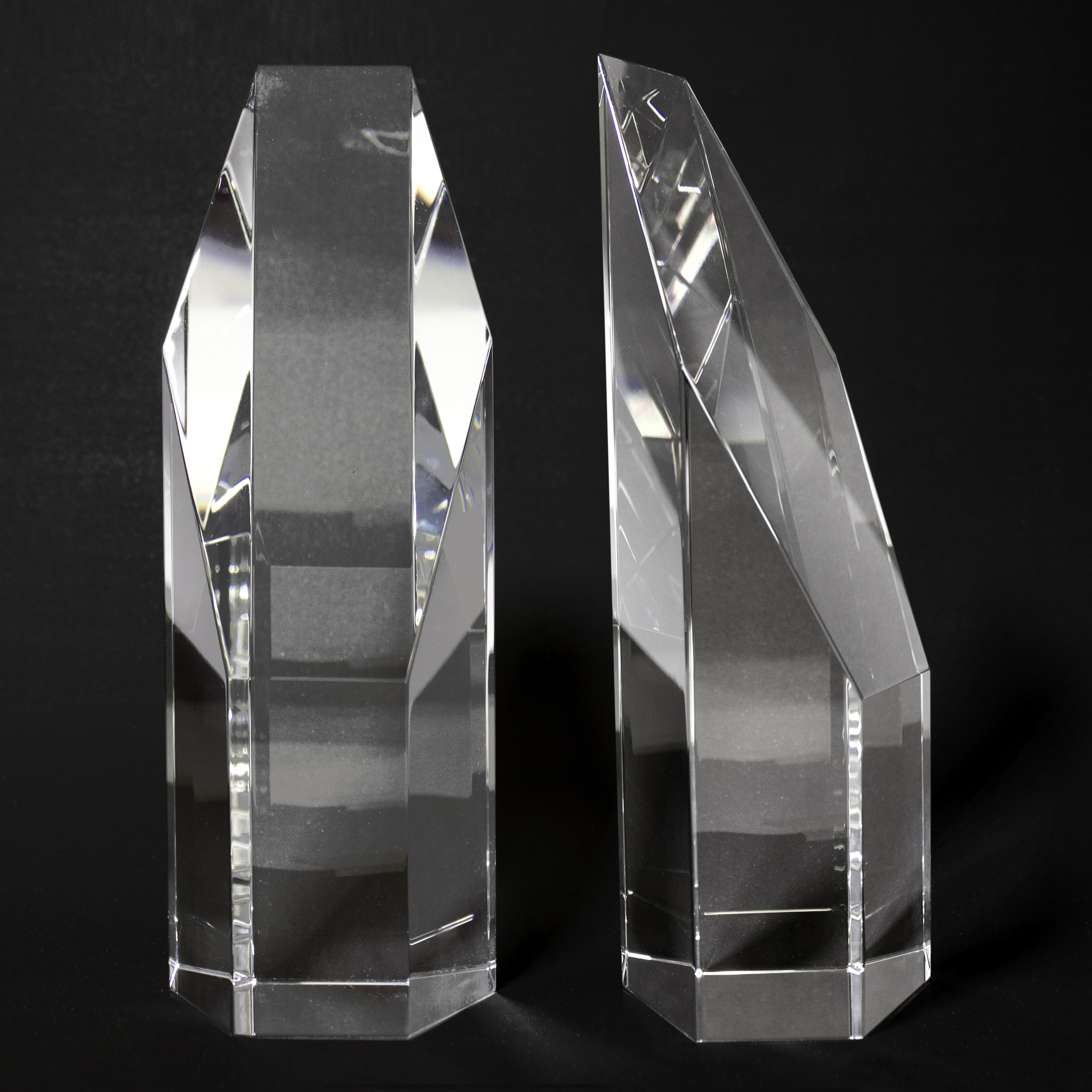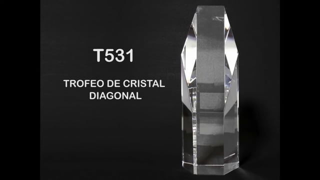 Cristal. 19 x 5,6 x 3 cm. Trofeo de cristal en forma de prisma 3D. Corte diagonal en la parte superior. Permite grabado de logo o texto. Presentación en estuche con cierre magnético.