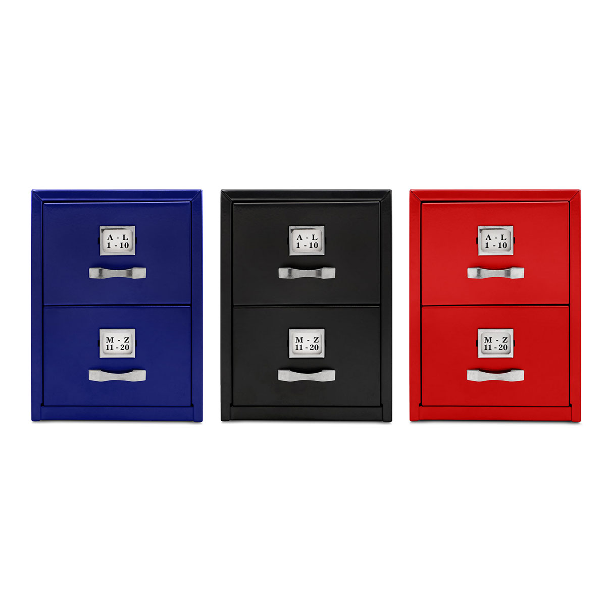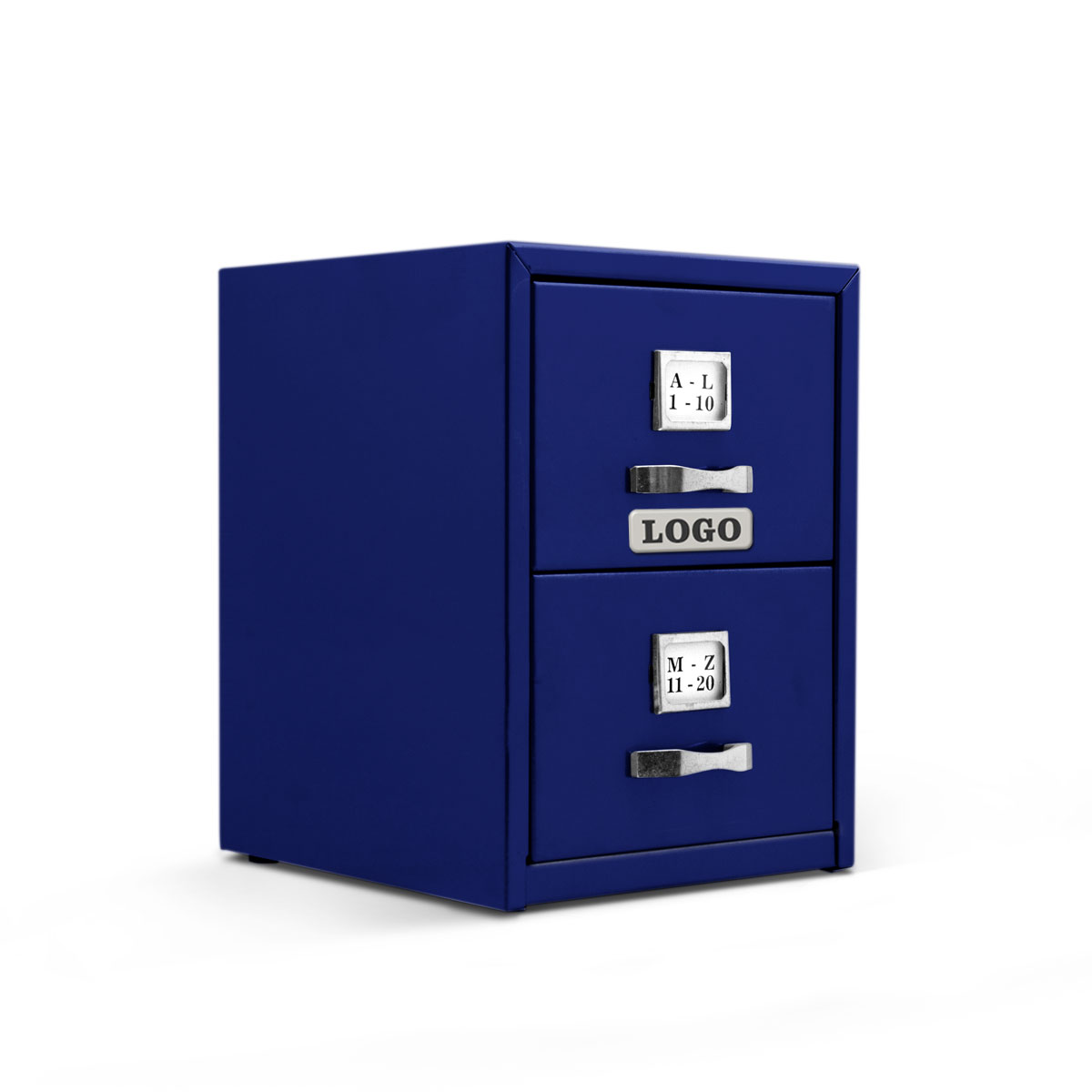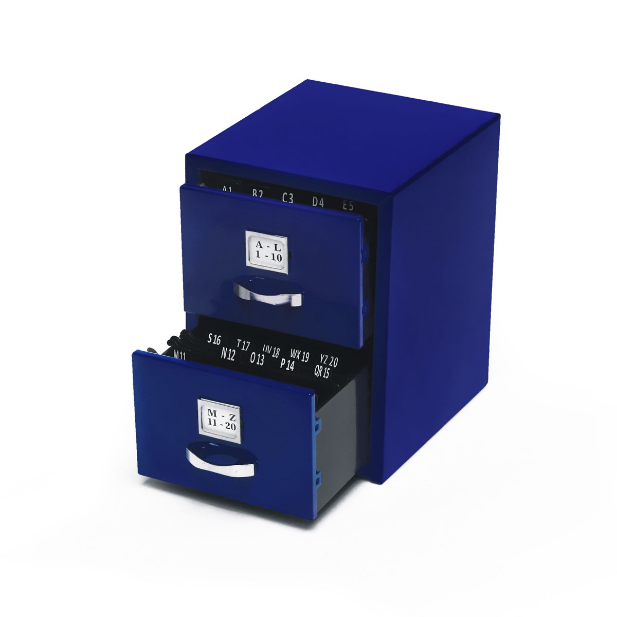 12 x 16 x 13 cm. Capacidad 800 tarjetas. Metal. Mini fichero metálico con dos cajones para archivar tarjetas, o para guardar objetos pequeños como clips, gomitas, chinches y ganchitos. Separadores con letra y número. Presentación en caja de regalo.