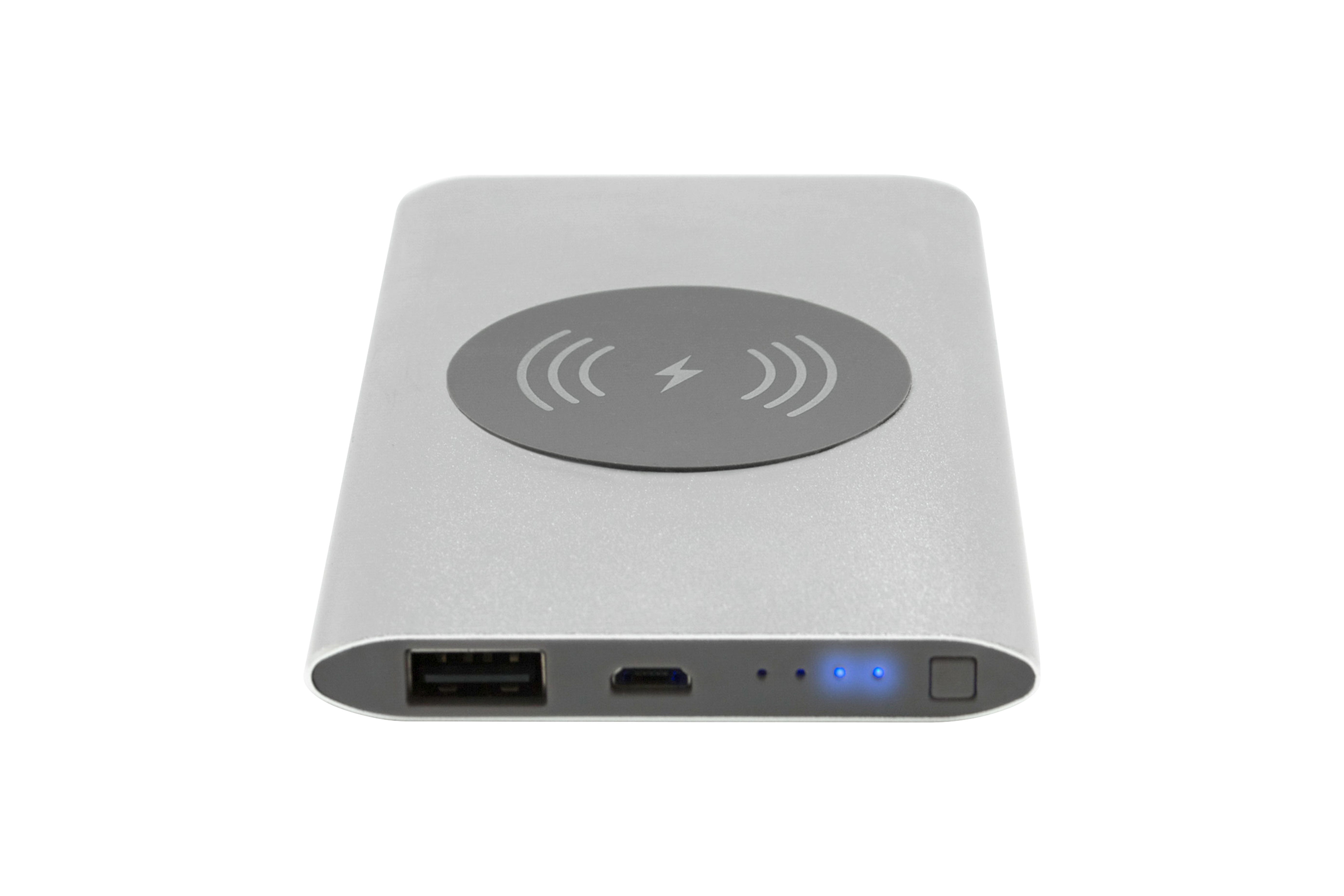 Metálico. 12,2 x 7 x 1 cm. Capacidad 4000 mah. Power Bank inalambrico, cuerpo delgado, cuenta con circulo engomado para apoyo del celular. Carga por contacto sin cables. Entrada USB y mini USB. Botón de encendido y luces led indicadora de carga. Incluye conector type C. Presentación en caja de regalo. TENGA EN CUENTA QUE ES NECESARIO TENER TECNOLOGÍA Qi PARA QUE SE EFECTUE LA CARGA, SI NO CUENTA CON ESTA TECNOLOGÍA, LA POWER BANK PUEDE SER USADA CON CABLE.