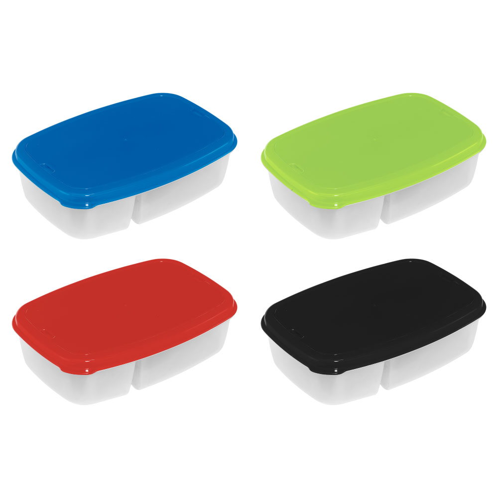 Lonchera plástica con 2 compartimentos, y doble tapa con cubiertos plásticos blancos en su interior