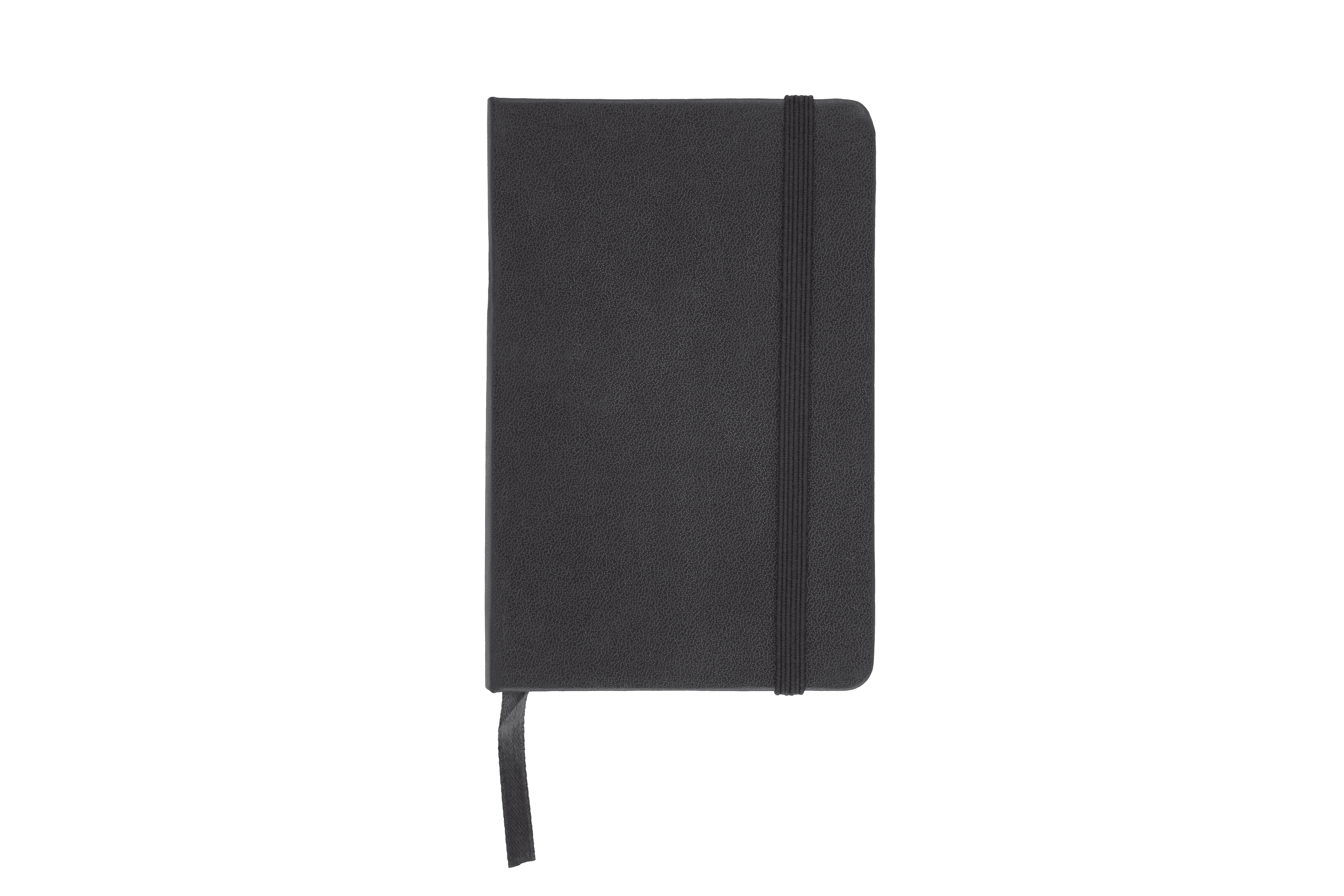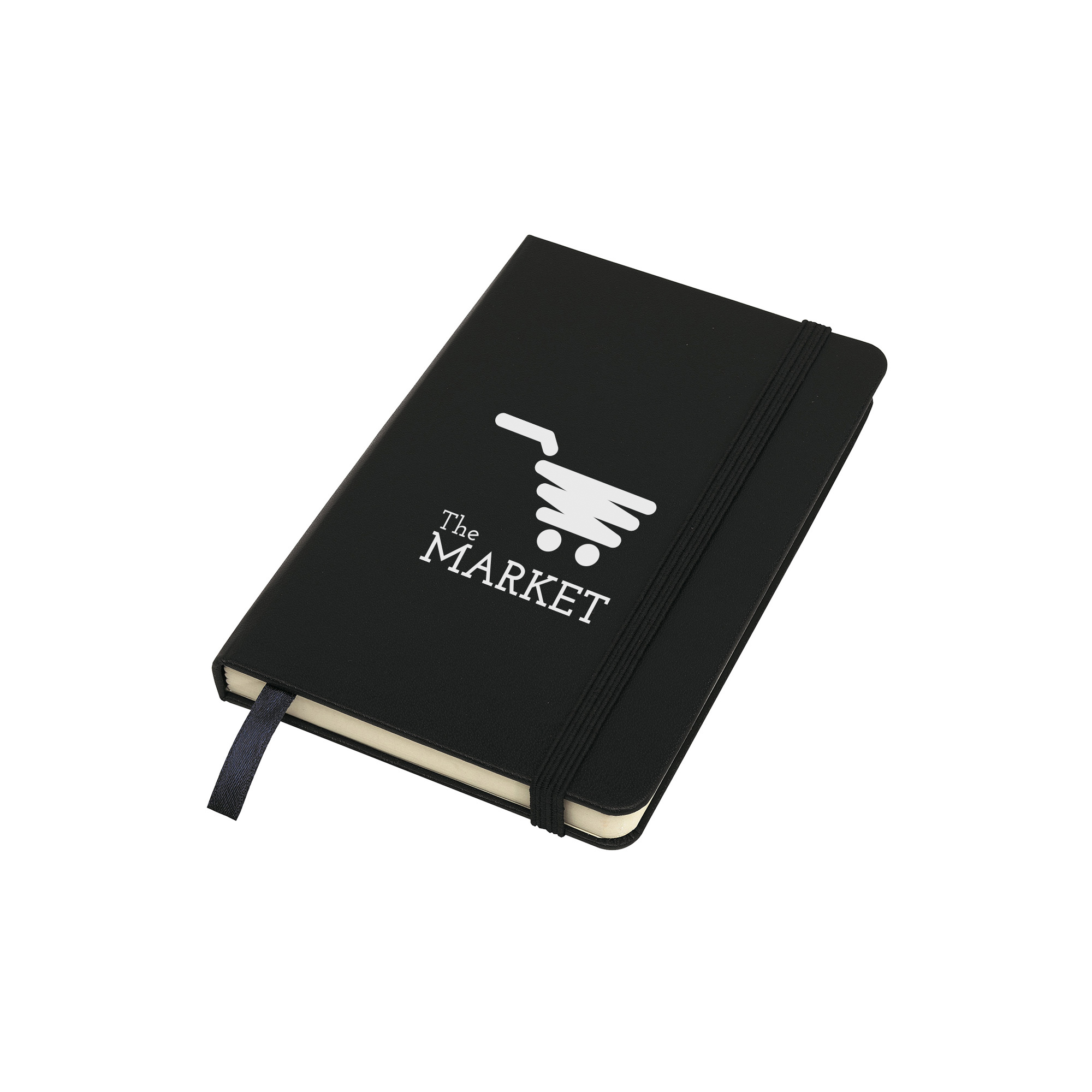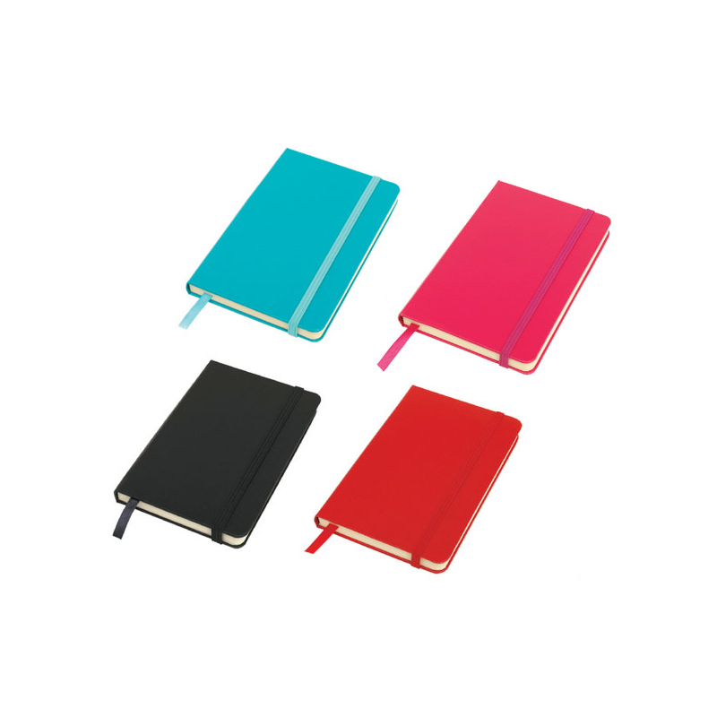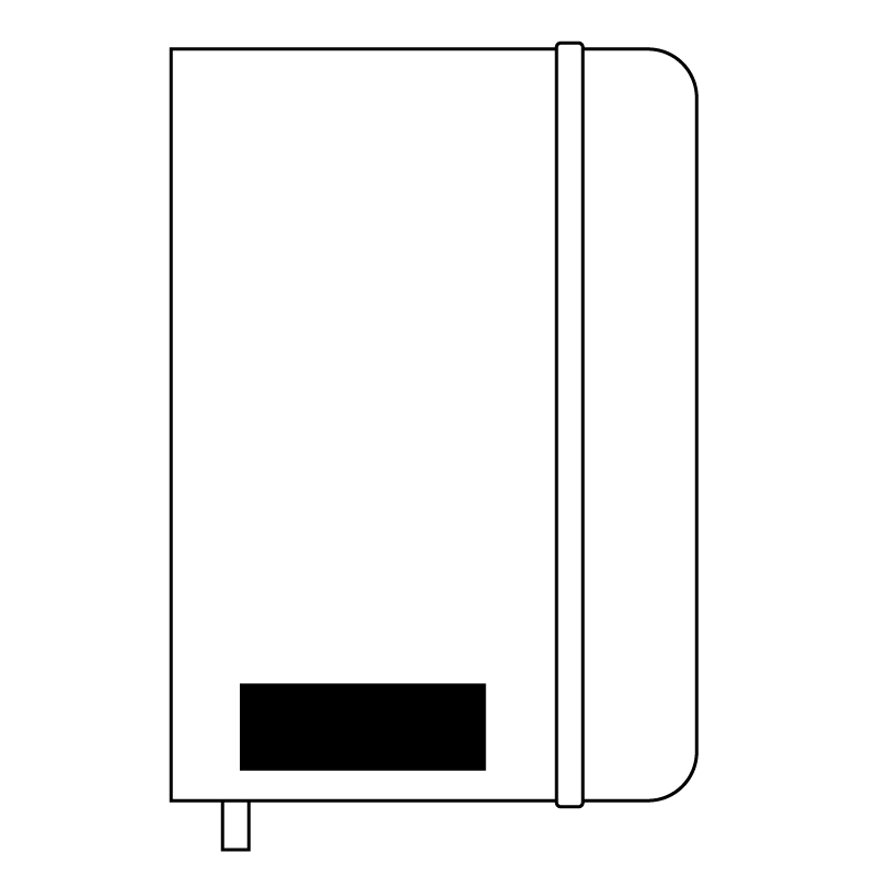 Cartón. 14 x 9 x 1,5 cm. Contiene 80 hojas rayadas y separador en tela. Posee cierre con banda elástica. Amplia área de impresión.