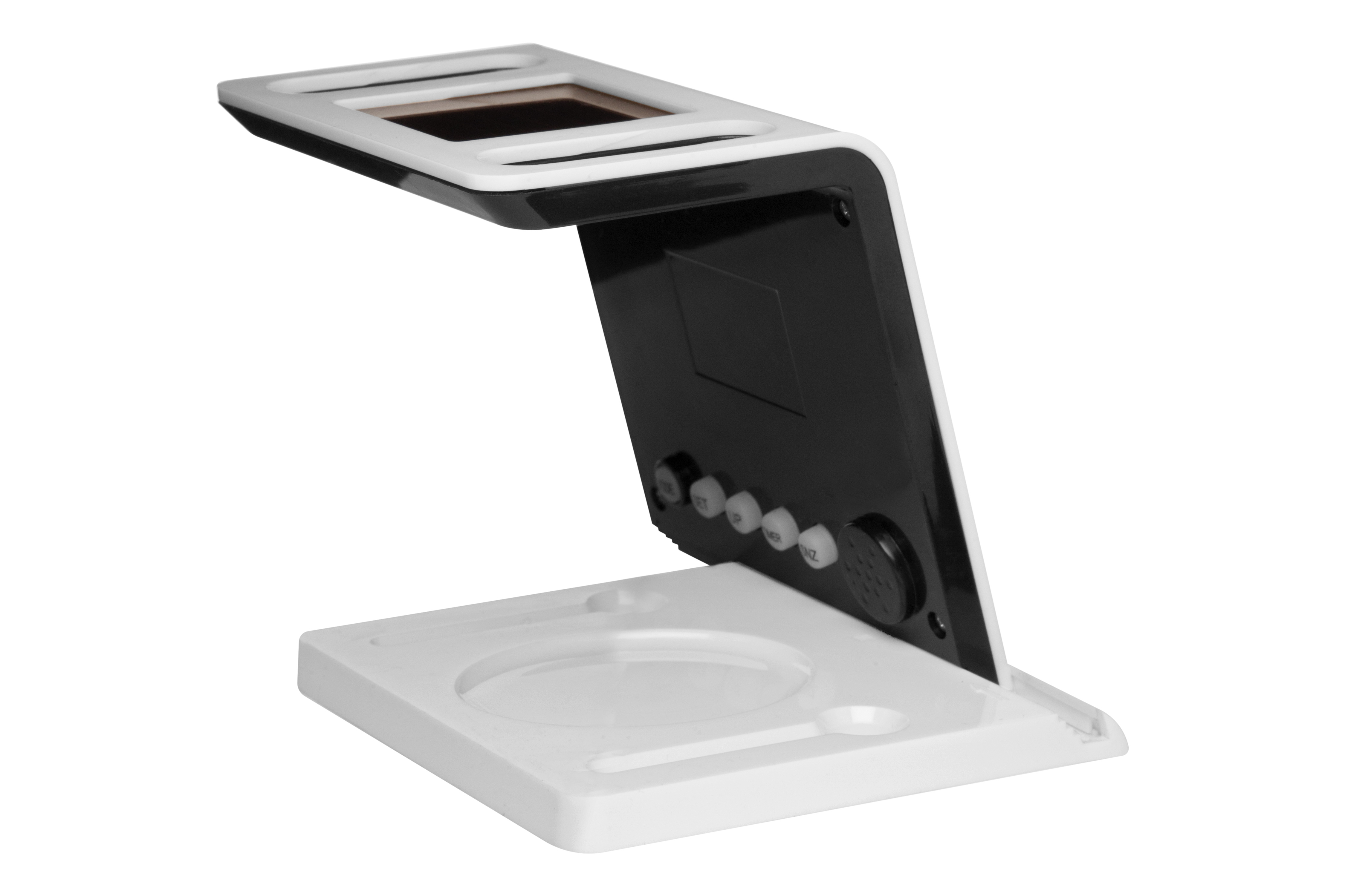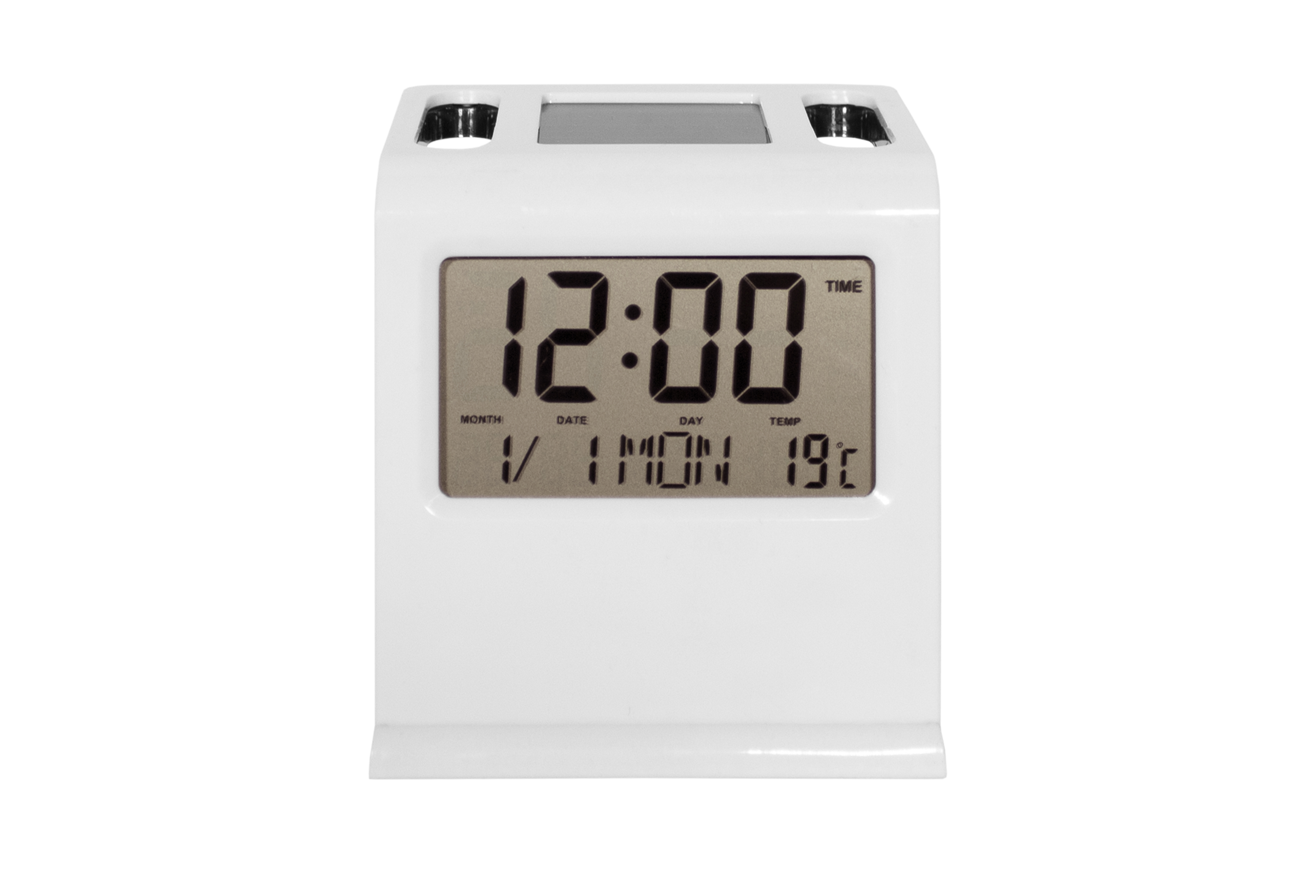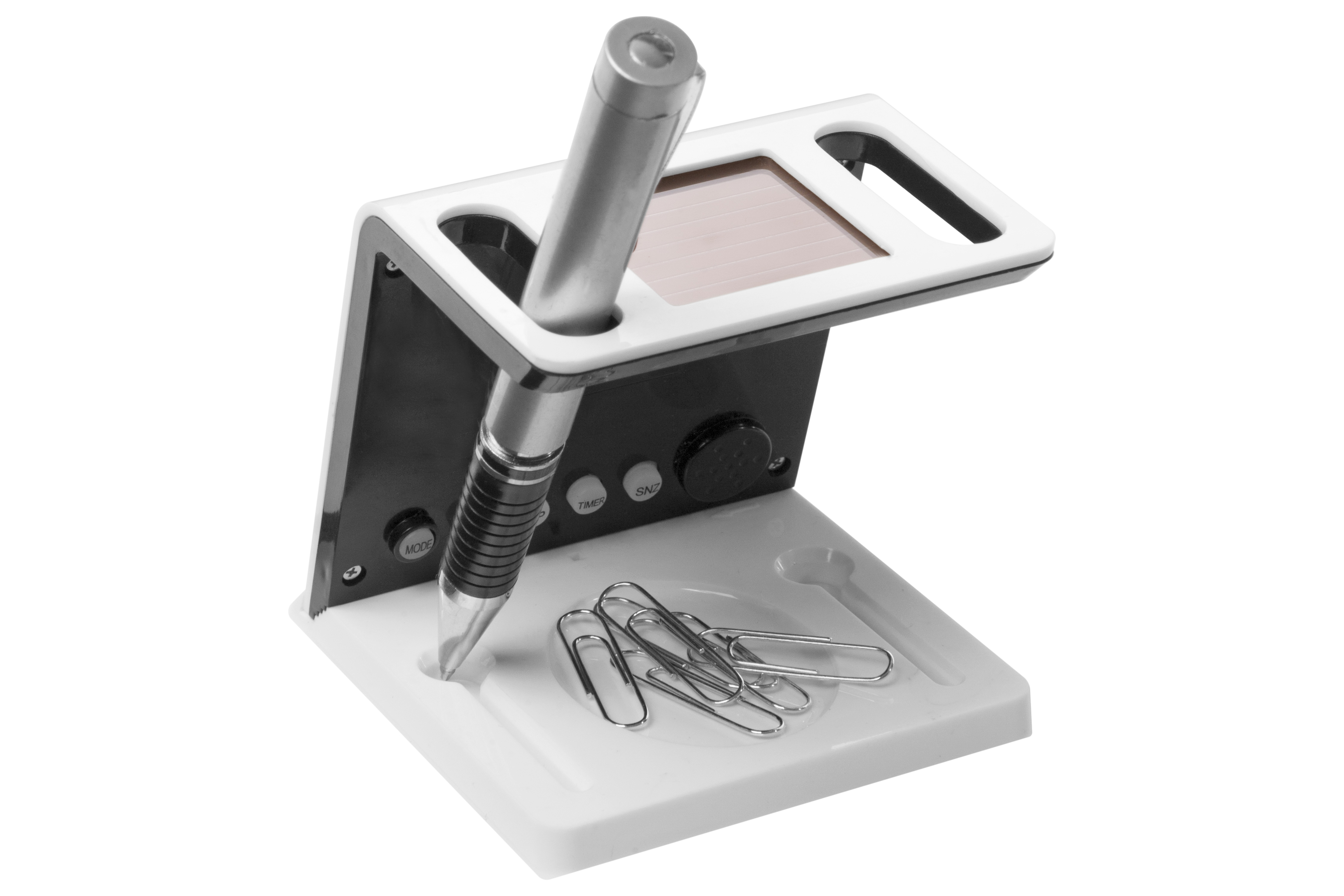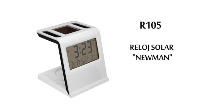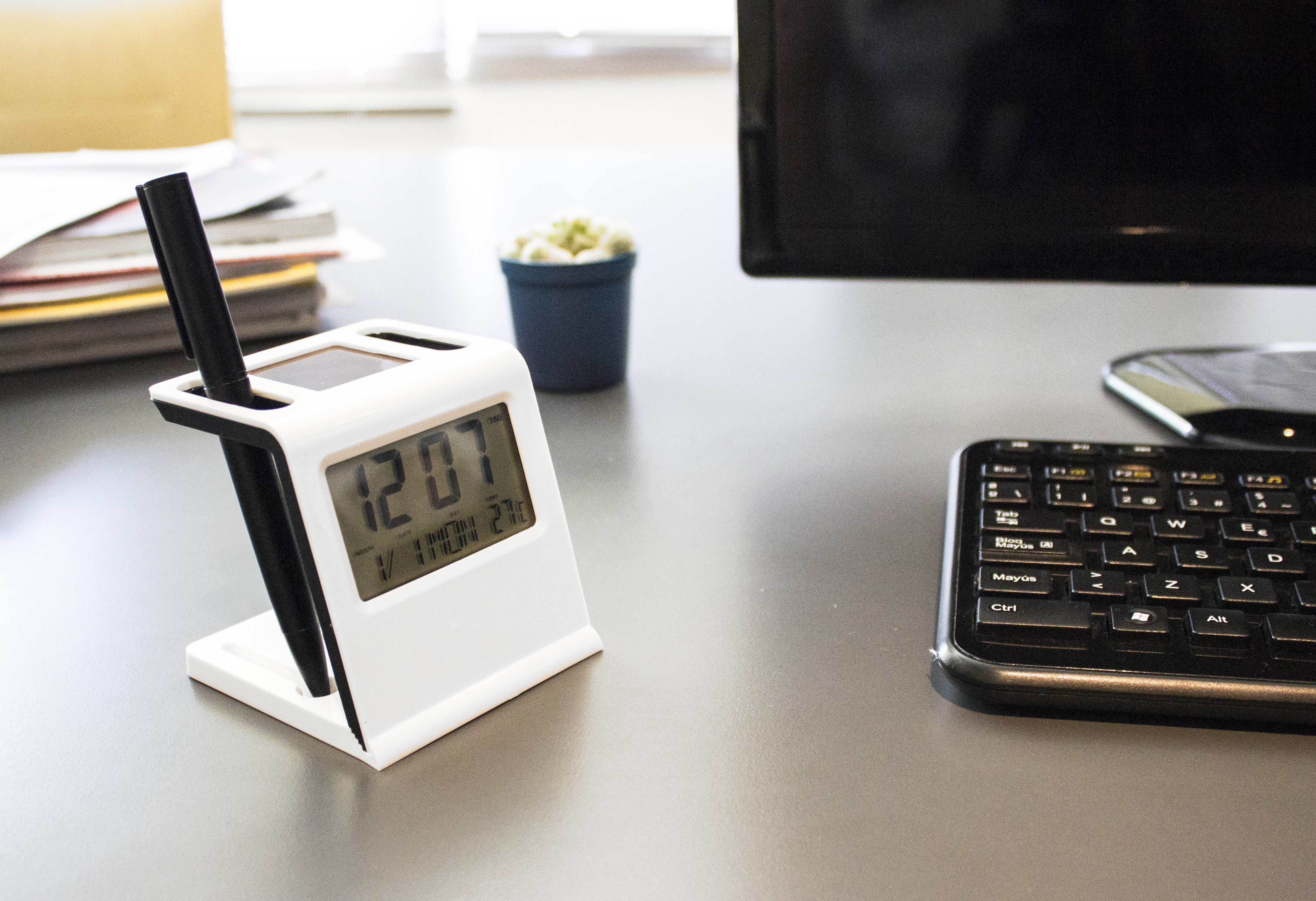 Plástico. 8 x 8 cm. Reloj solar y porta lapicero. Reloj, alarma, temporizador, fecha, día y temperatura. Sin la luz solar cambia automaticamente y funciona con una batería botón. Dos compartimentos para bolígrafo y espacio imantado para guardar clips. Se convierte en tarjetero cuando se desmonta el reloj.
