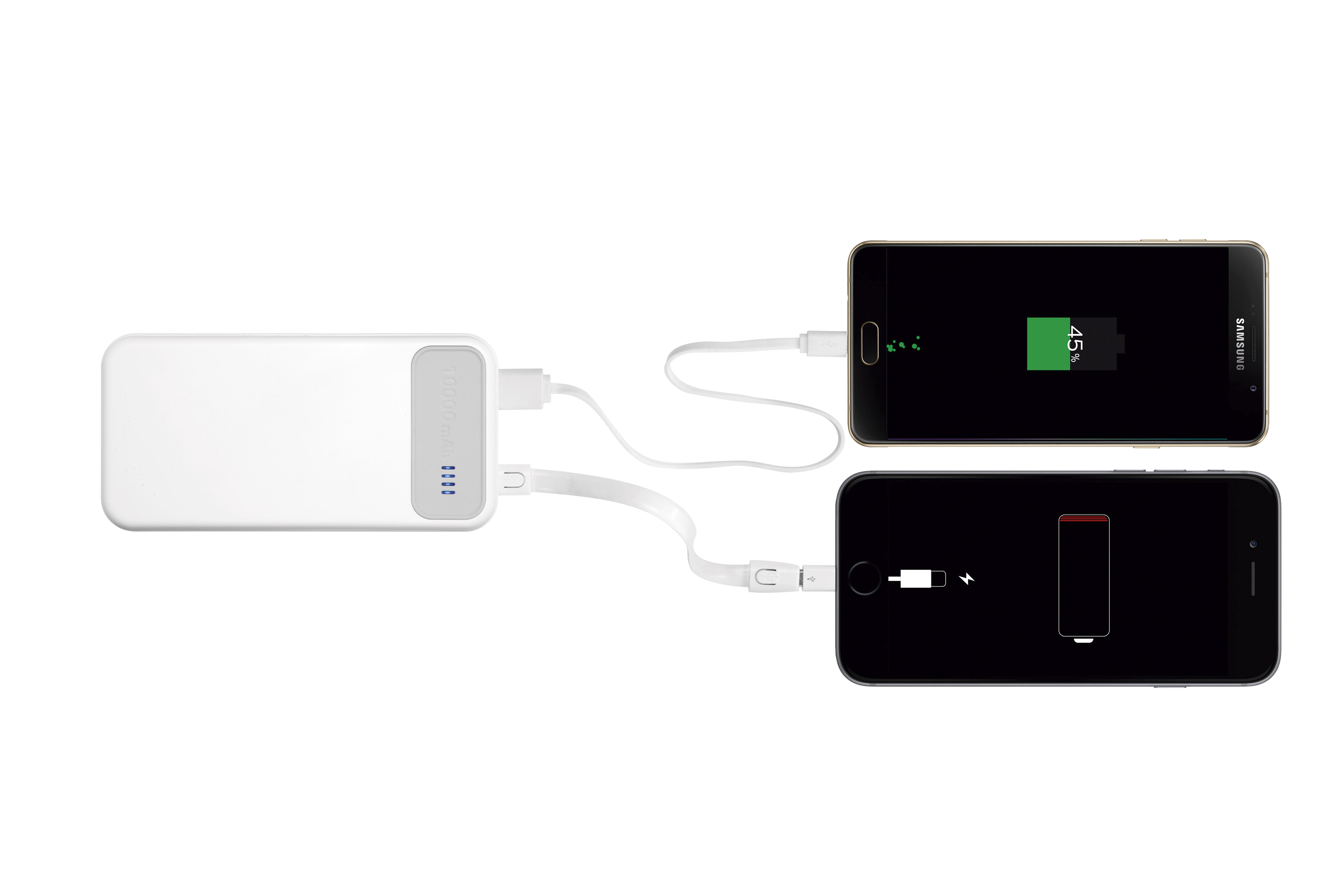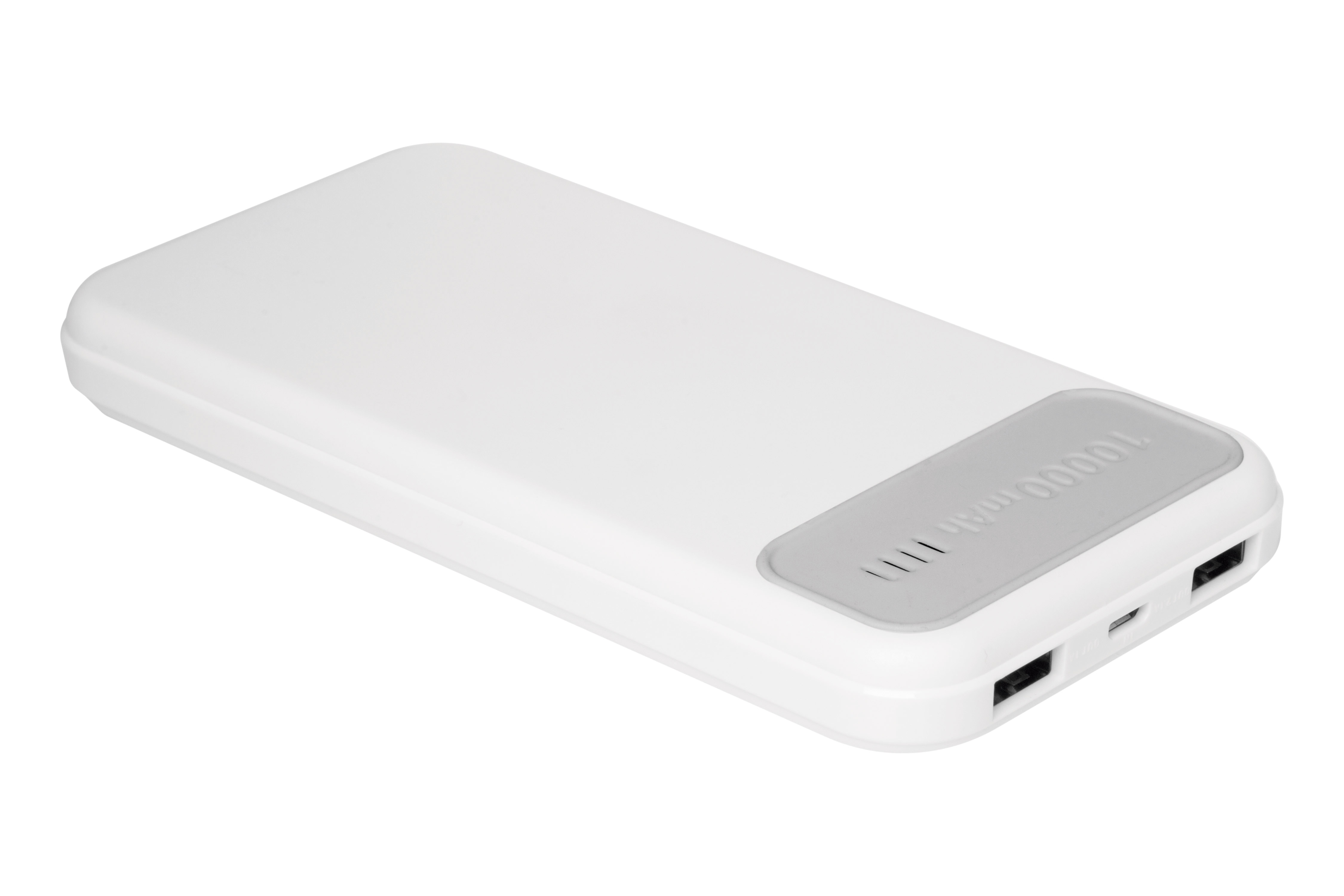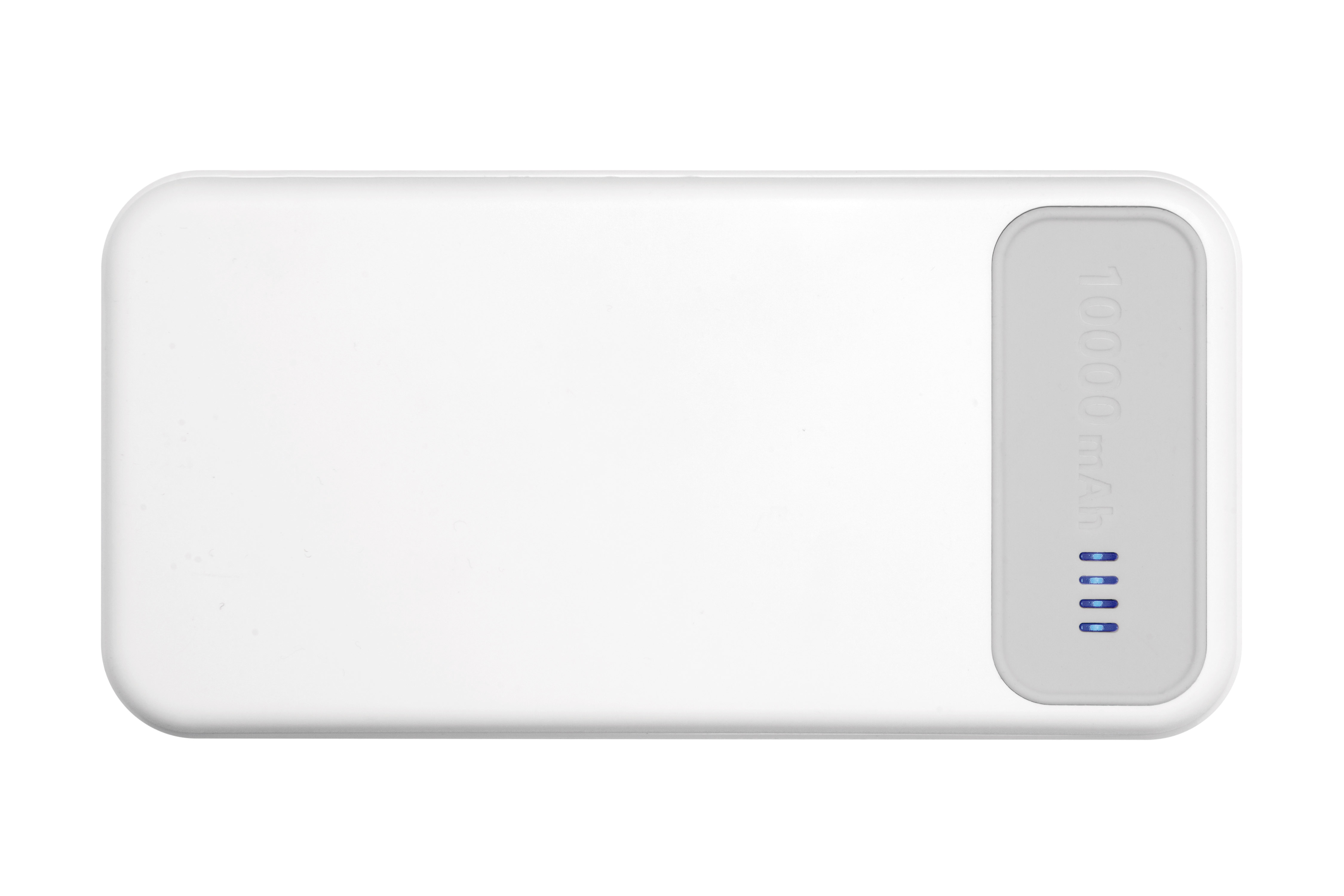 Plástico. 14,5 x 7 x 1,5 cm. Capacidad 10000 MAH. Batería portátil para celular con dos salidas USB. Luces Led indicadoras de carga. Botón al costado que al oprimirlo una vez muestra el estado de carga de la Power Bank, 1 luz: 25% de energía, 2 luces: 50% de energía, 3 luces: 75% de energía, 4 luces: 100% de energía. Entrada y salidas DC 5V. Incluye cable USB para carga. Presentación en caja de regalo.