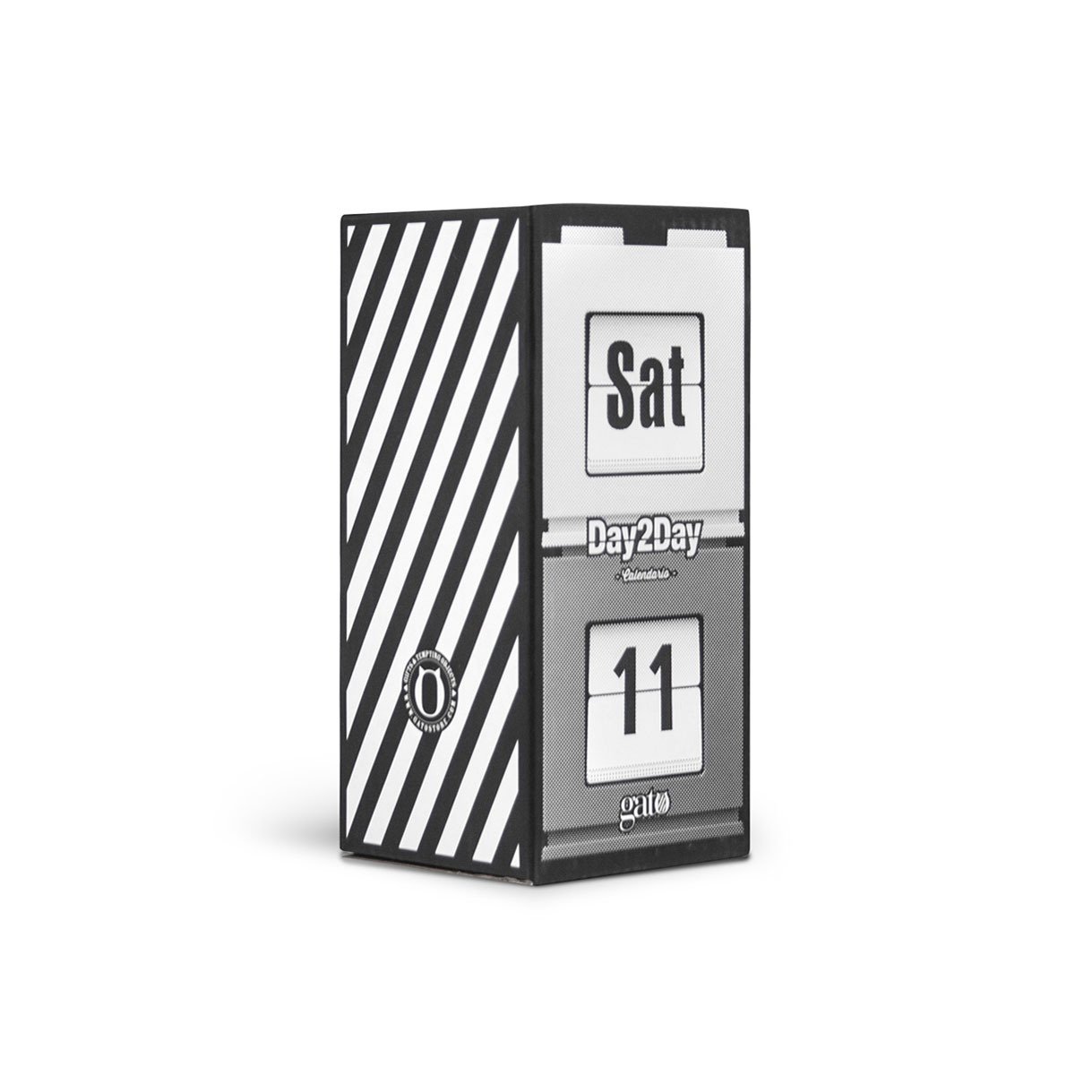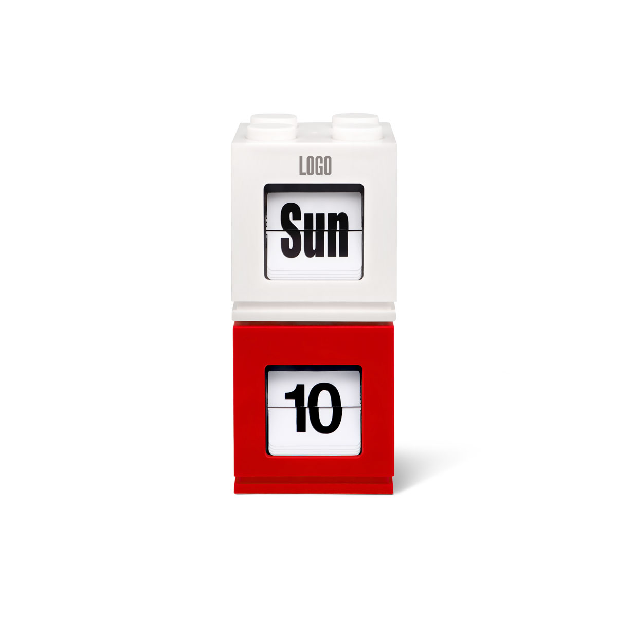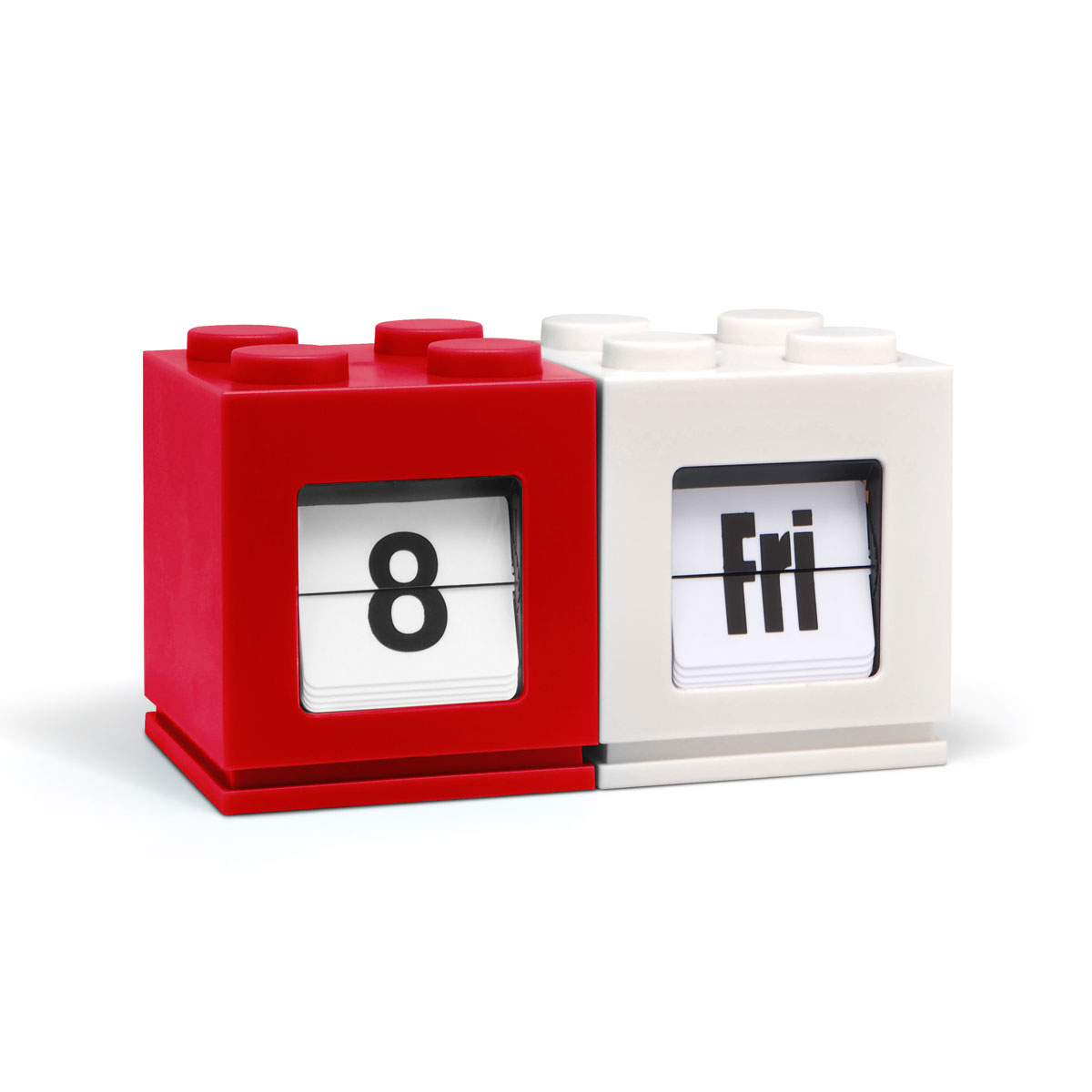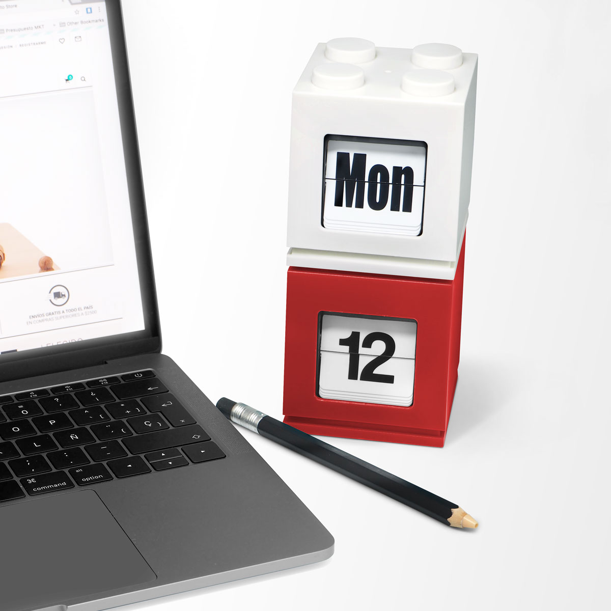 Calendario con sistema flip compuesto por dos módulos encastrables, uno para el día, otro para el número. Se cambia manualmente apretando una sola vez si están apilados, o ambos cubos si están separados. Plástico. 8 x 9,5 x 8 cm cada módulo. 2 módulos encastrables.