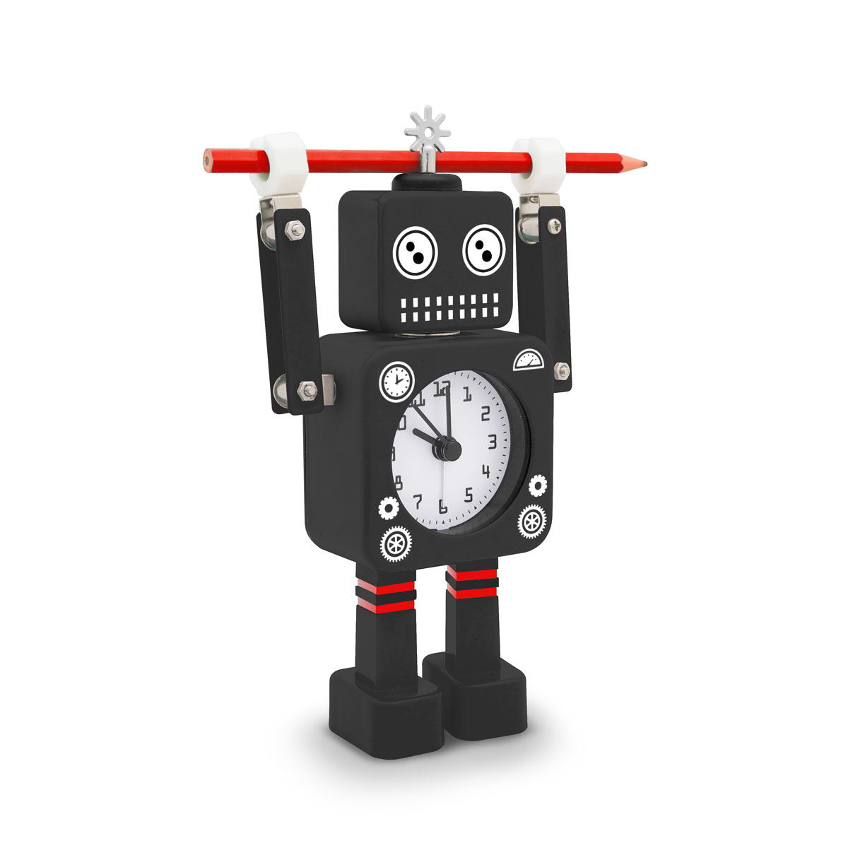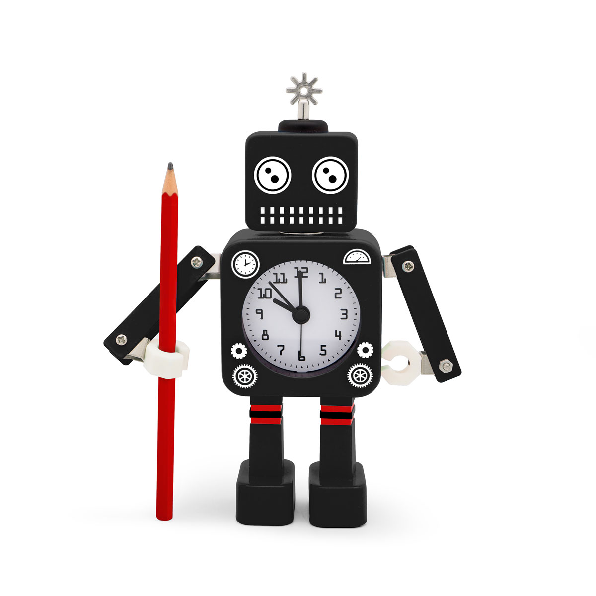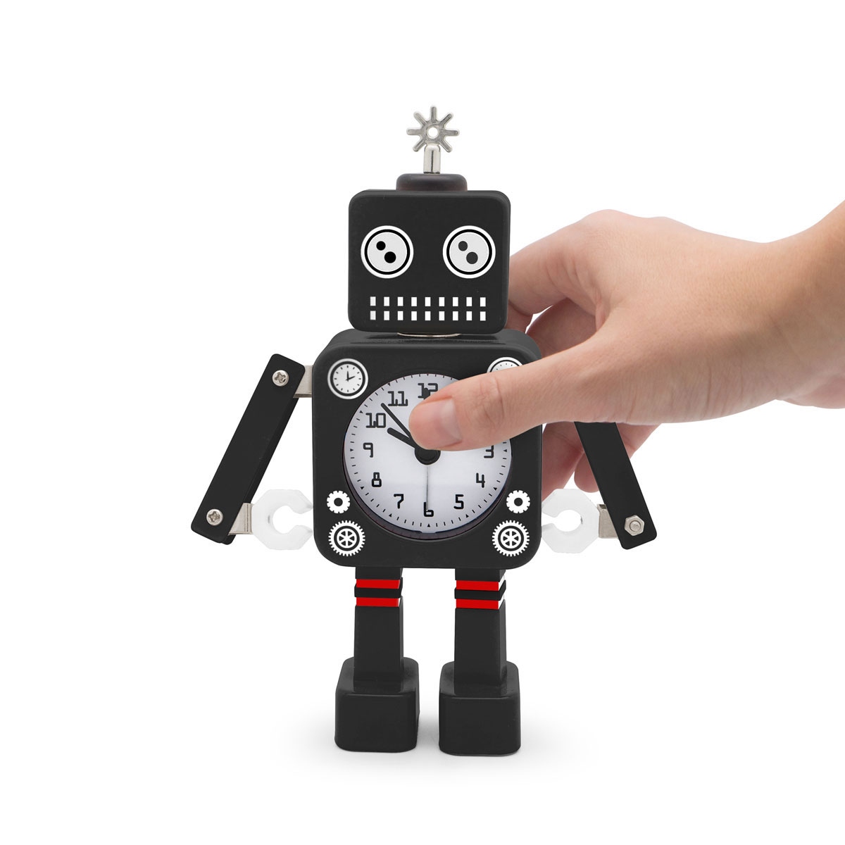 11 x 19 x 4 cm. Metal. Reloj despertador. Para empezar el día con este adorable, divertido y funcional compañero. Funciona con 1 pila AA (no incluida). Brazos y piernas articulados. Presentación en caja de regalo.