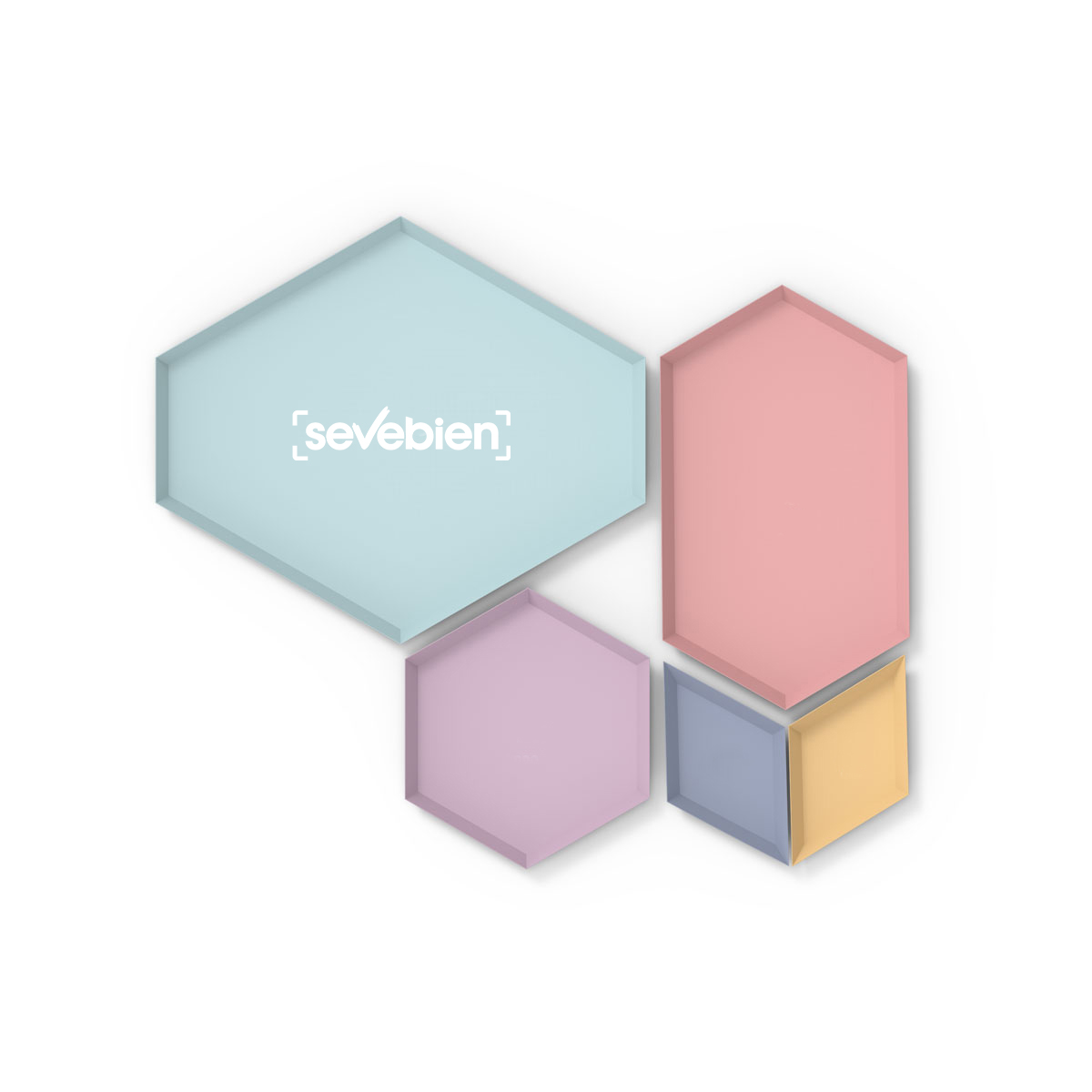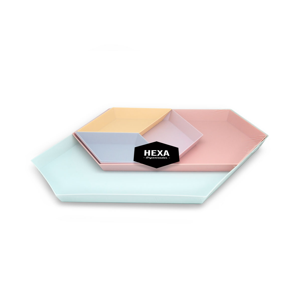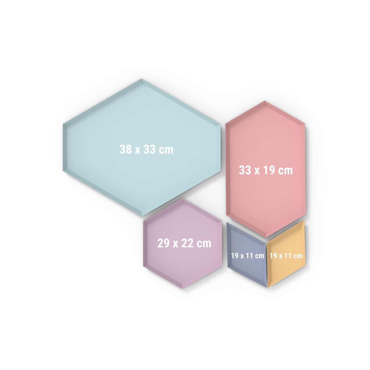 2 módulos de 19 x 11 cm, 1 módulo de 29 x 22 cm, 1 módulo de 33 x 19 cm y 1 módulo de 38 x 33 cm. Plástico. Organizador de escritorio con 5 bandejas modulables de distintos tamaños y colores.