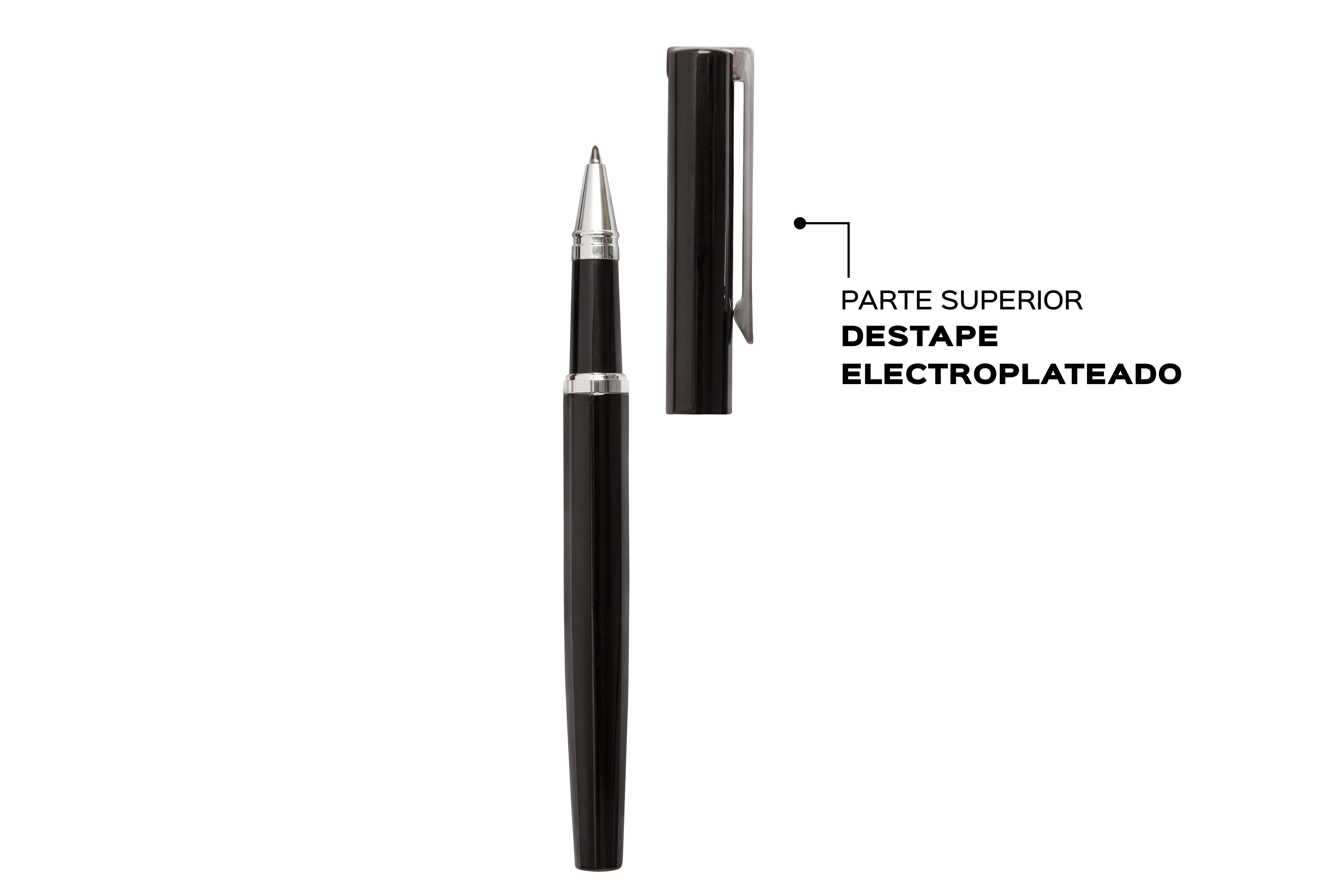 Metal. bolígrafo y Roller Ball, cuerpo de color. Clip, puntera y detalle plateados. Incluye estuche doble. Destape electro plateado en la parte superior.