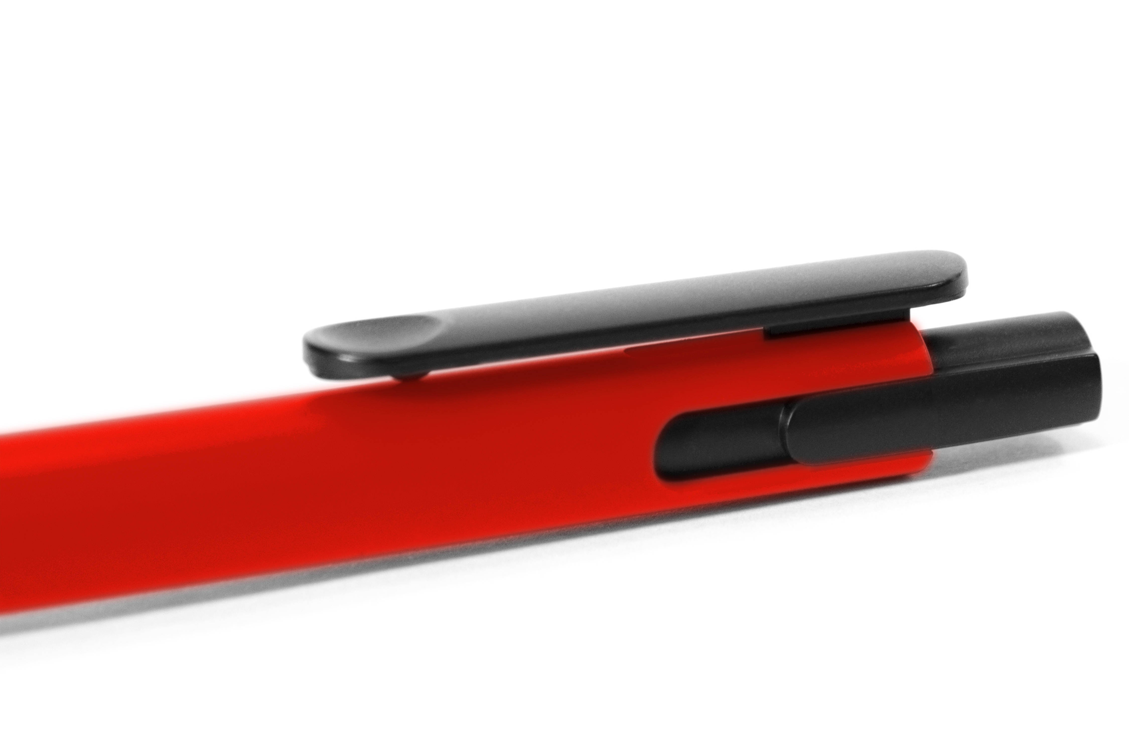 Plástico. Bolígrafo con cuerpo plástico de color. Pulsador, clip y puntera plásticos color negro. Detalle en el clip. Tinta negra.
