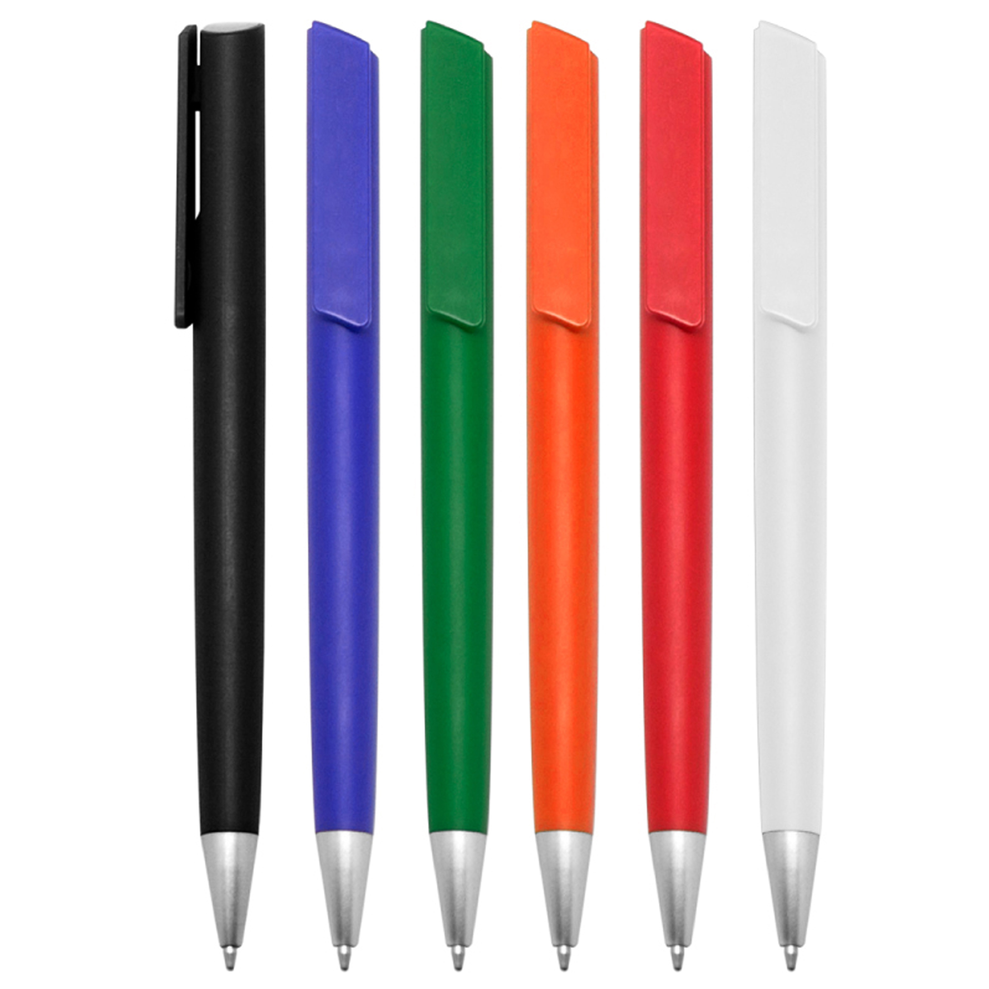 Plástico. Clip y cuerpo del mismo color. Detalles en pulsador y puntera en color plata. Tinta negra.