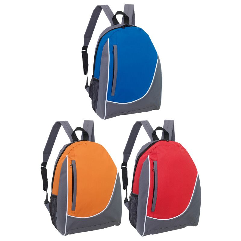 28,5 x 15 x 39,5 cm. Capacidad 14 litros. Aprox. Polyester 600D. Bolsillo frontal con cierre, vivos blancos. Un compartimento principal. Correas regulables herrajes plásticos.