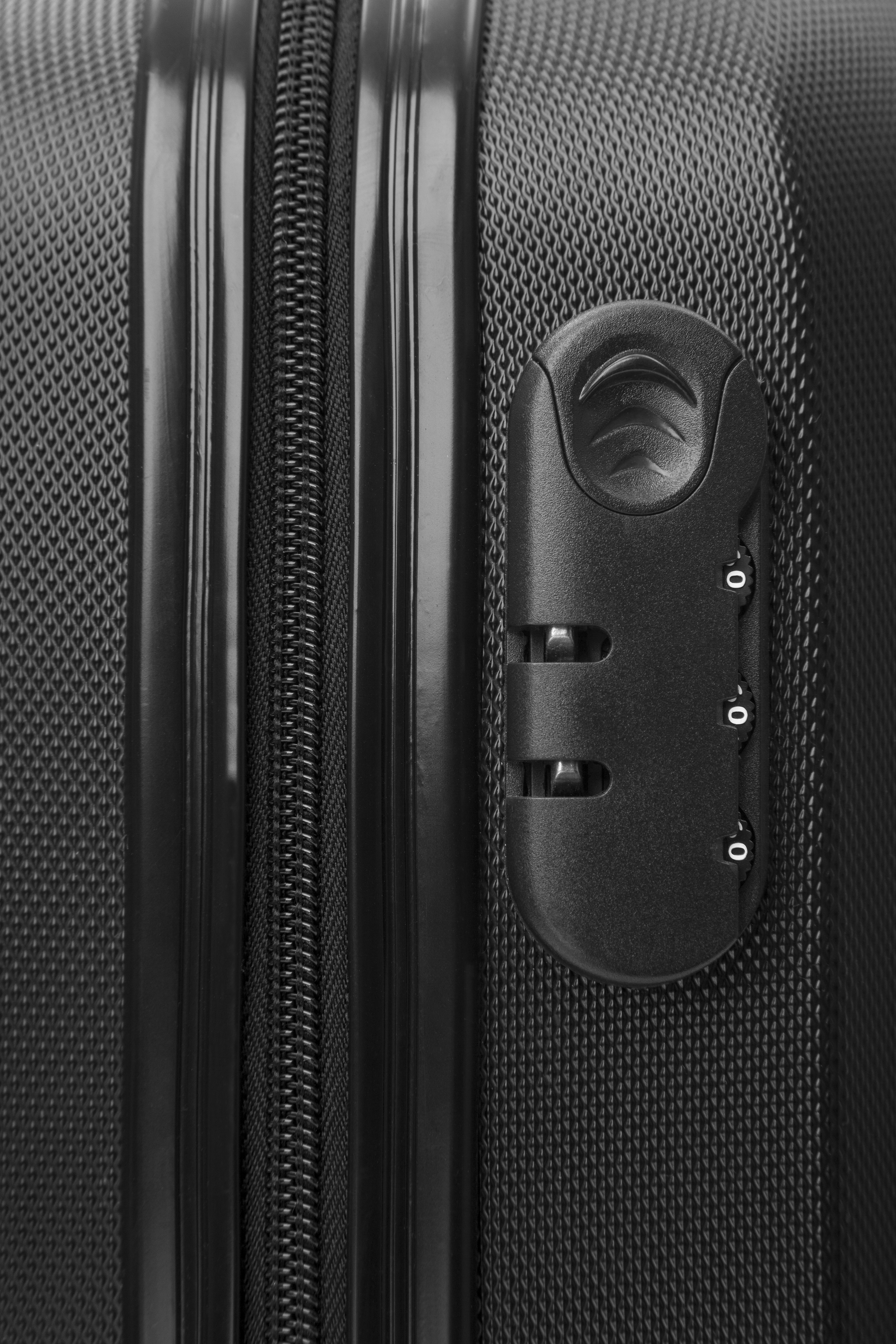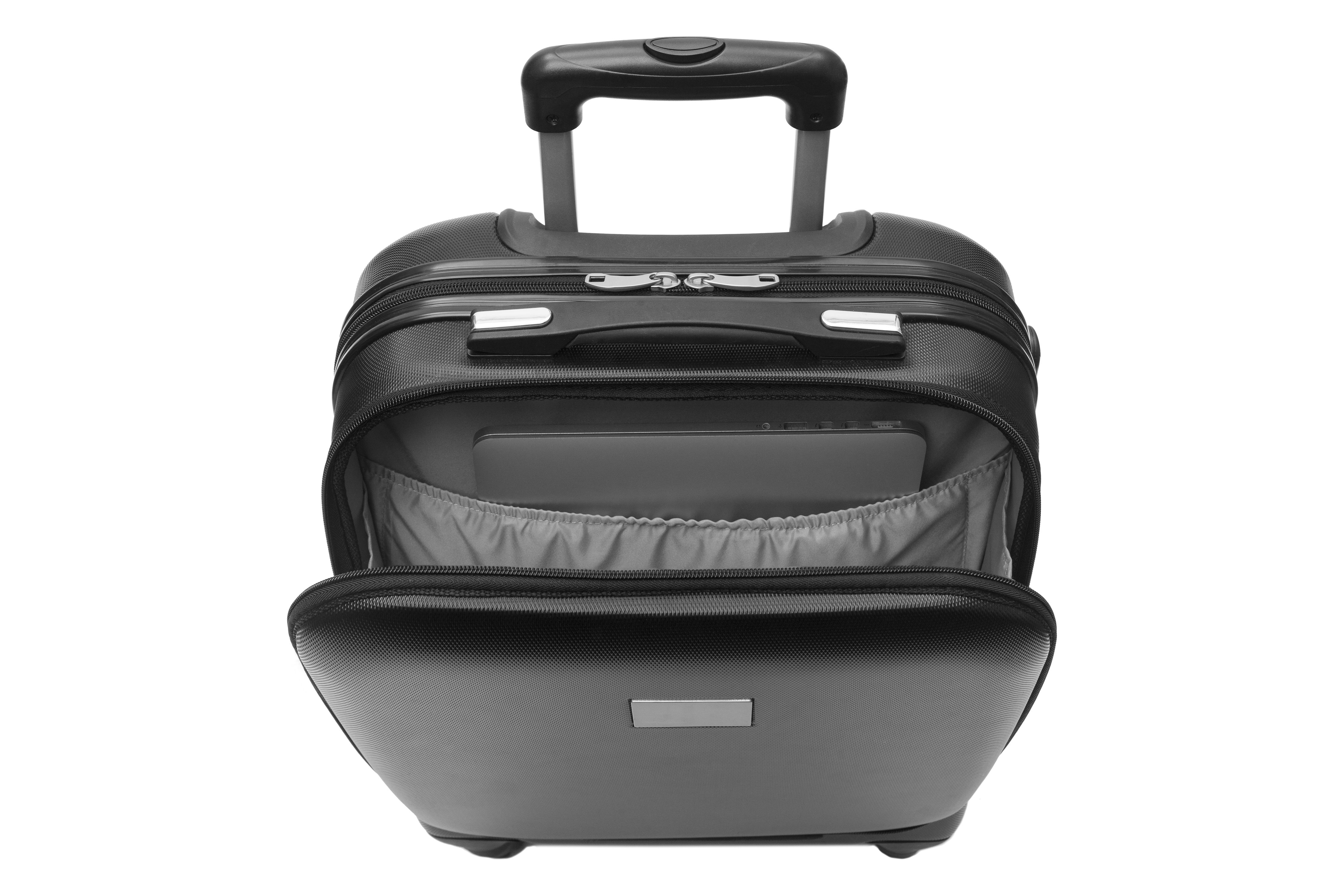 45 x 40 x 20 cm. Capacidad 36 litros. Plástico ABS. 4 ruedas con giro 360°. Manija Trolley extensible hasta 56 cm. 2 posiciones. Candado incluido en el cuerpo de la valija. Un compartimento con espacio acolchonado para guardar notebook, celular y bolígrafos. Compartimento principal con cintas elásticas cruzadas y un bolsillo de red. Placa metálica desmontable de 6 x 4 cm para poder grabar.