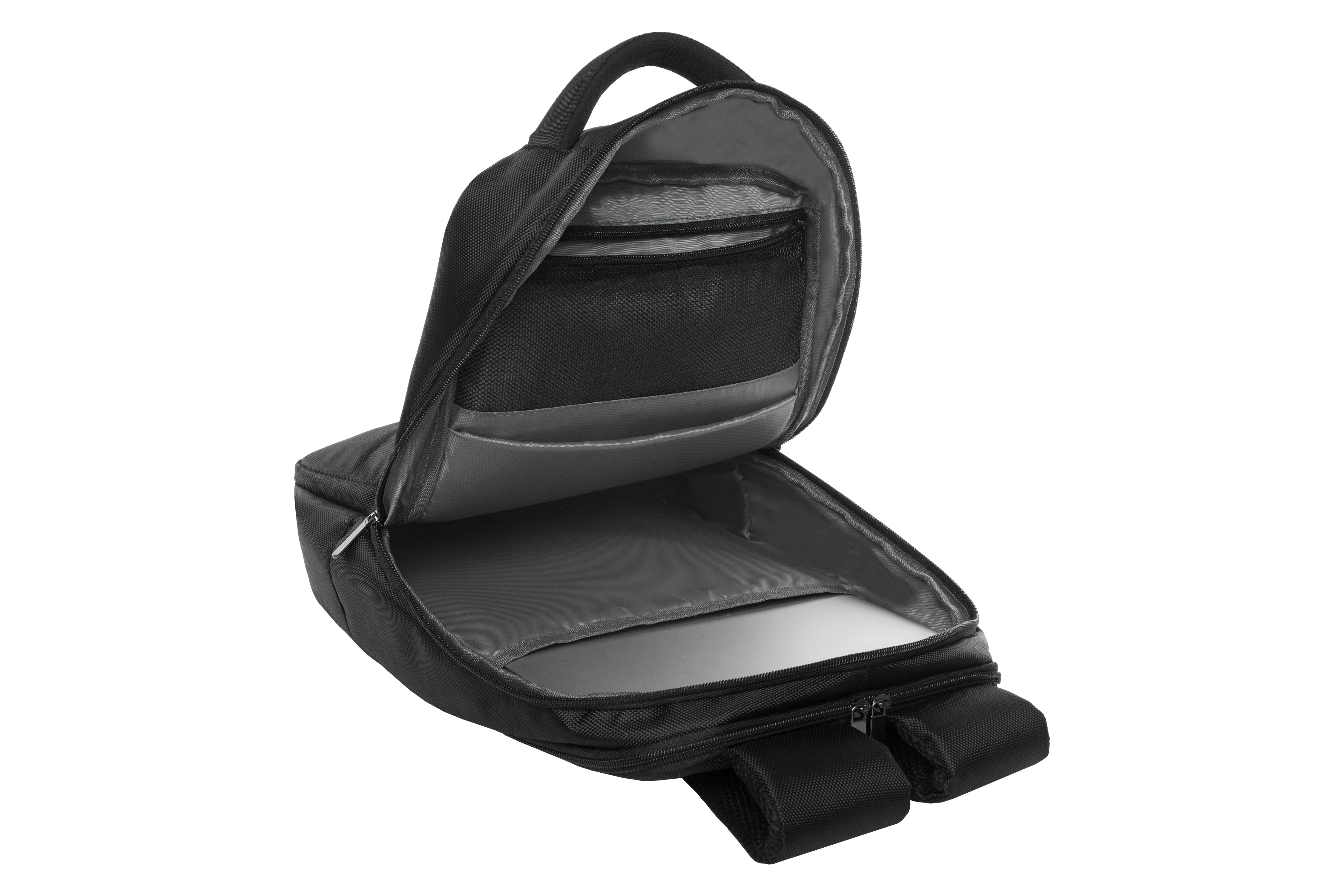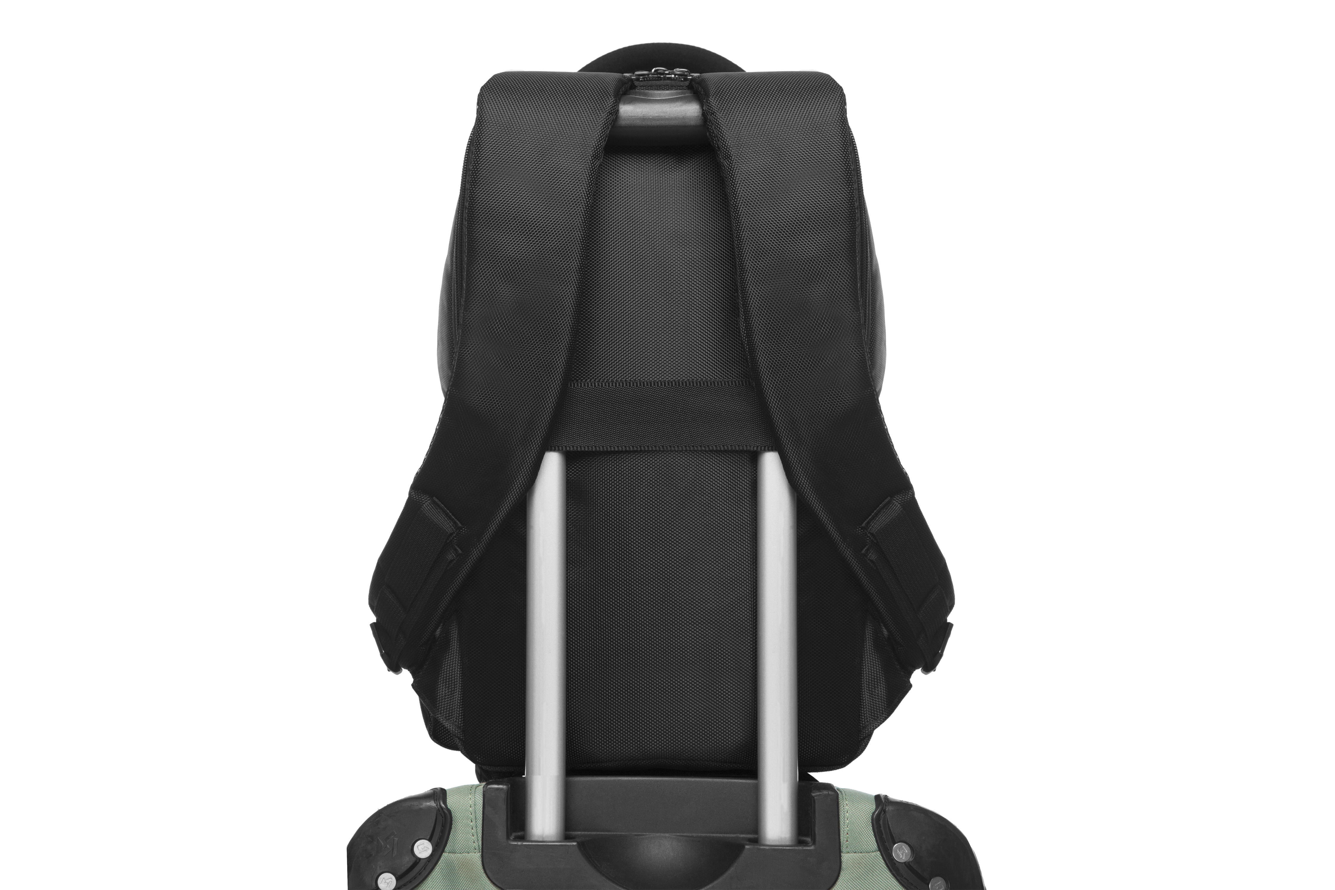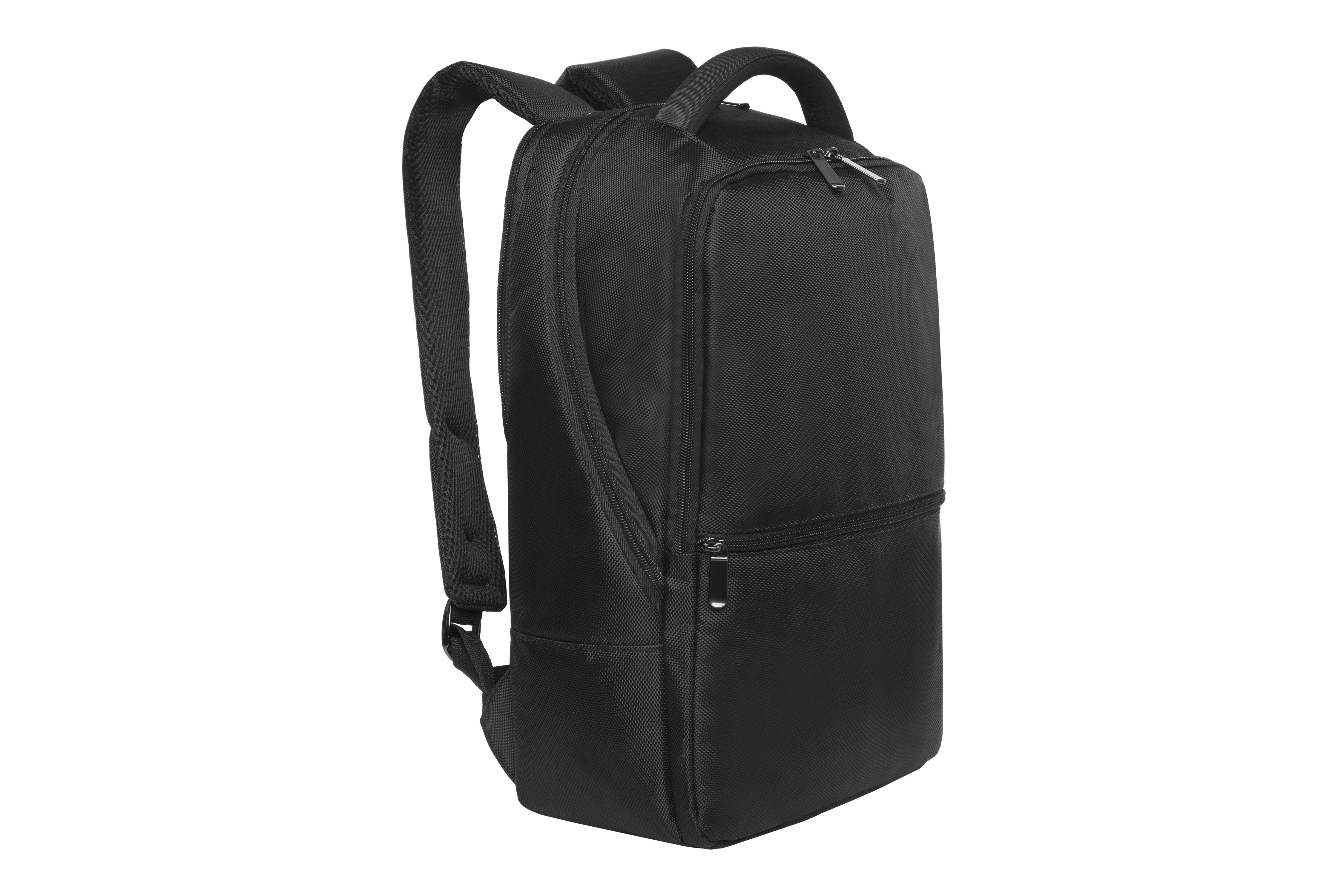 40 x 26 x 12 cm aprox. Capacidad 12 litros. Poliéster 1680D. Mochila portanotebook. Bolsillo frontal con cierre.  Compartimento principal con bolsillo de red con cierre y bolsillo simple y dos divisiones acolchadas para tablet y notebook de hasta 17" y otro compartimento acolchado y amplio. Manija reforzada con detalles en simil cuero. Espalda acolchada con tira para sujetar la mochila en la manija extensible de un equipaje de mano. Correas ajustables acolchadas con red que permite la ventilación. Tiradores de cierres metálicos y hebillas de ajustes metálicas.
