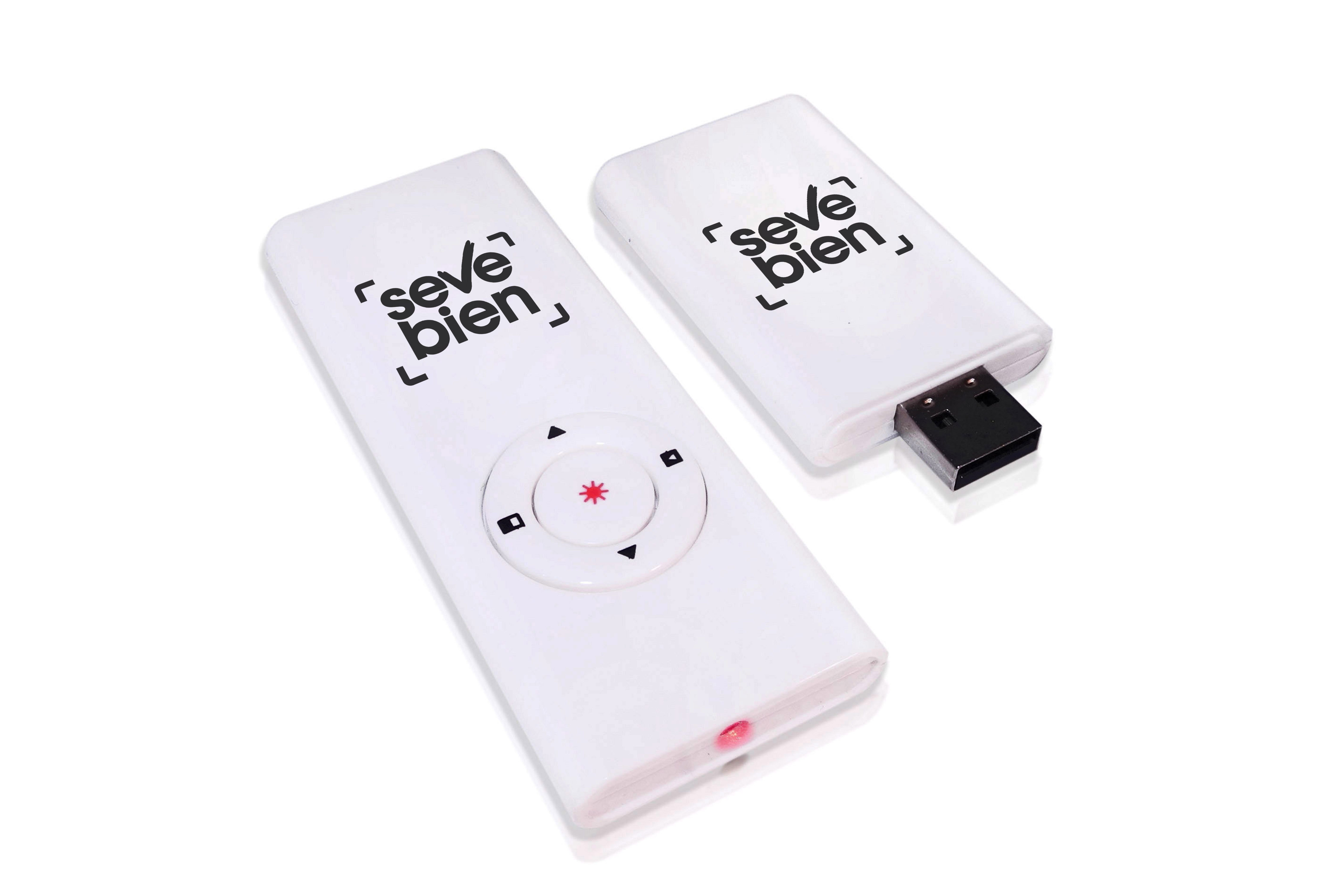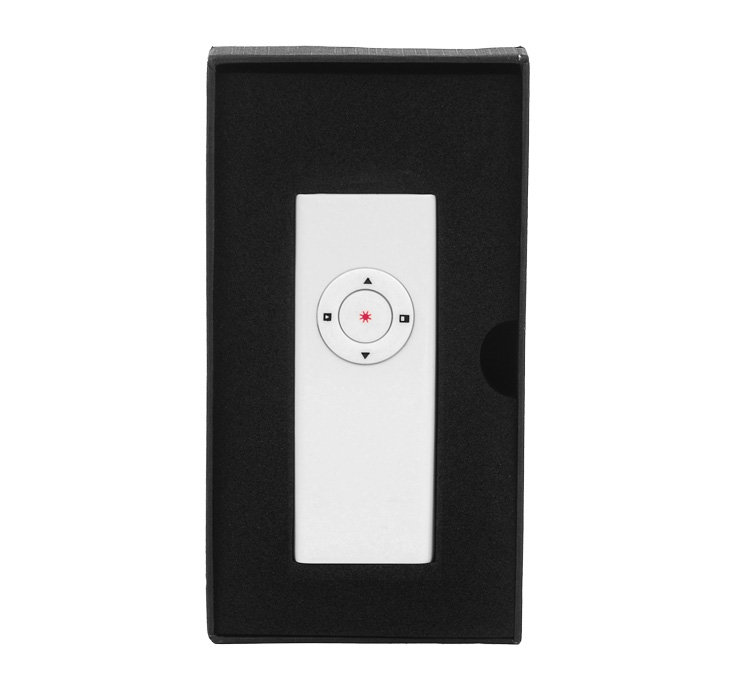 Plástico. 8,7 x 3,3 x 0,9 cm.Controlador de diapositivas para power point. Transmisor USB para conexión remota. Puntero laser. Funciona con una pila de botón incluida. IMPORTANTE: NO mezclar dispositivos pues están codificados. Al momento de personalizar debe imprimir el par y así mismo empacar. Presentación en caja de regalo.