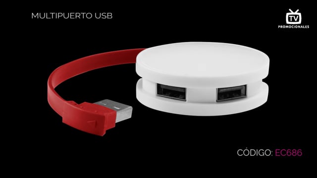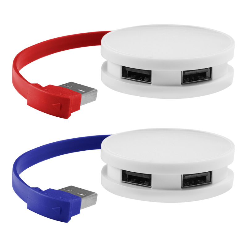 Plástico. Ø 5 cm. Multipuertos. Cuatro puertos USB esto permite conectar varios dispositivos al mismo tiempo. Longitud de cable 14,5 cm. Area de impresión 4 cm. Presentación en caja de regalo.
