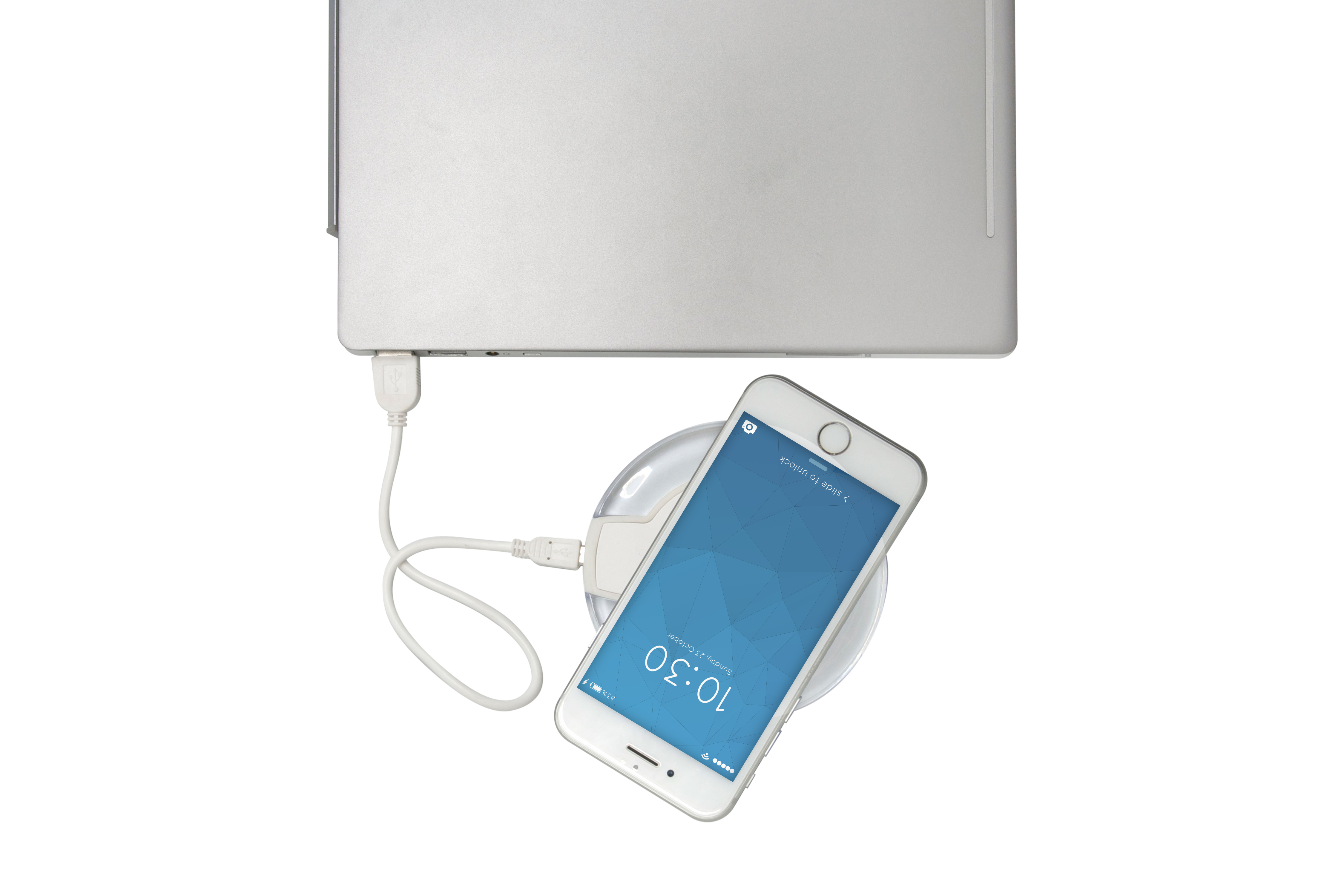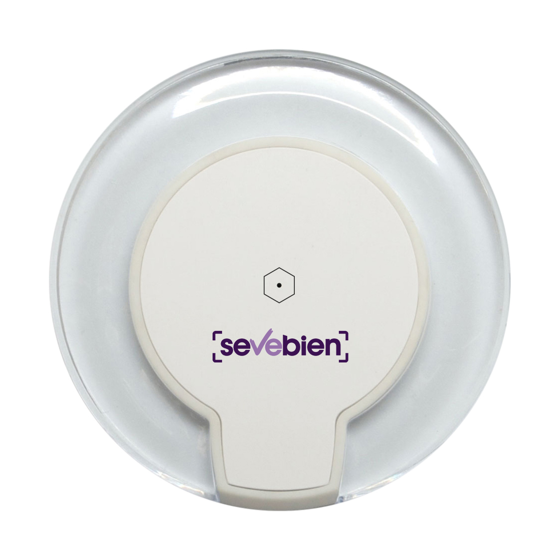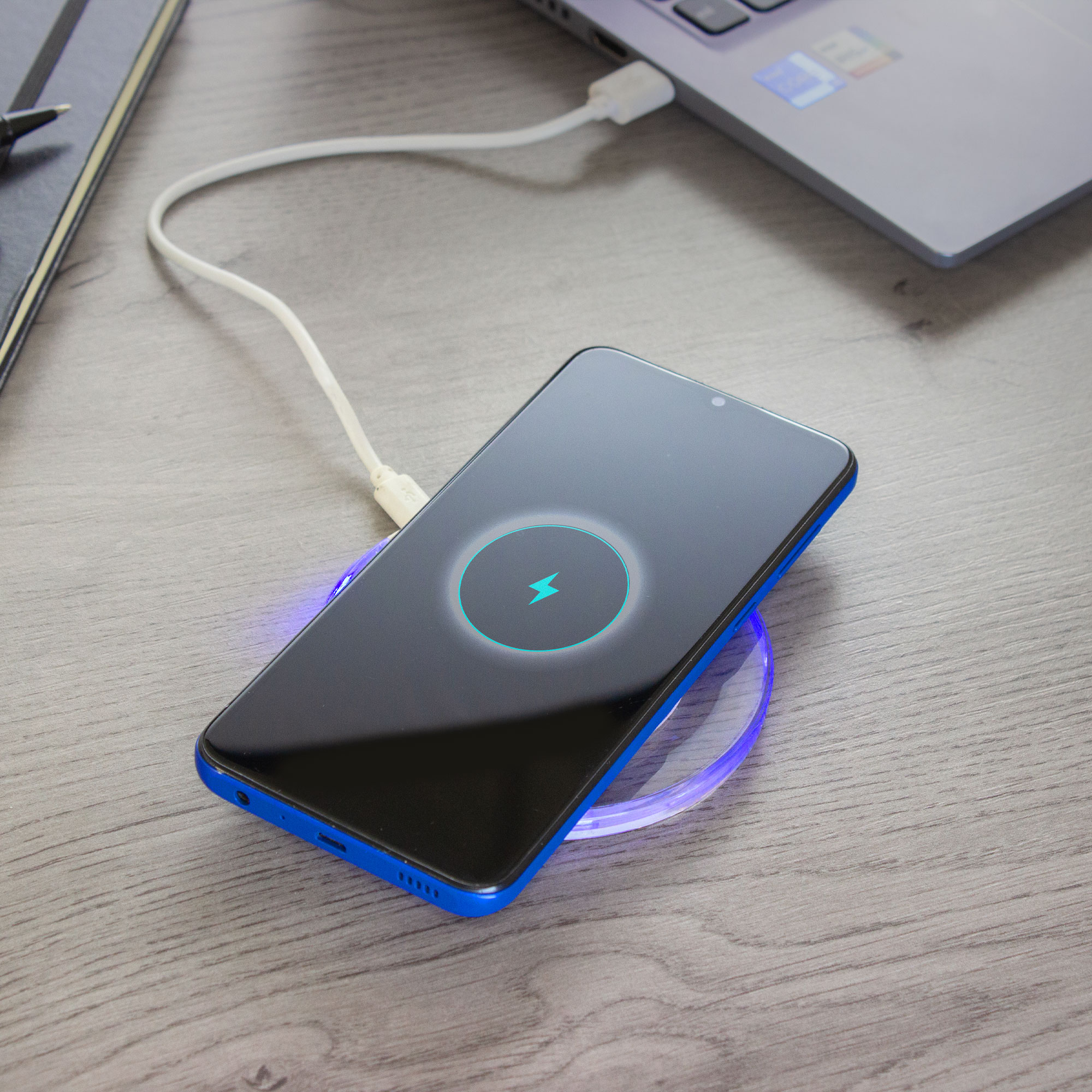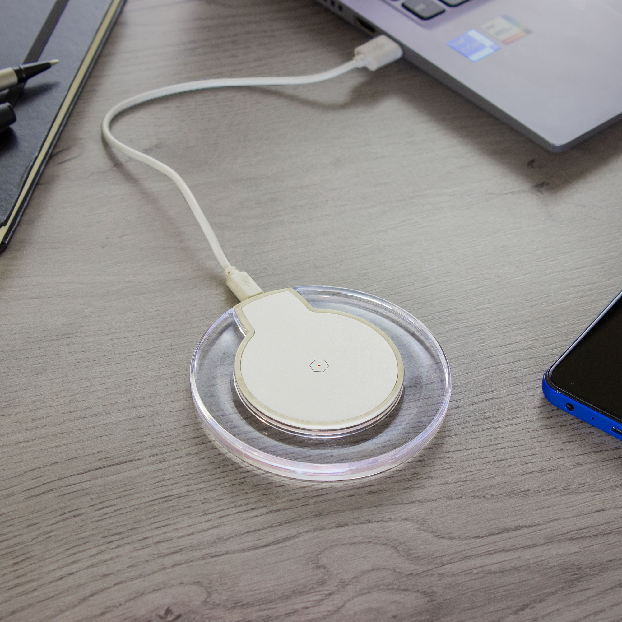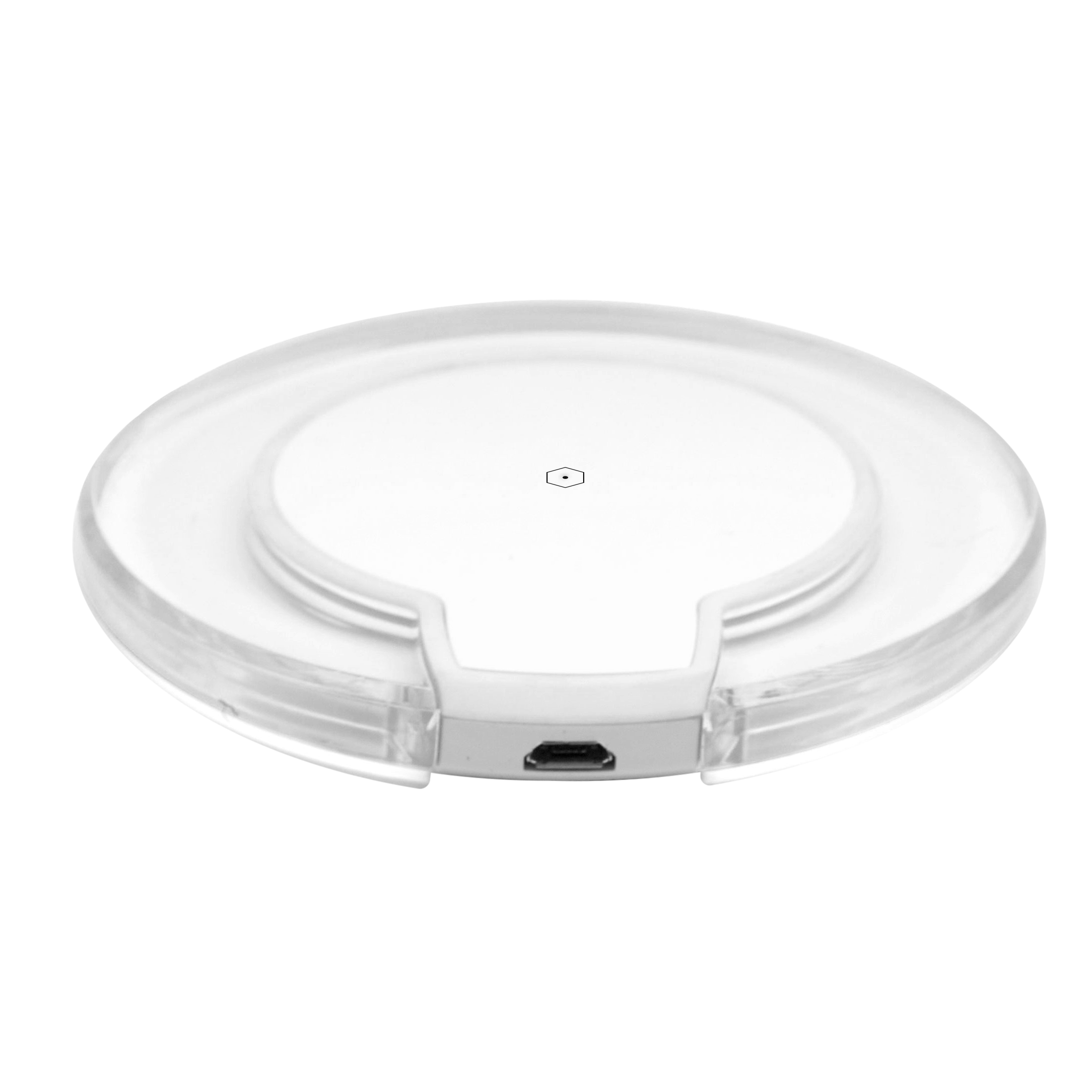 Plástico. Ø 10 x 1 cm. Cargador inalambrico, apoyando el celular comienza a cargar, es necesario que se encuentre enchufada para que funcione. Potencia: 5W. Entrada mini USB. Es importante sacar la funda para facilitar la carga. Presentación en caja de regalo.