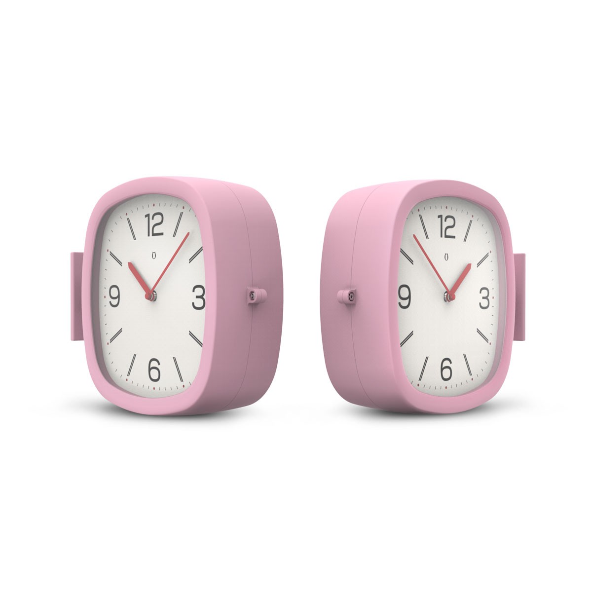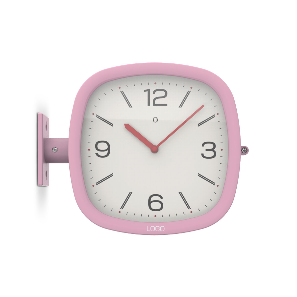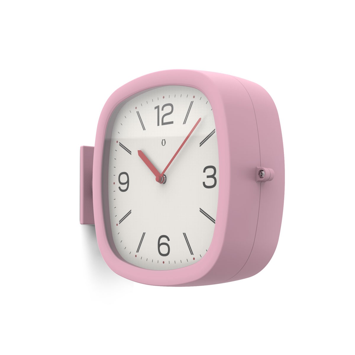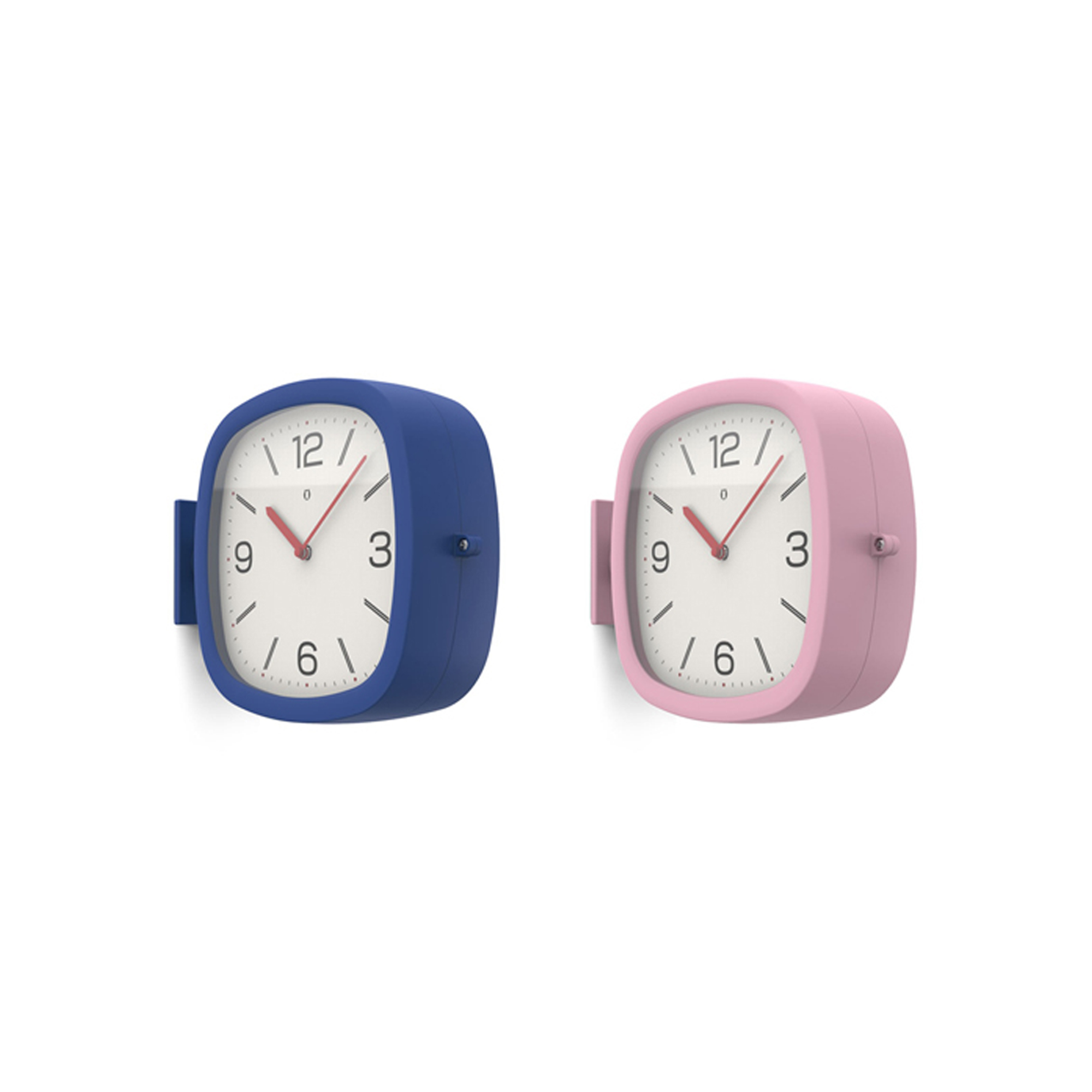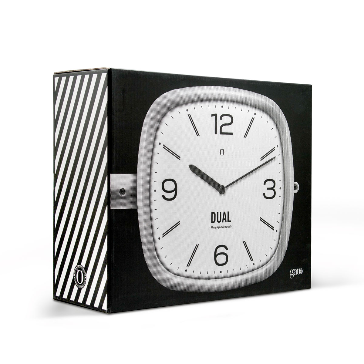 30 x 23,5 x 8 cm. Poliestireno de alto impacto + ABS. Reloj bifaz de pared. ¡Dos relojes en uno! Permite definir husos horarios diferentes y viene con soporte para amurar a la pared.
