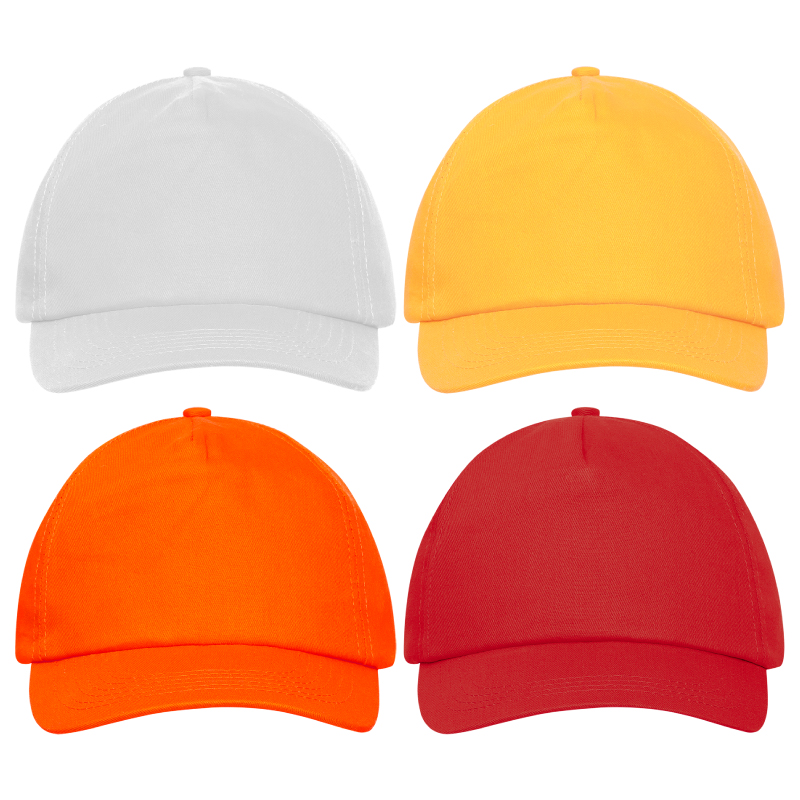 Algodón. 5 paneles con parte frontal reforzada, 2 ojales bordados, botón y cierre ajustable de velcro.