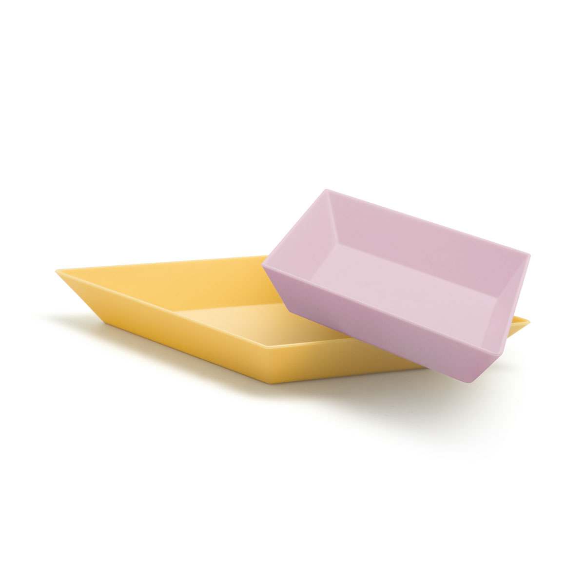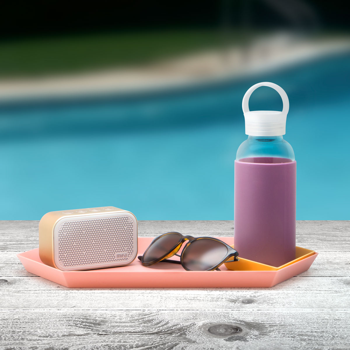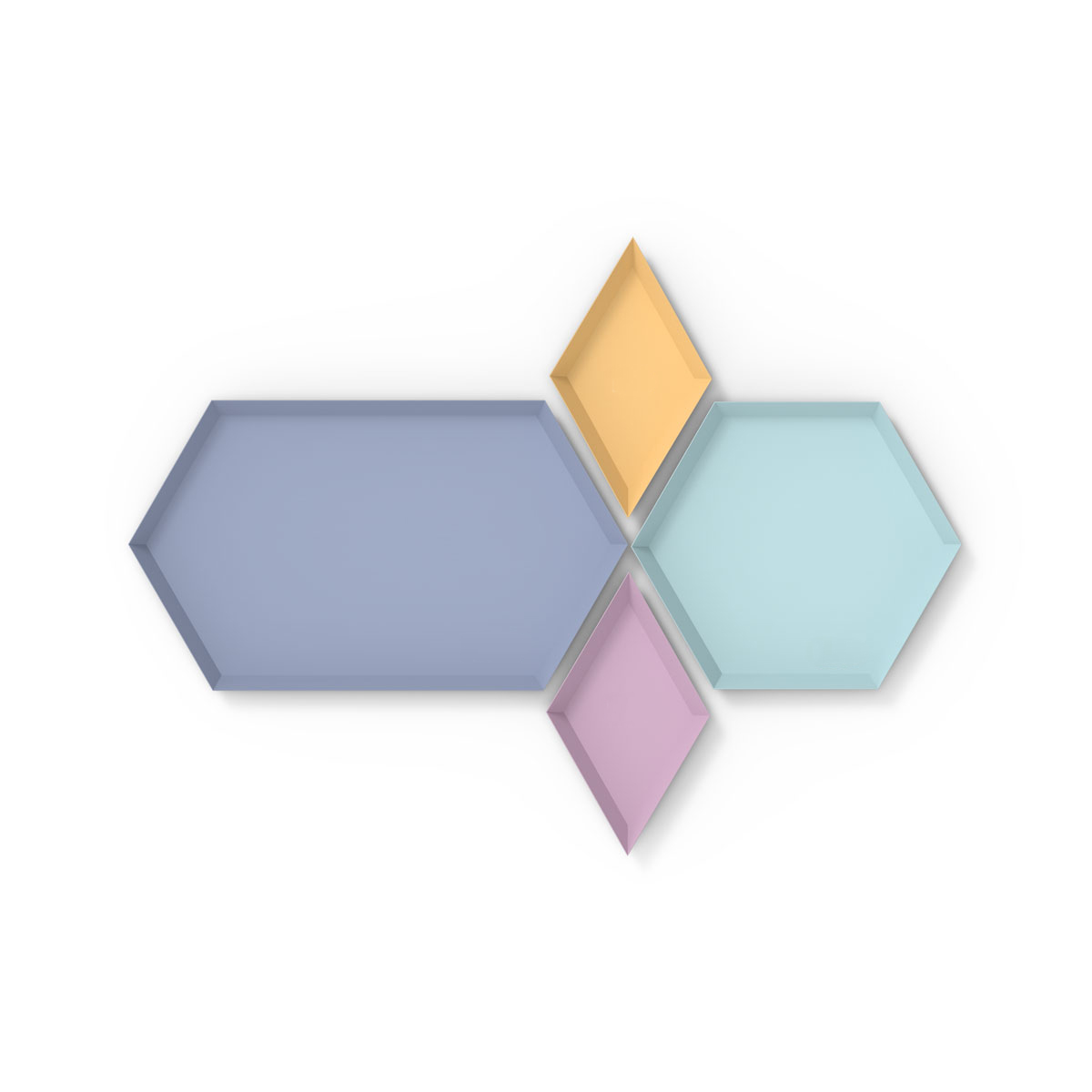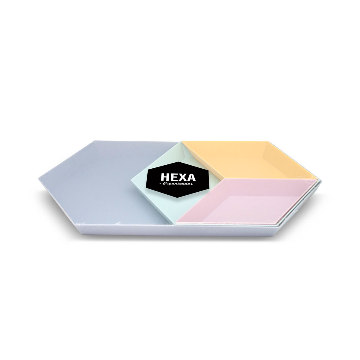 2 módulos de 19 x 11 cm, 1 módulo de 29 x 22 cm y 1 módulo de 33 x 19 cm. Plástico. Organizador de escritorio con 4 bandejas modulables de distintos tamaños y colores.