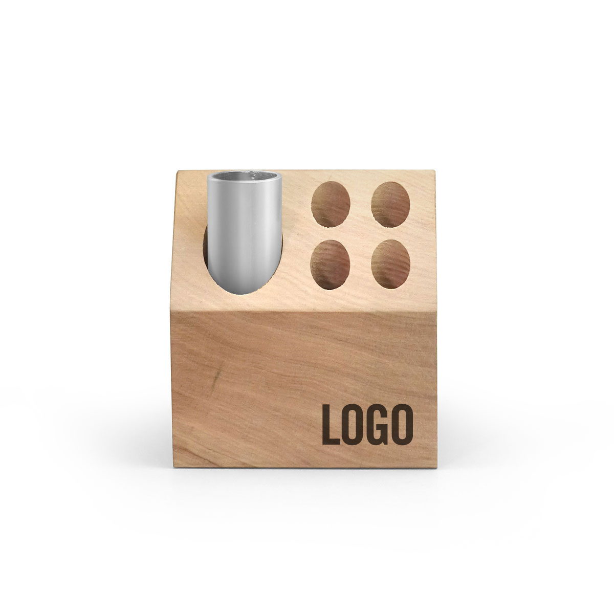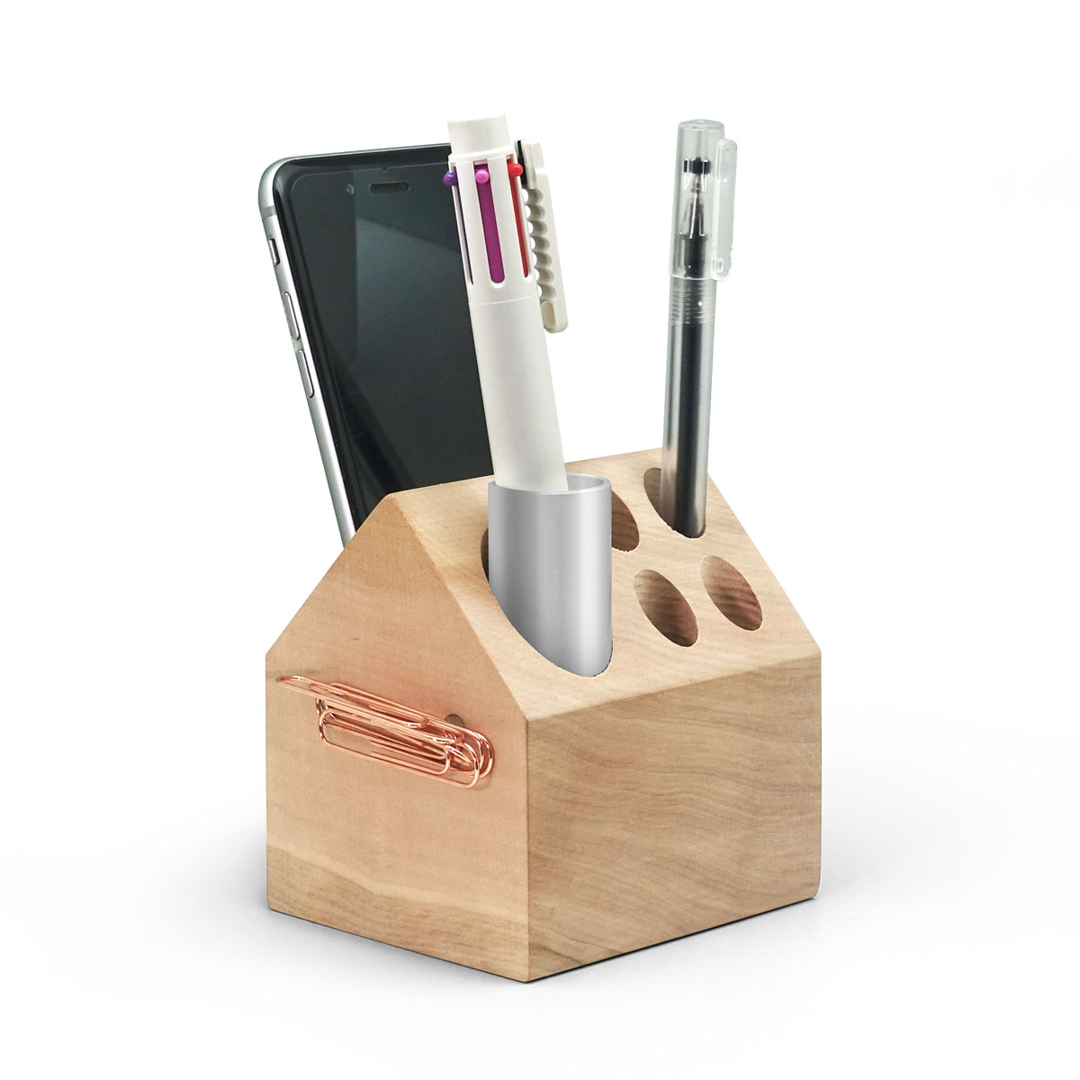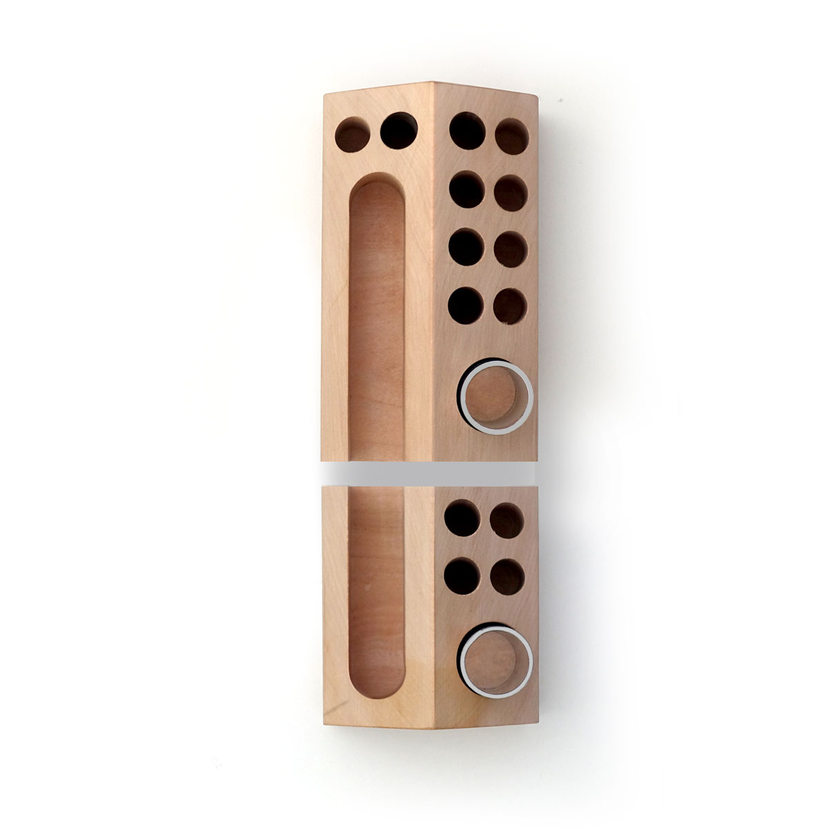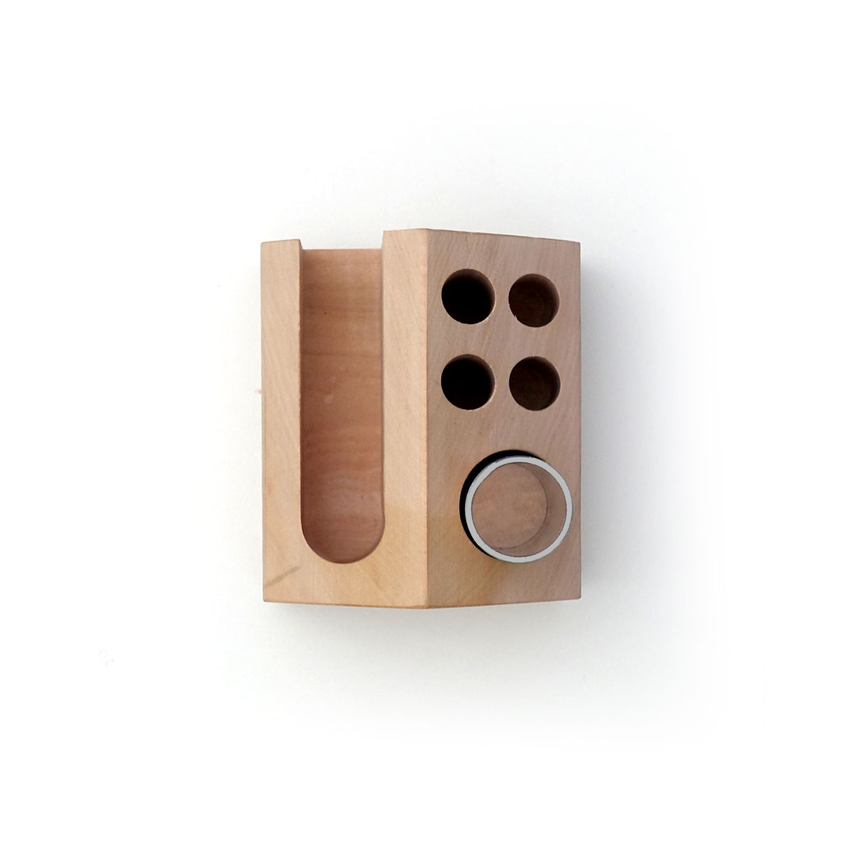 Pieza de madera imantada para combinar. Multiples ranuras multipropósito para usar como lapicero, porta celular, porta tarjetas o para organizar post-its, papeles, banditas elásticas, clips, ganchos y otros objetos de escritorio. Presentación en caja de regalo.
