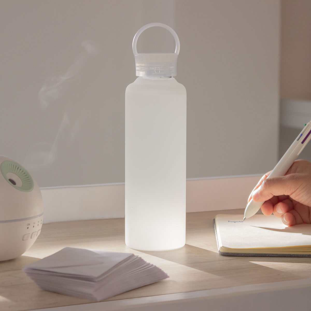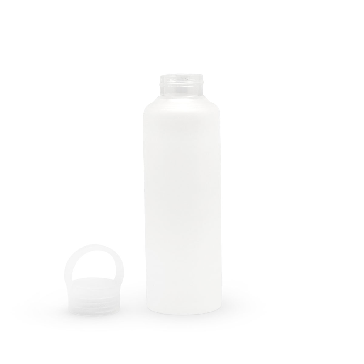 Ø 6,5 x 24 cm. Capacidad 500ml. Vidrio borosilicato terminación frost. Práctica, reutilizable y con más resistencia a los golpes (no irrompible!) ya que es de vidrio de borosilicato. Boca ancha. Su tapa es a rosca, antiderrame y con manija de agarre. Presentación en caja de regalo.