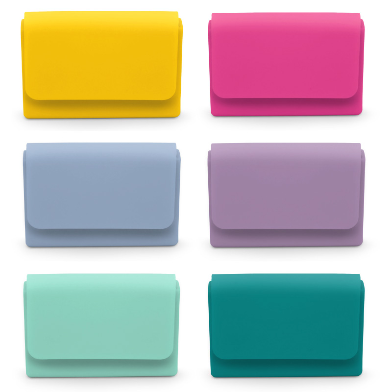 9,5 x 6,5 x 1,5 cm. Silicona. Portadocumentos de silicona. Para guardar documentos, tarjetas o usarlo como billetera o monedero. Tapa plegable, folio divisor y cierre con imán. Presentación en caja de regalo.