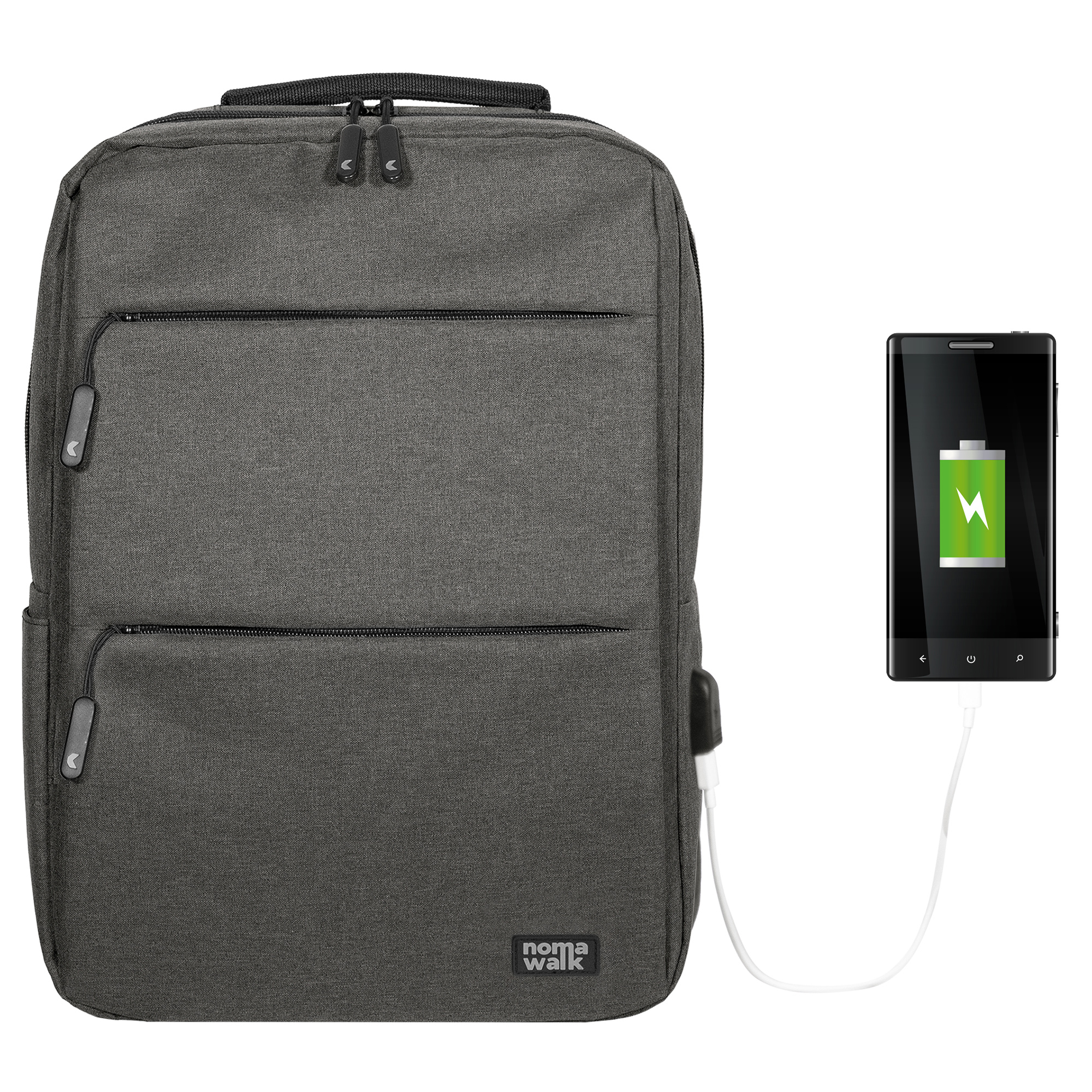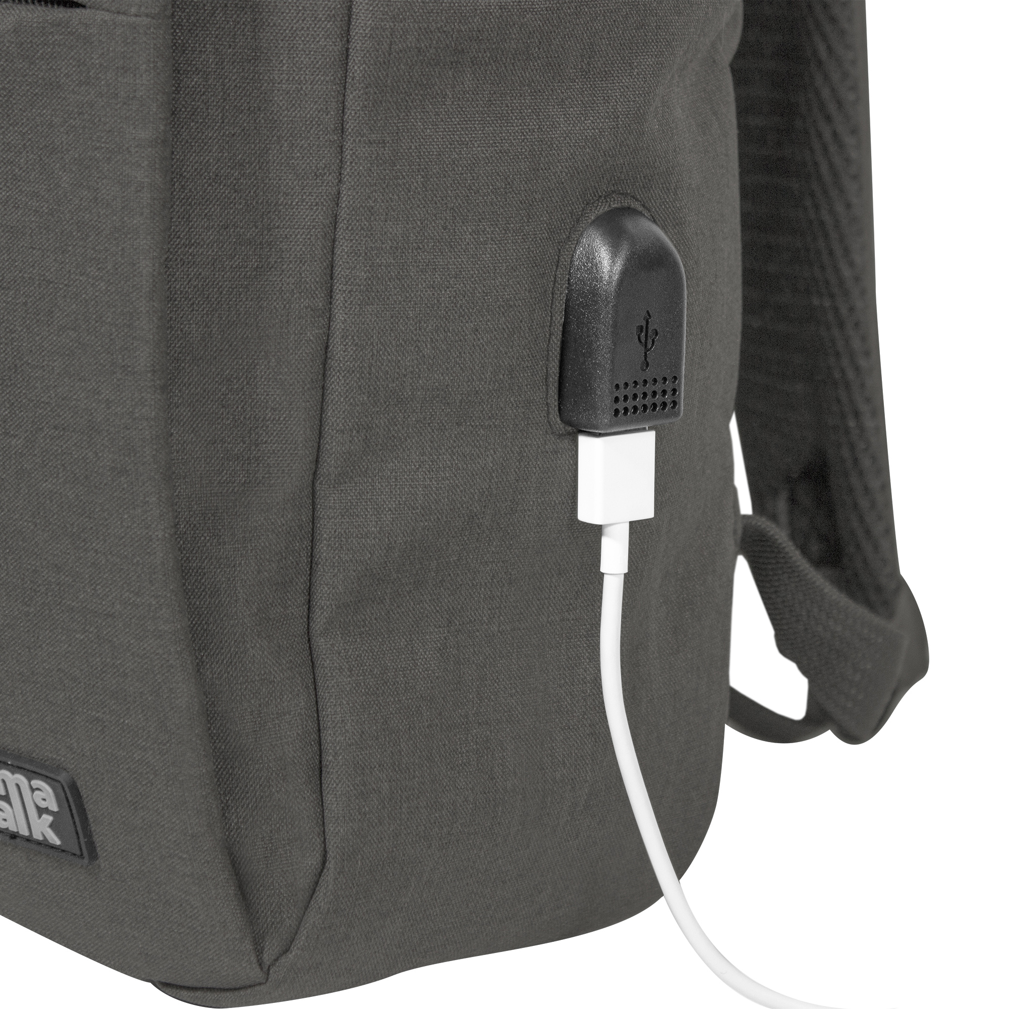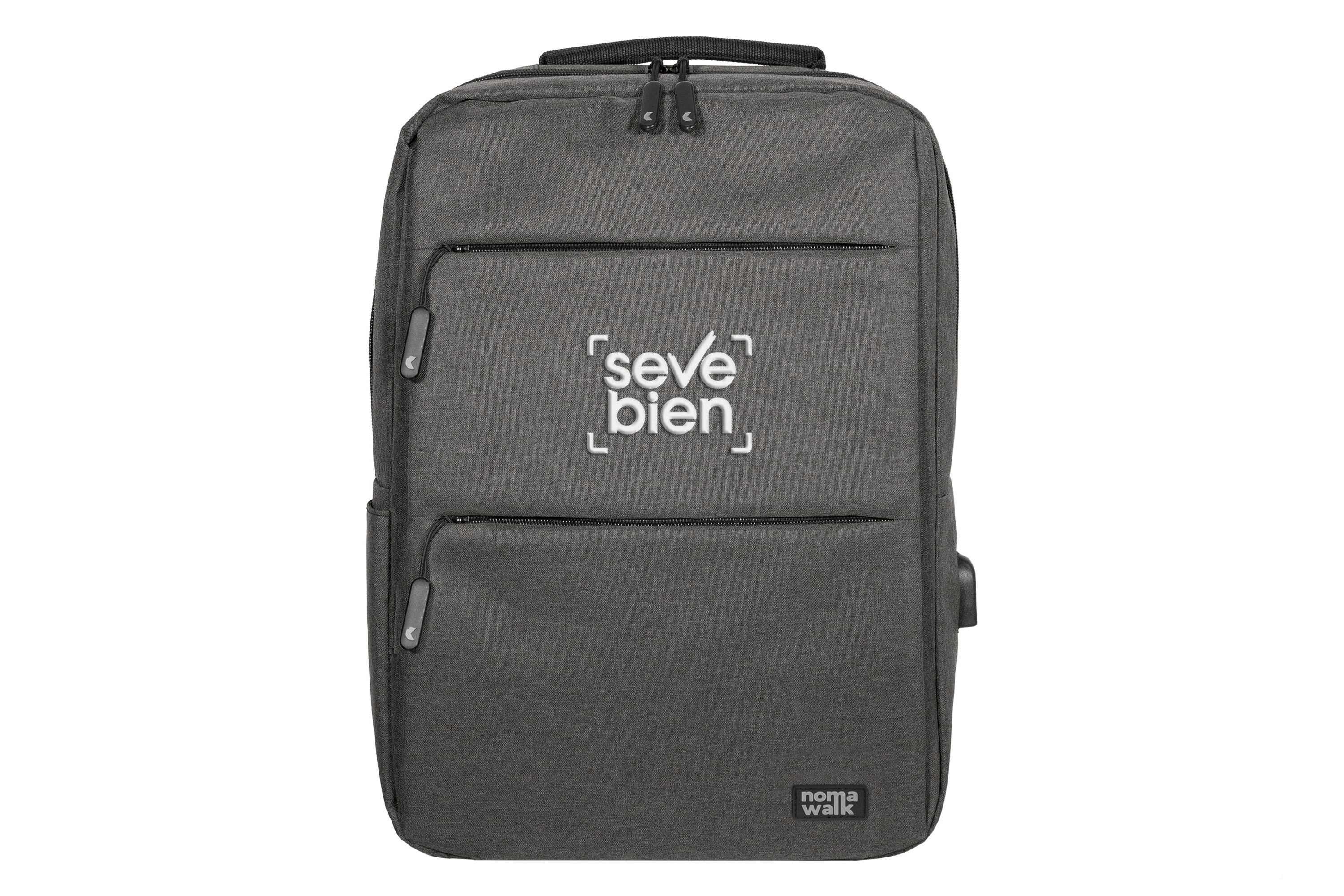 28 x 42 x 12 cm. Capacidad 14 litros. Polyester Wulong 300D Hidrofugo. Compartimento principal con cierre y bolsillo portanotebook para 16¨y bolsillos organizadores de accesorios. Dos bolsillos frontales con cierre y un bolsillo lateral. Puerto USB exterior con conector interior para bateria. Correas ajustables y espalda acolchadas. Tiradores de cierre engomados. Presencia de marca al frente y en su interior.