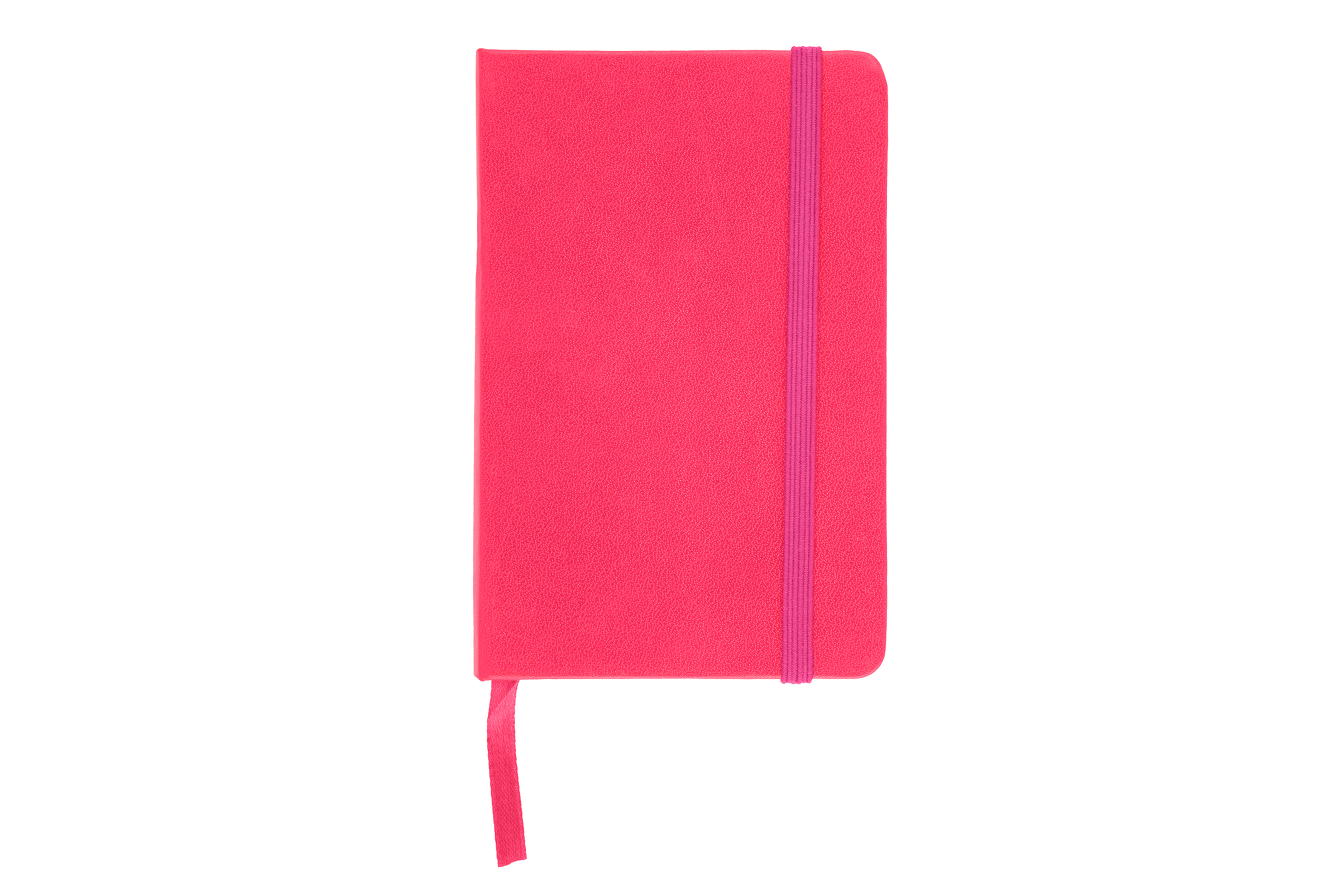 Cartón. 9 x 14 x 1,5 cm. Contiene 80 hojas lisas y separador en tela. Posee cierre con banda elástica. Amplia área de impresión.