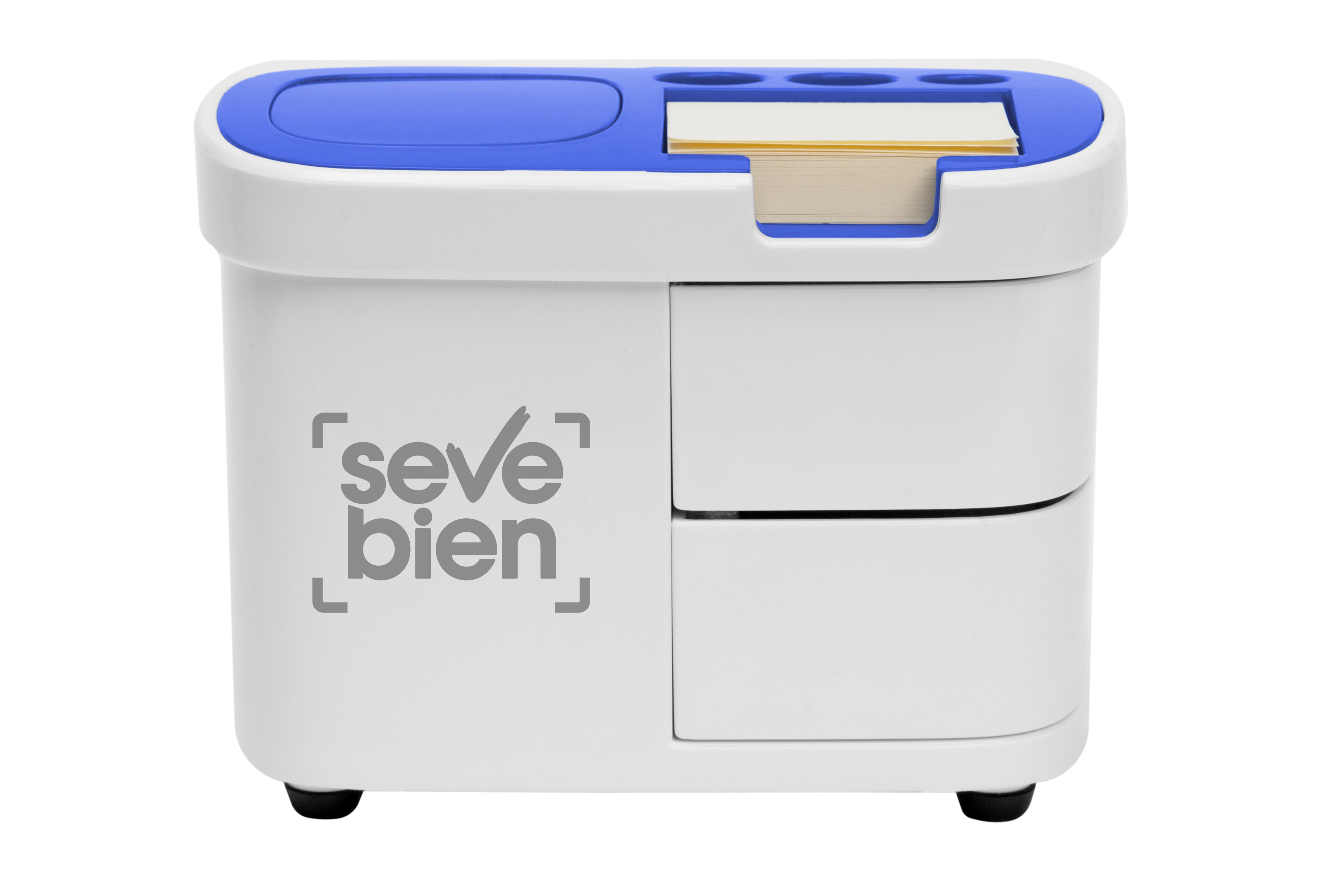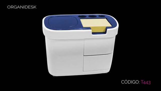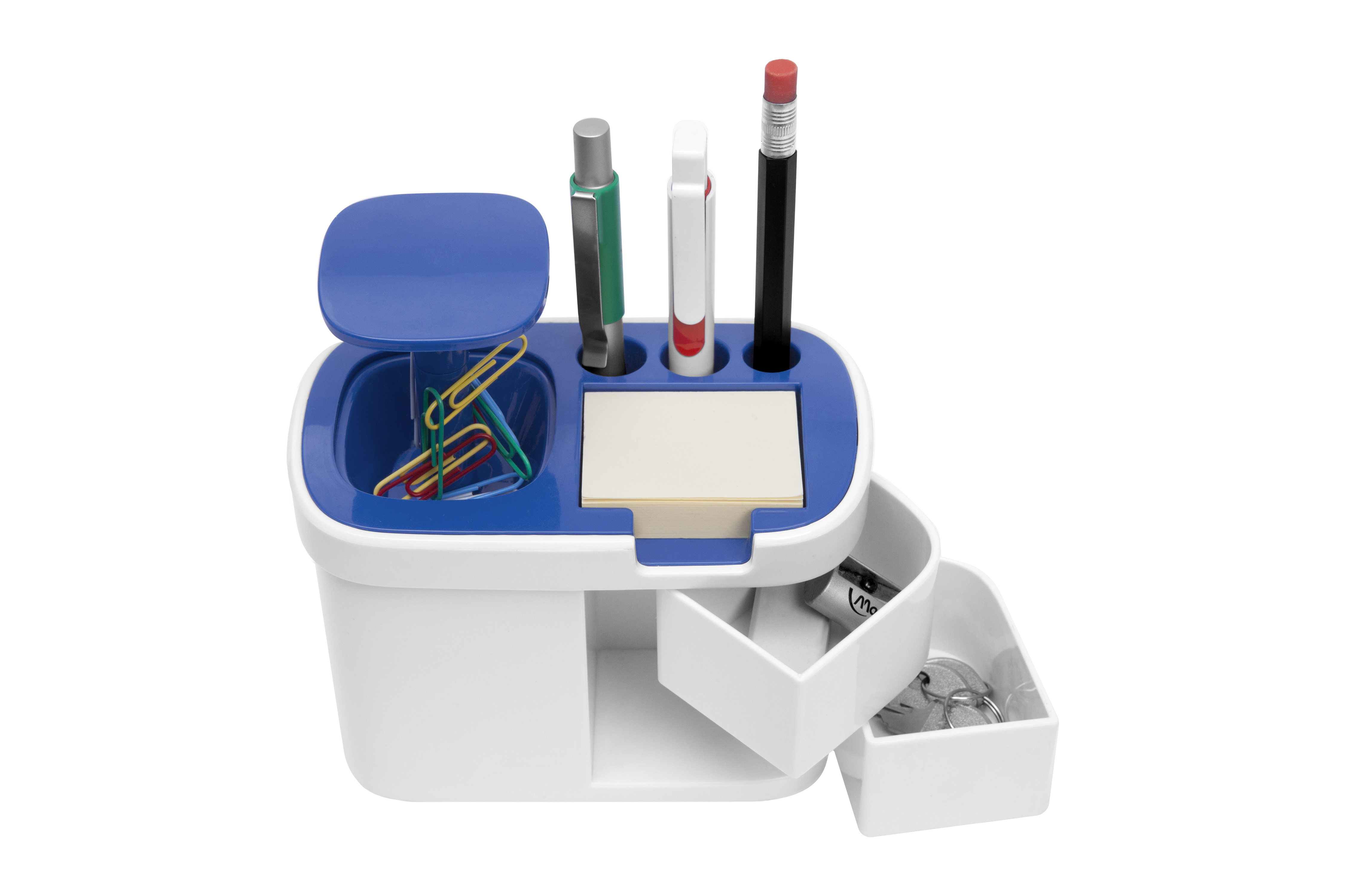 Plástico. 13,5 x 8,5 x 9 cm. Organizador para escritorio. Cuenta en la parte superior con espacio para tres bolígrafos, notas autoadhesivas y un botón pulsador que sirve para guardar clips. Clips de colores incluidos. En la parte inferior dos cajones.