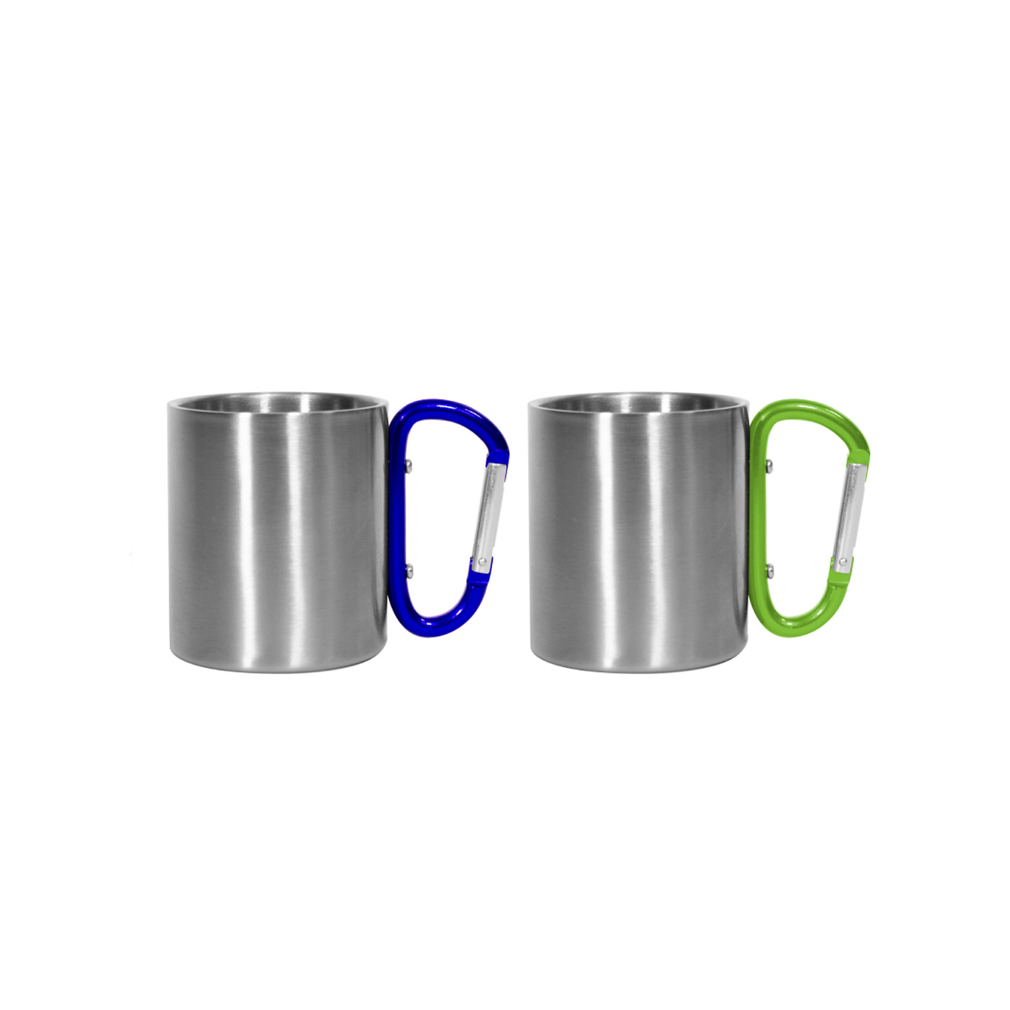 Ø 7 x 7,8 cm. Capacidad 220 ml. Acero inoxidable. Mug doble pared con Mosquetón. Interior de acero 304 y exterior de acero 201. Asa carabinero de aluminio con diferentes opciones de color. Mantiene las bebidas frías y calientes por más tiempo. Te acompaña donde vayas, ideal para camping o cualquier actividad al aire libre.