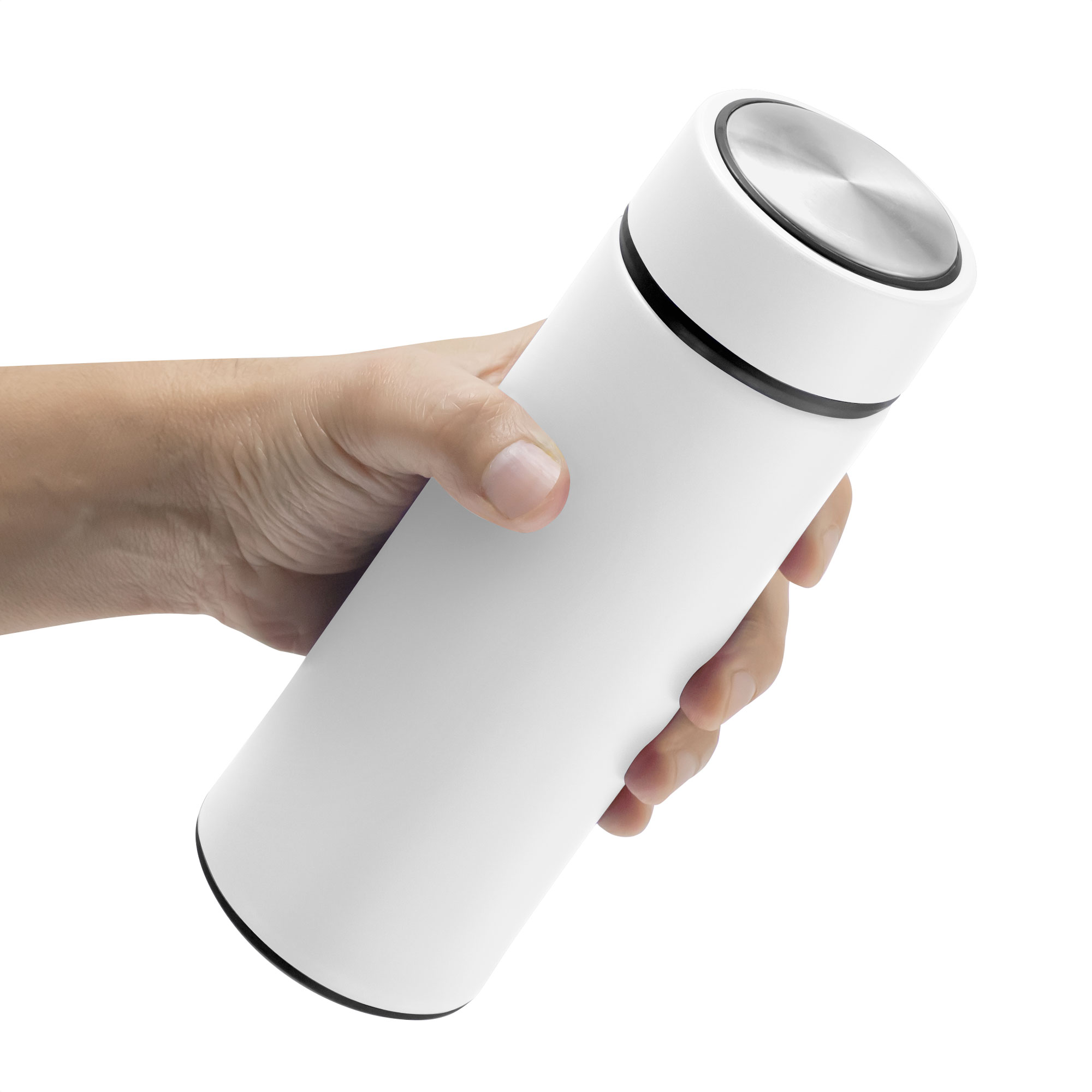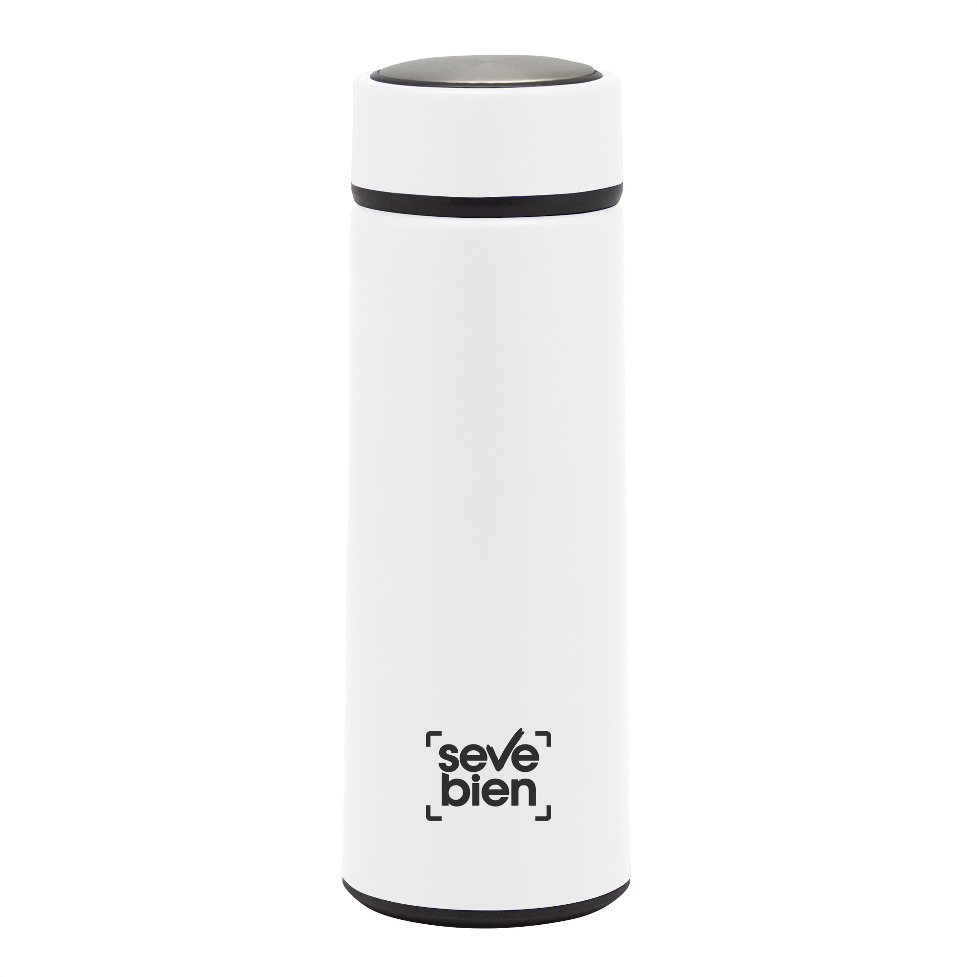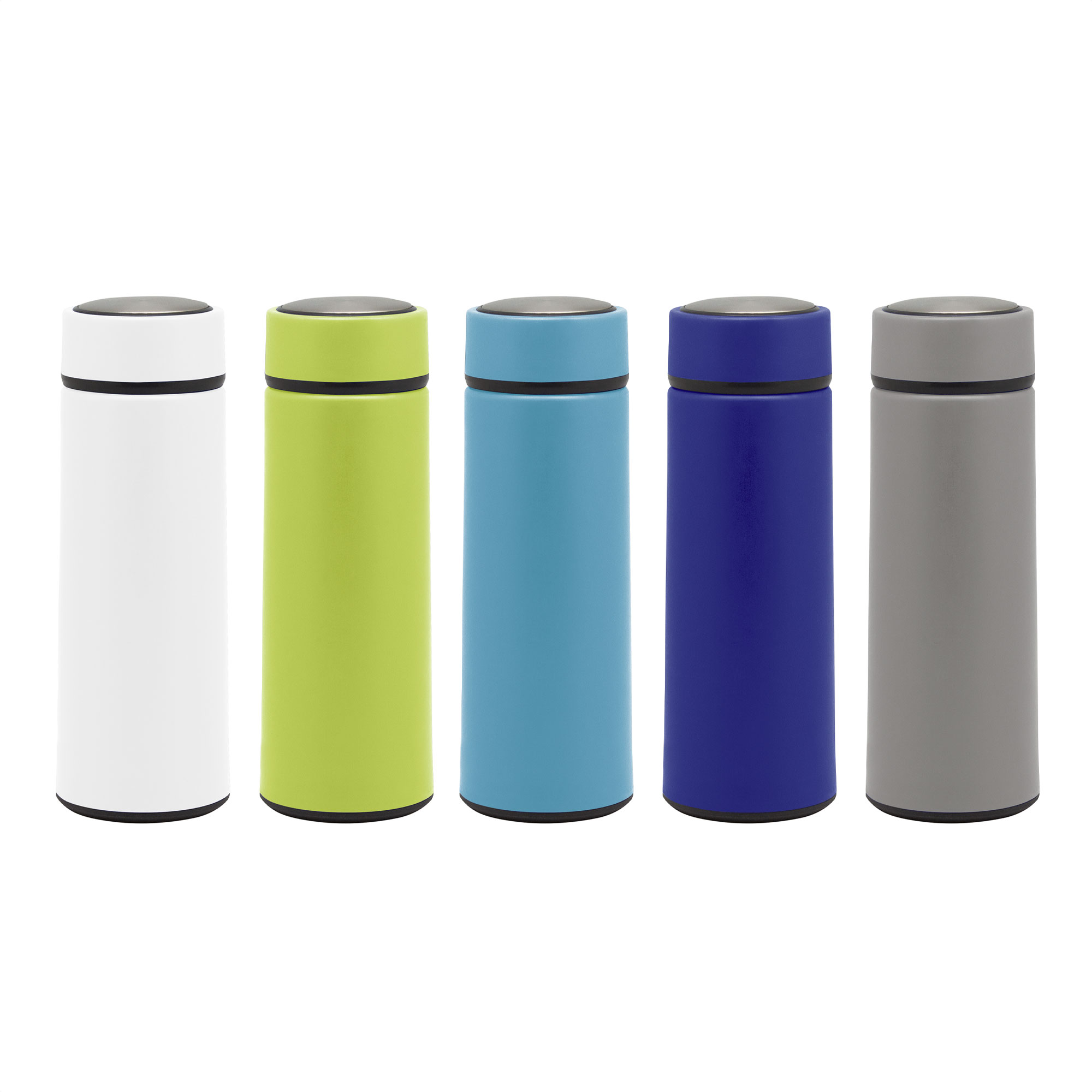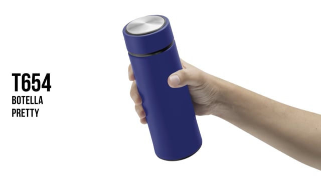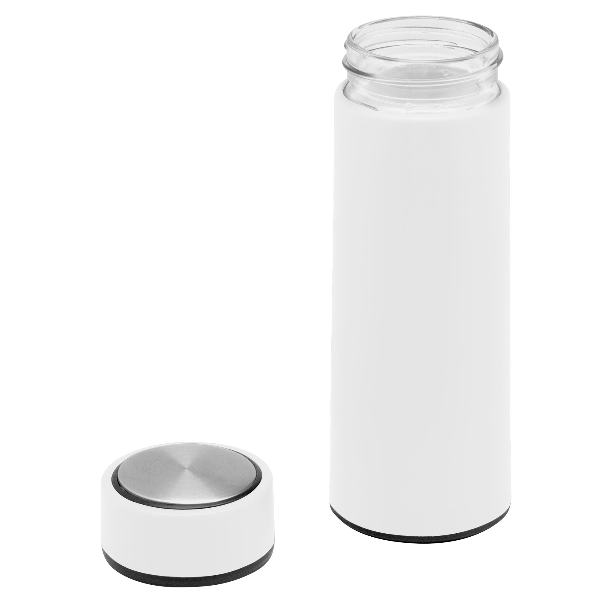 Ø 7 x 19 cm. Capacidad 450 ml. Vidrio y polipropileno. Botella de vidrio con recubrimiento plástico. Tapa a rosca con detalles metálicos. Presentación en caja de regalo.