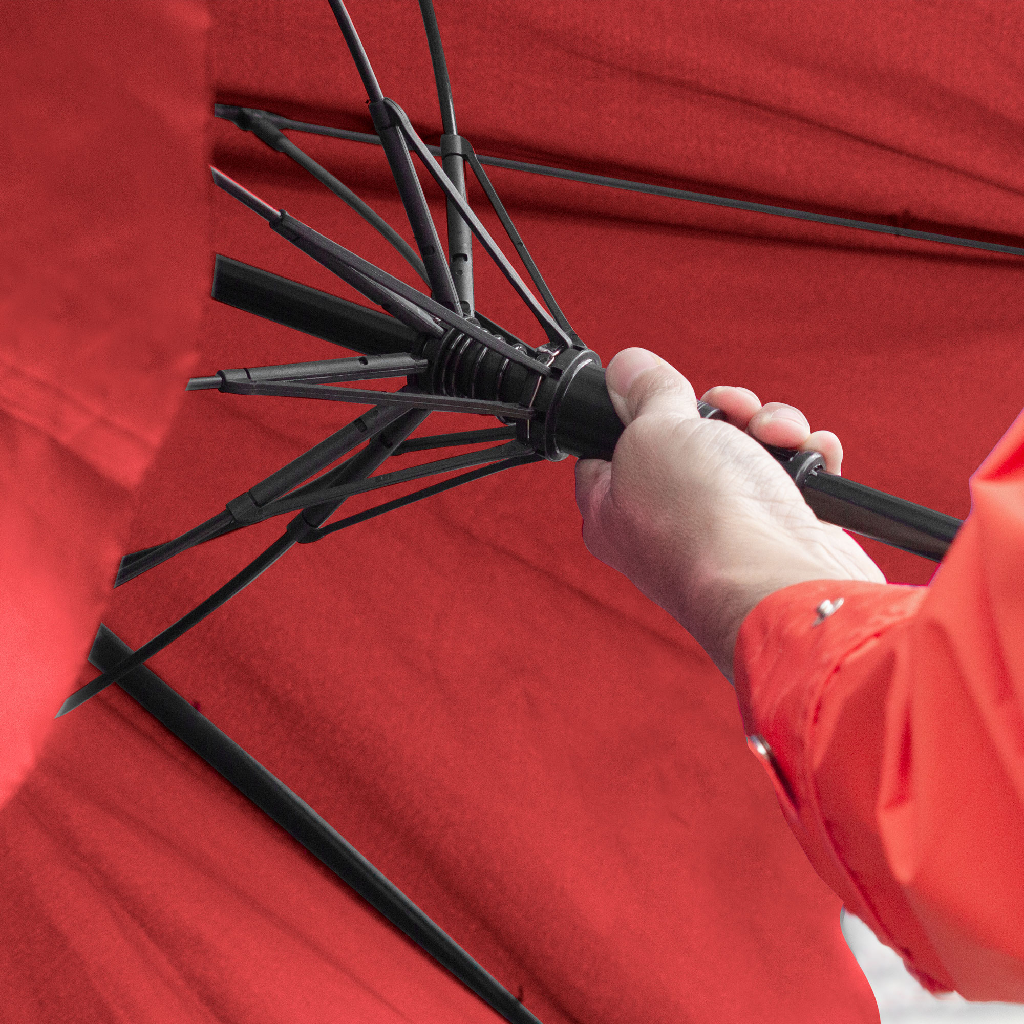 Ø 120 cm. 8 gajos. Ancho gajo 45 cm. Largo total 93 cm. Poliéster pongee, metal y EVA. Paraguas APERTURA AUTOMÁTICA Y CIERRE MANUAL. Eje metálico, varillas en fibra de vidrio , punta niquelada, mango en EVA. Botón a presión. Cierre con correa de velcro.