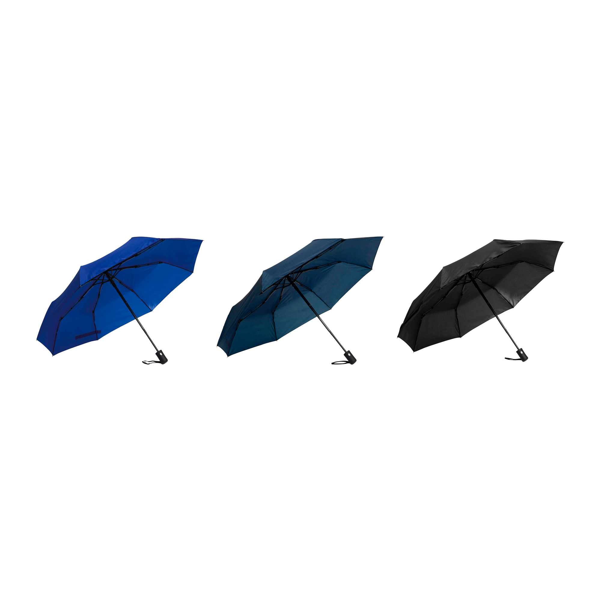 Paraguas APERTURA Y CIERRE AUTOMÁTICO. Eje y varillas metálicas. Mango de plástico engomado negro con correa cordón color negro. Botón a presión. Cierre con correa de velcro.